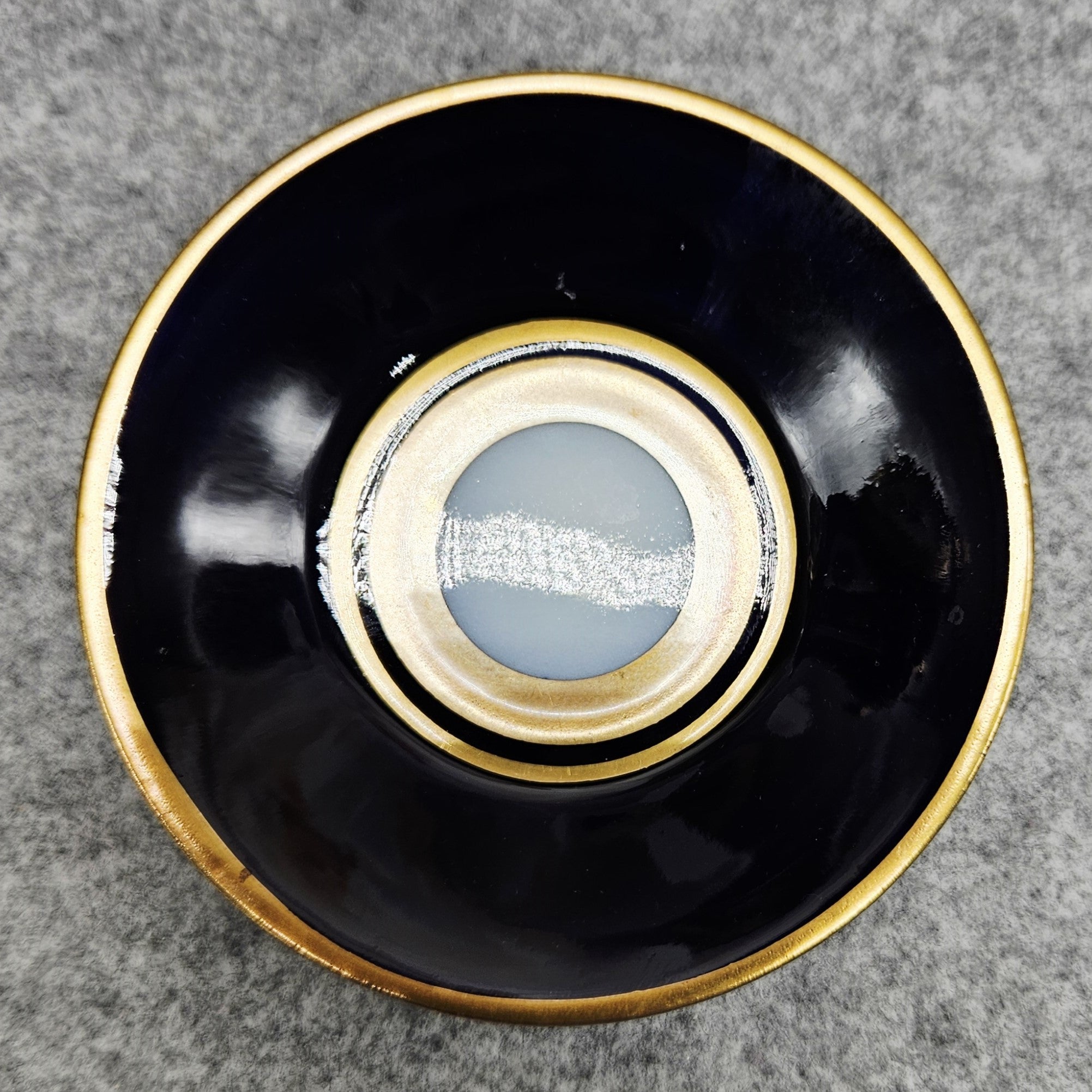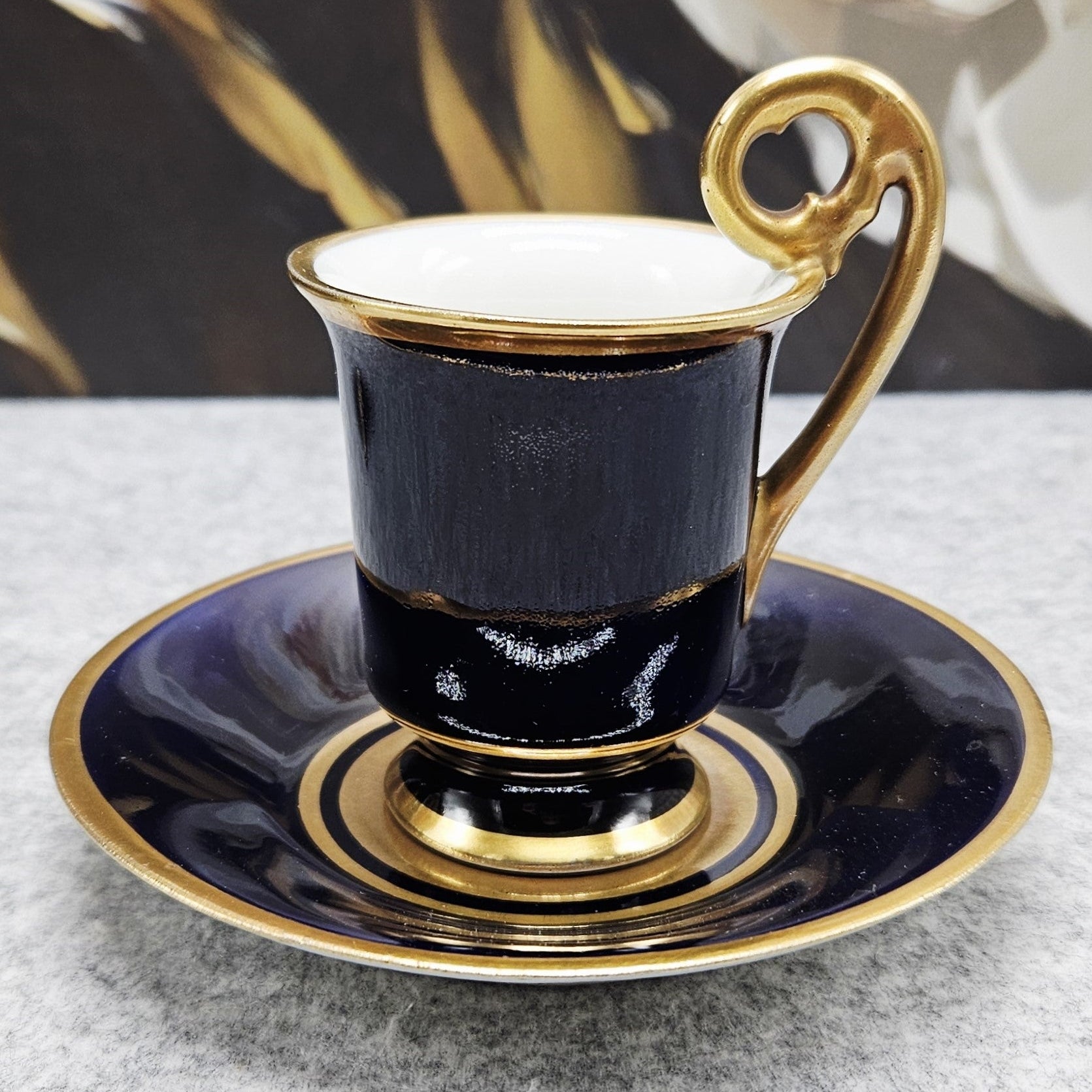 Išskirtinio dizaino „Heinrich Baensch in Lettin“ porceliano puodelis su lėkštute, dekoruotas sodria kobalto mėlynumo glazūra ir auksinėmis detalėmis. Spalvų derinys suteikia rinkiniui ypatingo gylio, prabangos ir rafinuotumo įspūdį.