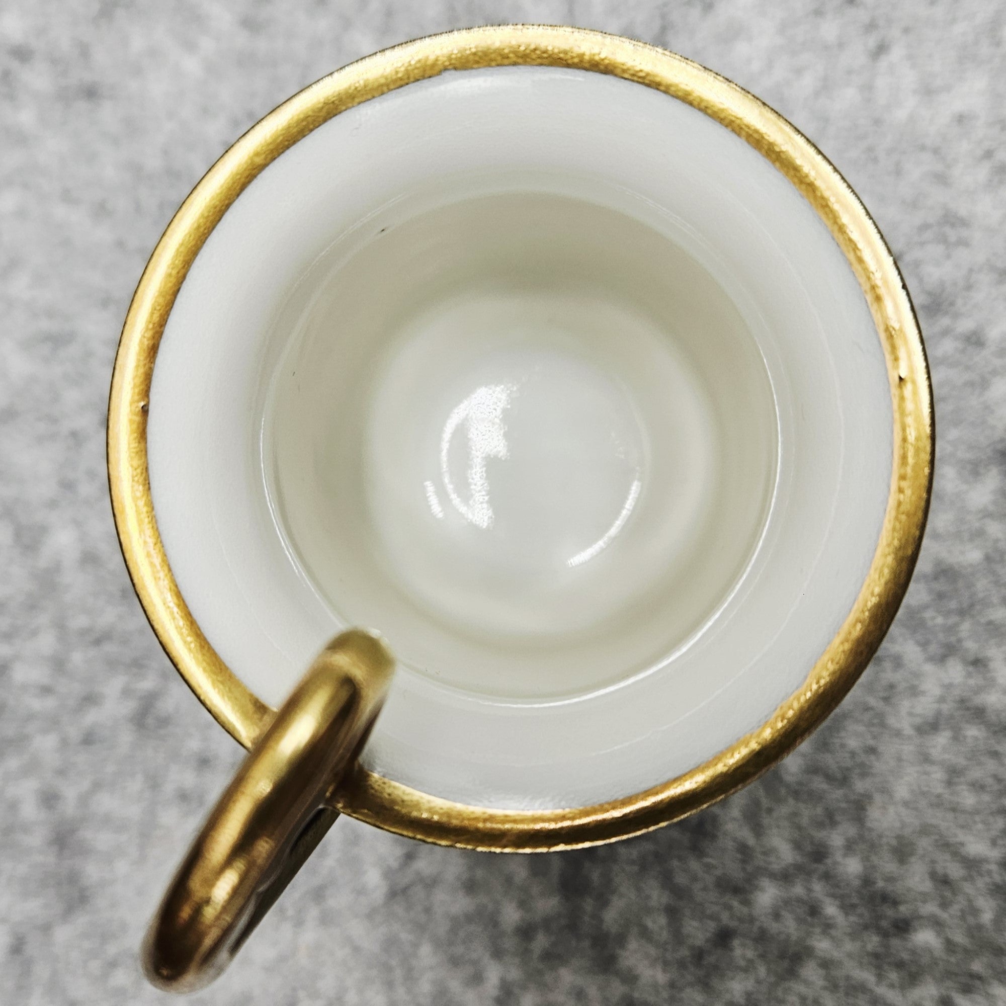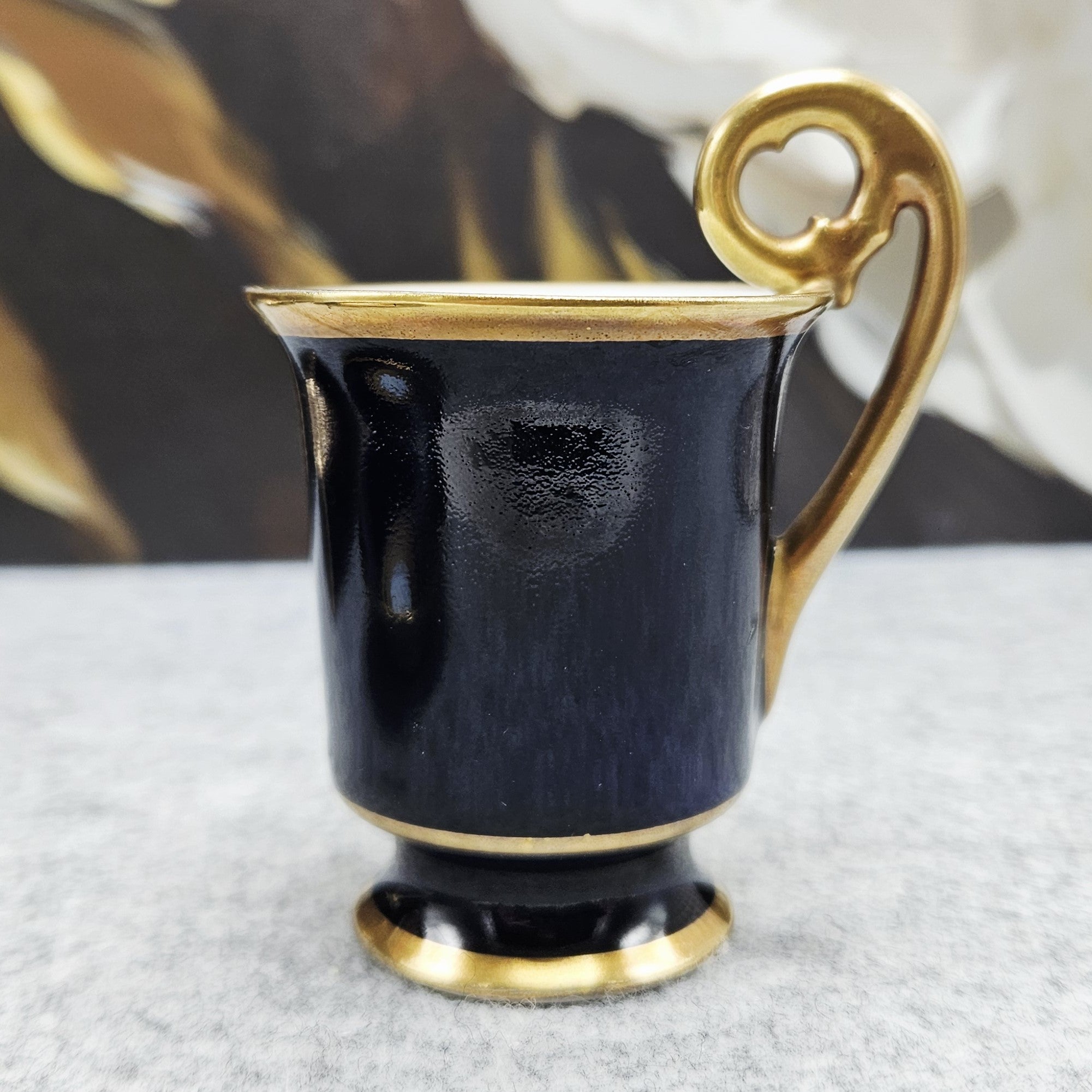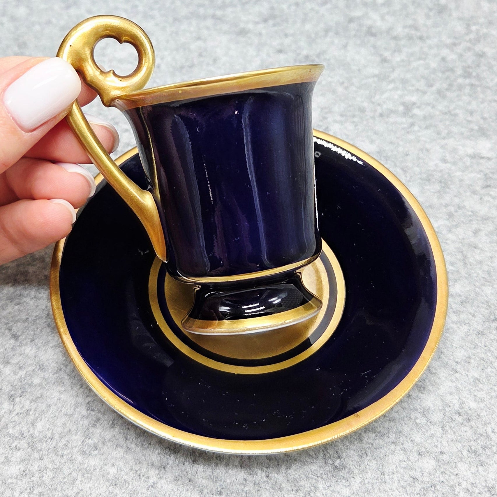 Elegantiškos formos puodelis pasižymi išraiškinga, paauksuota rankenėle, kurios forma ir linijos atspindi aukštos klasės vokiško porceliano meistrystę. Vidus – šviesus, kontrastuojantis su tamsiai mėlynu išorės tonu, sukuriantis harmoningą vizualinį balansą.
