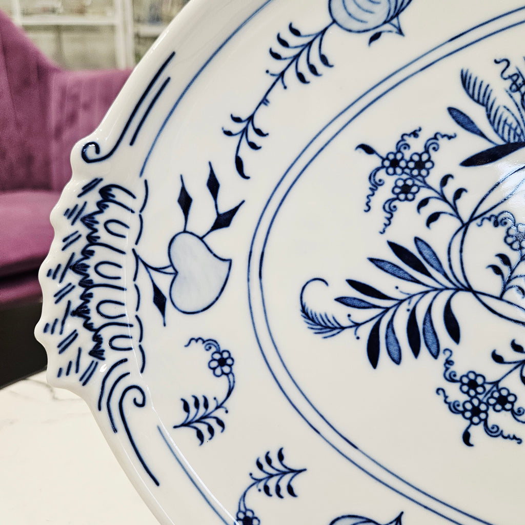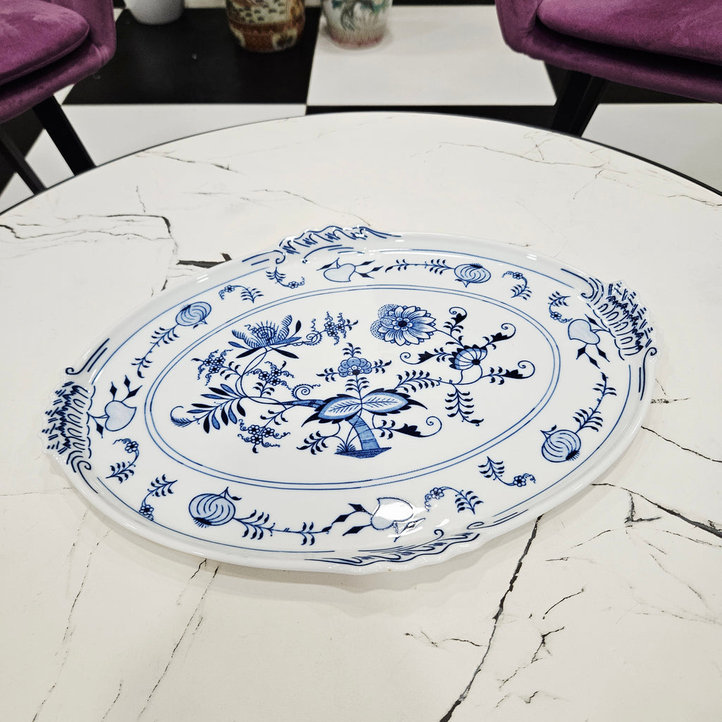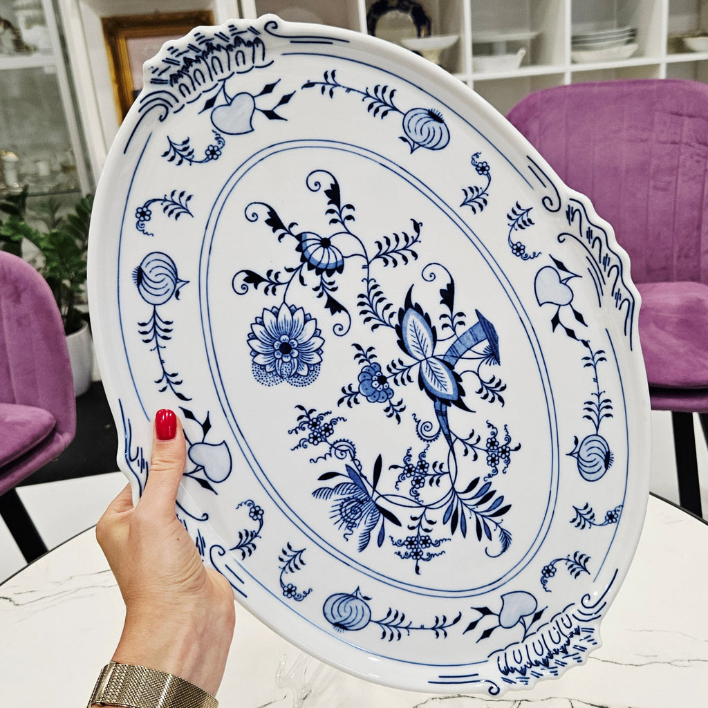 Išskirtinio grožio klasikinio dizaino porcelianinis padėklas su mėlynais svogūnų raštais. Dekoruotas tradiciniu kobalto mėlynos spalvos ornamentu, vaizduojančiu gėlių ir vaisių motyvus. Ovalios formos, subtiliai banguotais kraštais ir dekoratyvinėmis rankenėlėmis.
