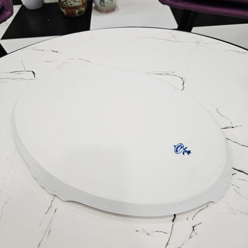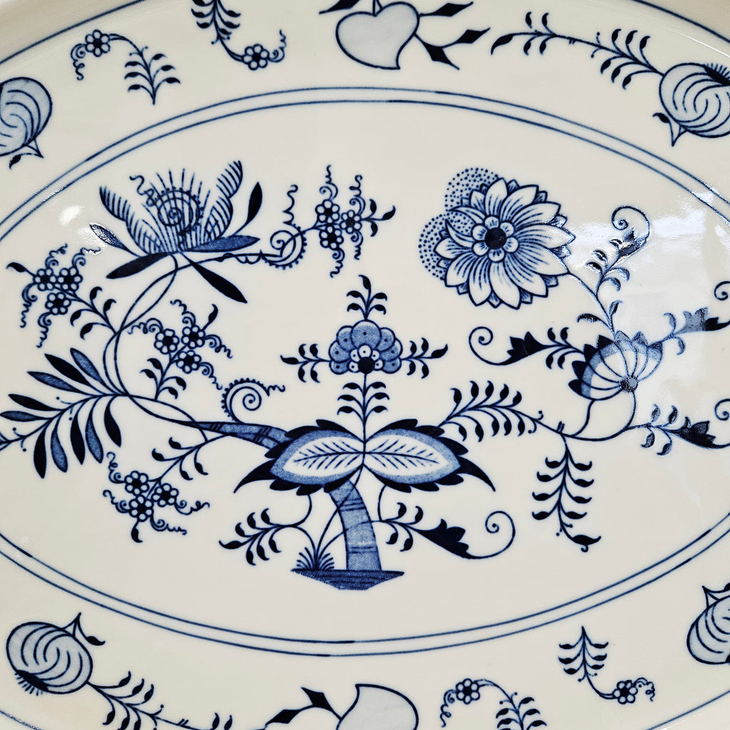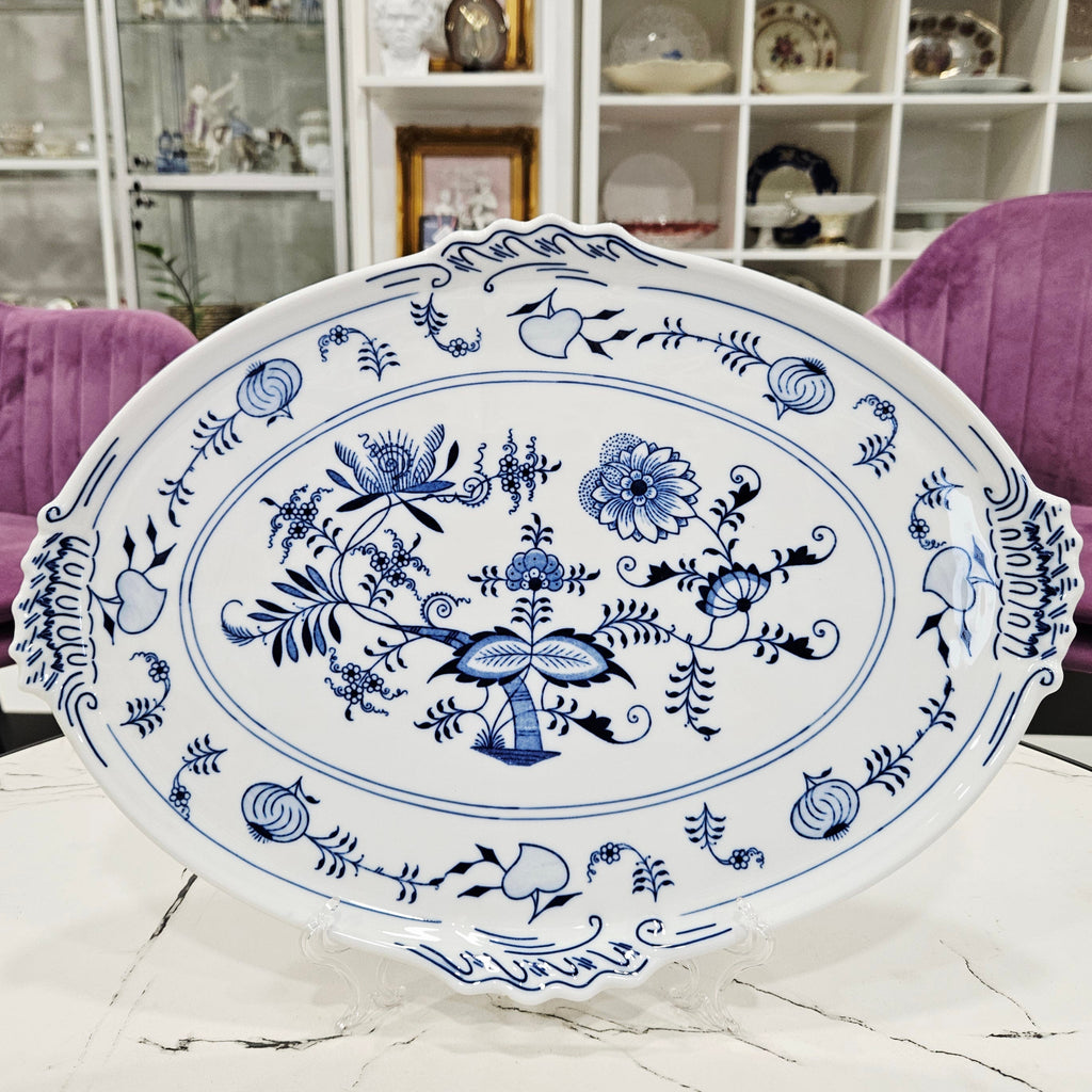 Išskirtinio grožio klasikinio dizaino porcelianinis padėklas su mėlynais svogūnų raštais. Dekoruotas tradiciniu kobalto mėlynos spalvos ornamentu, vaizduojančiu gėlių ir vaisių motyvus. Ovalios formos, subtiliai banguotais kraštais ir dekoratyvinėmis rankenėlėmis.