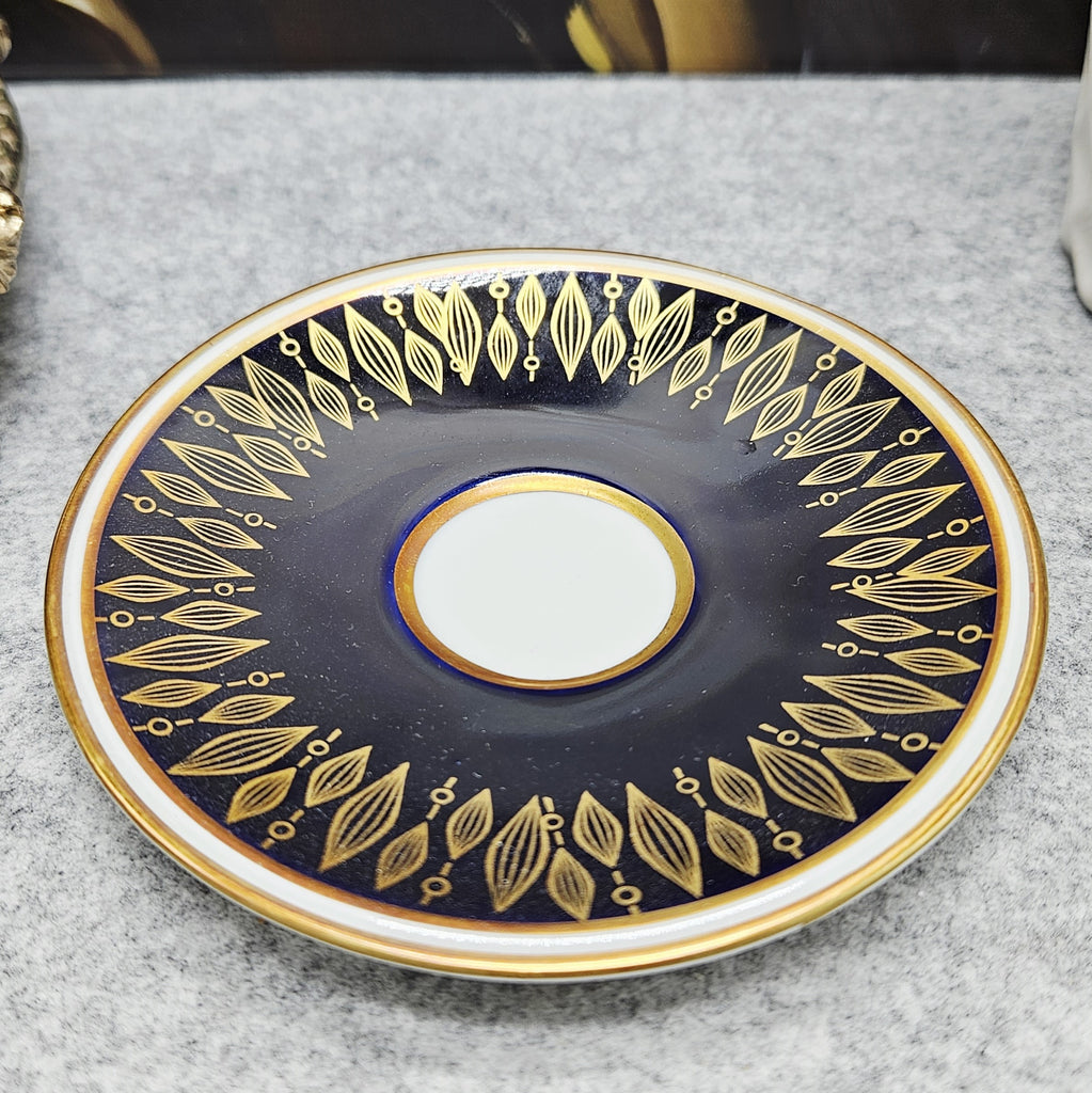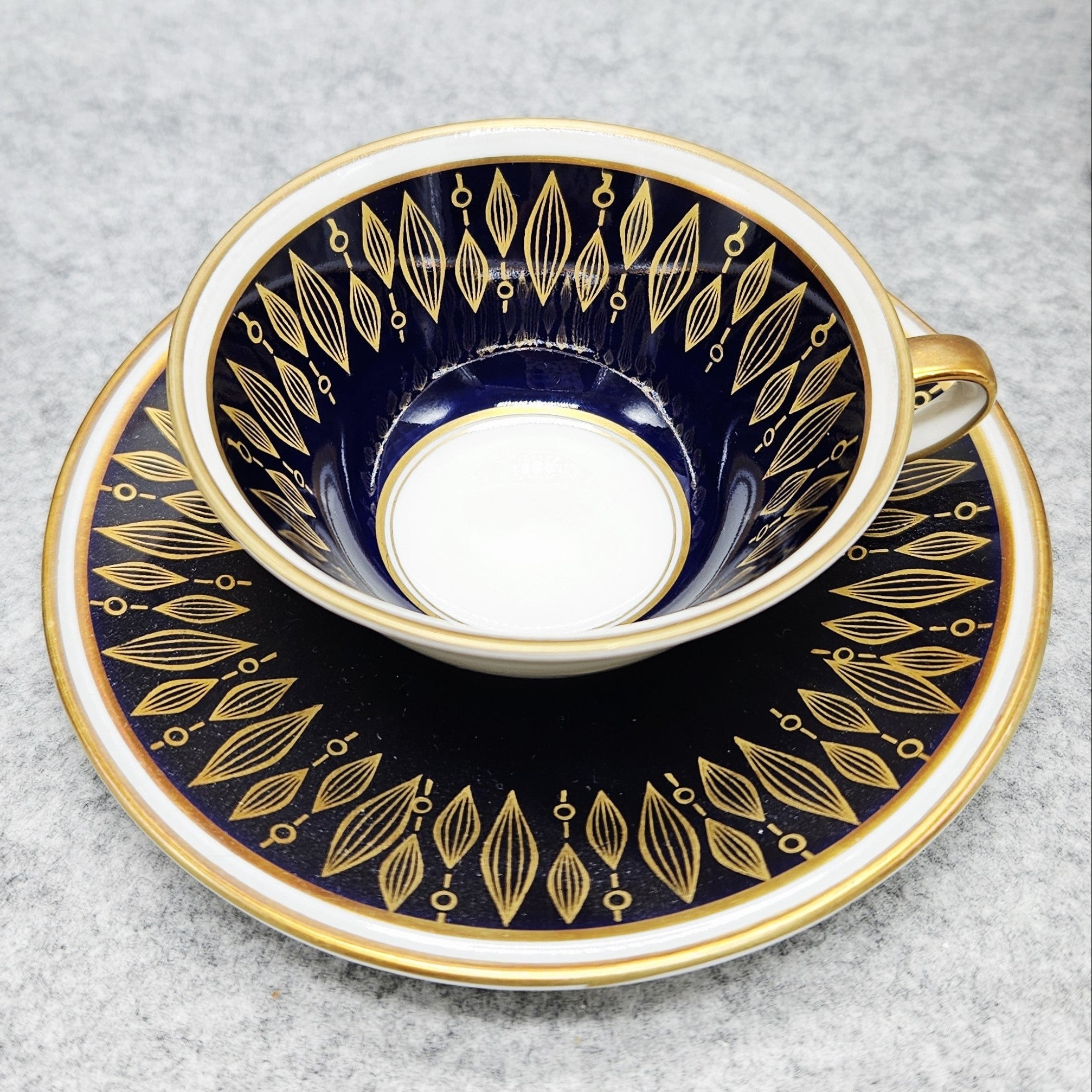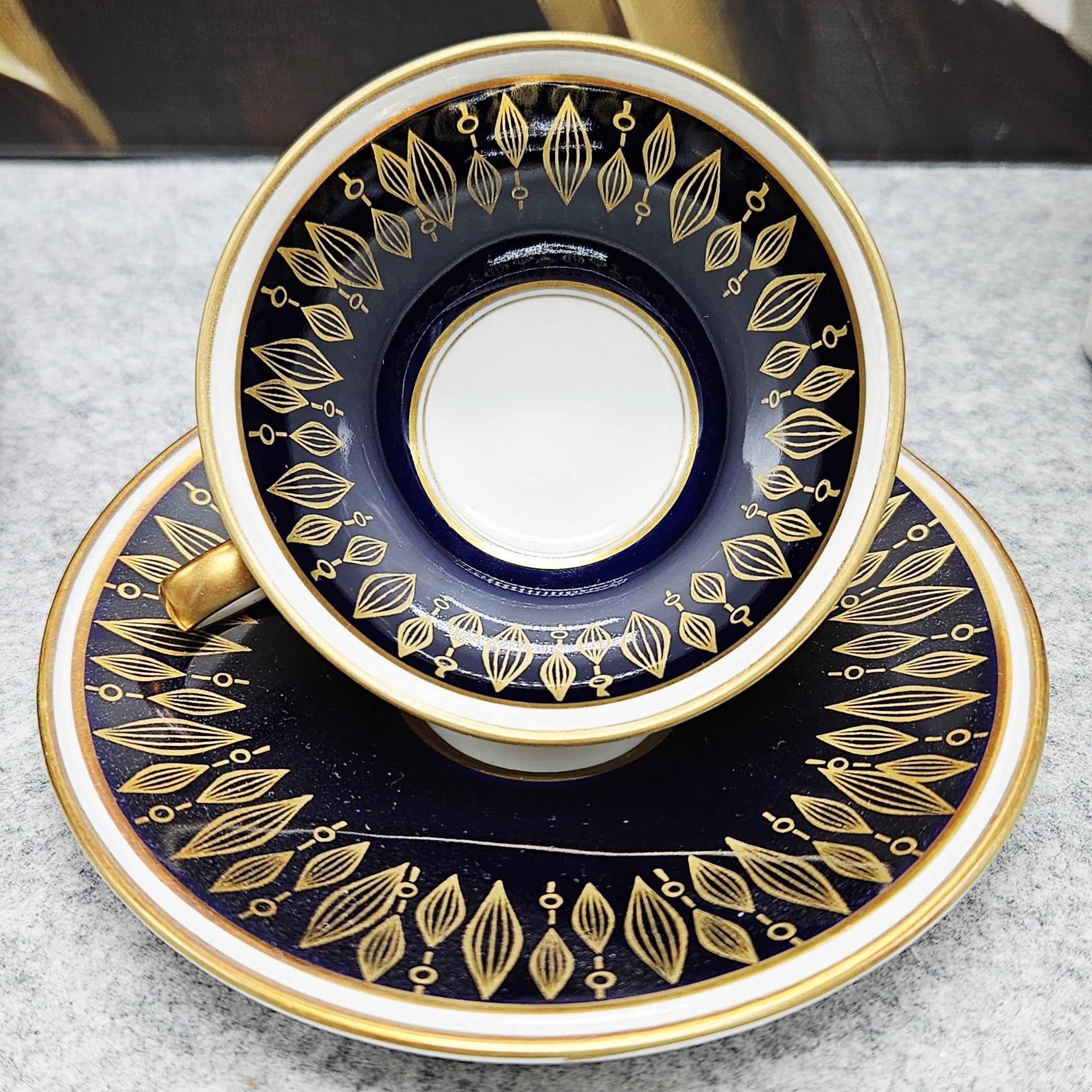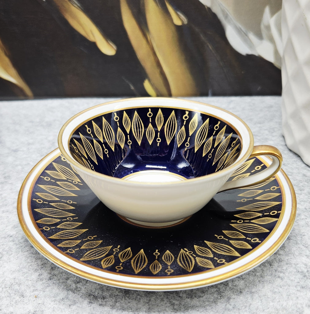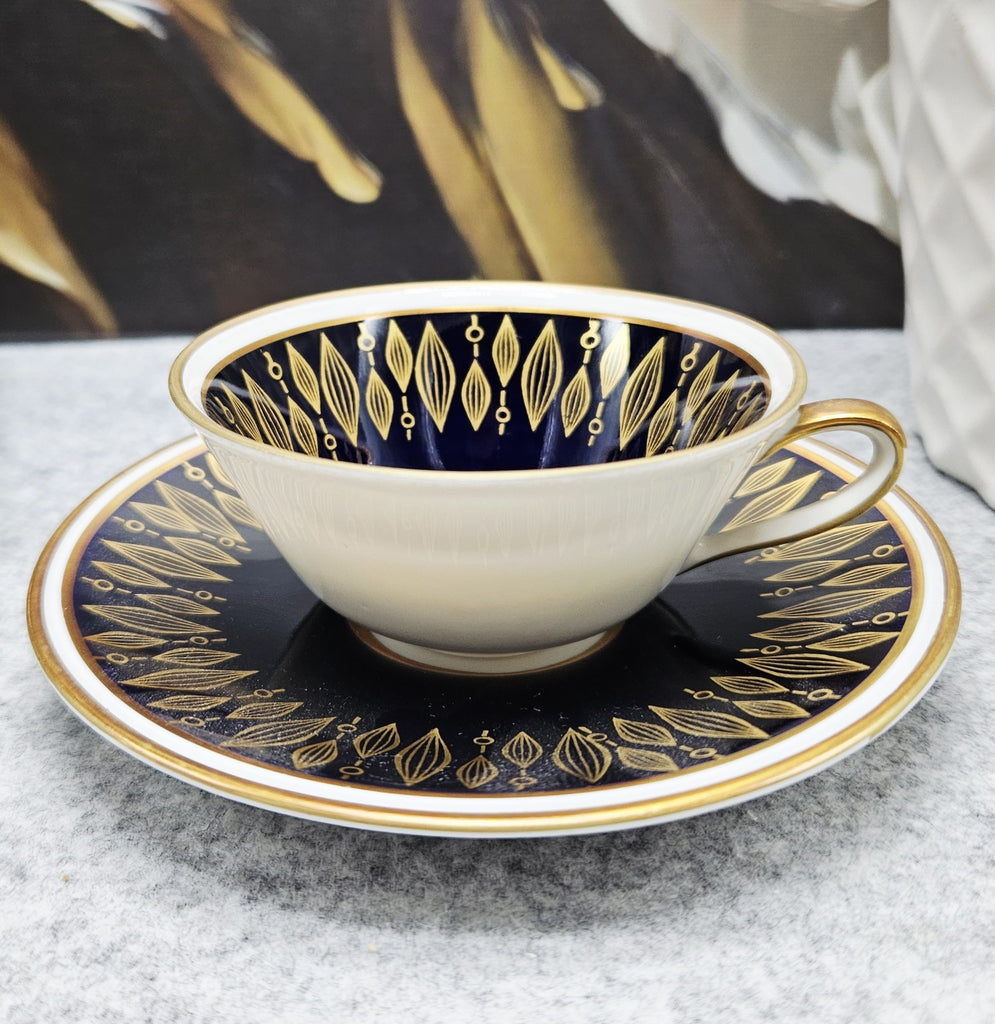 Nuostabus porceliano puodelis, mėlynos (Echt Weimar - Kobalt) spalvos, puoštas aukso detalėmis.
