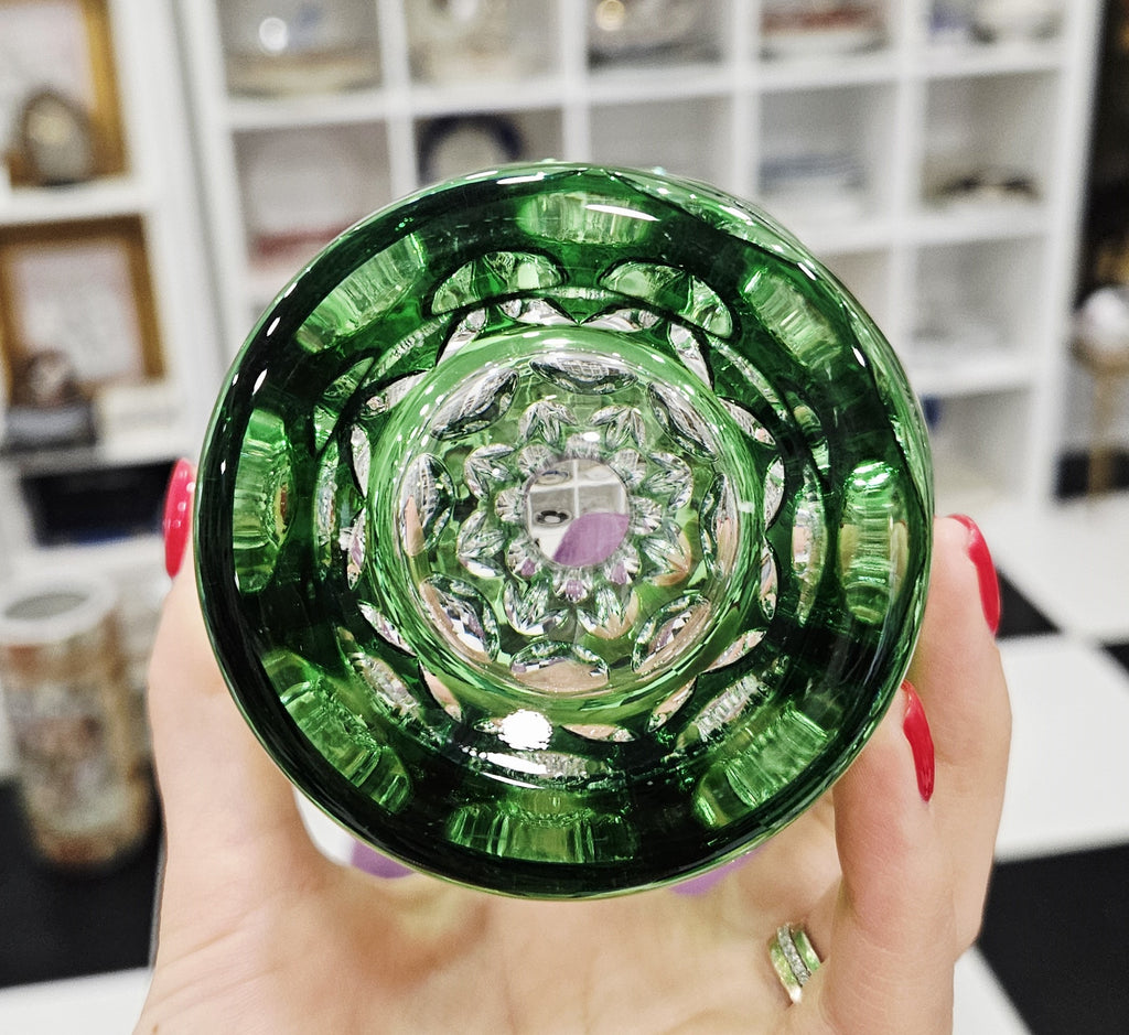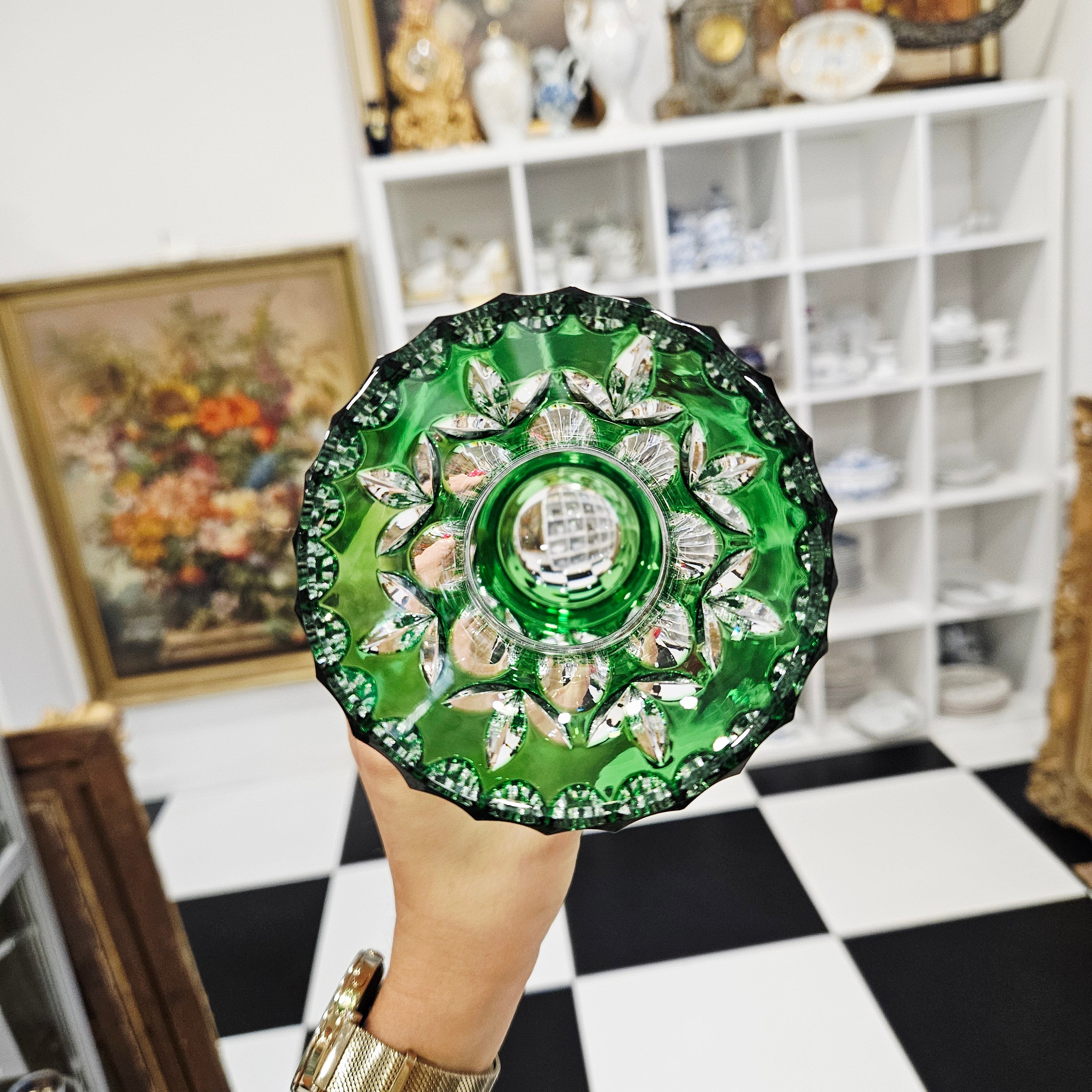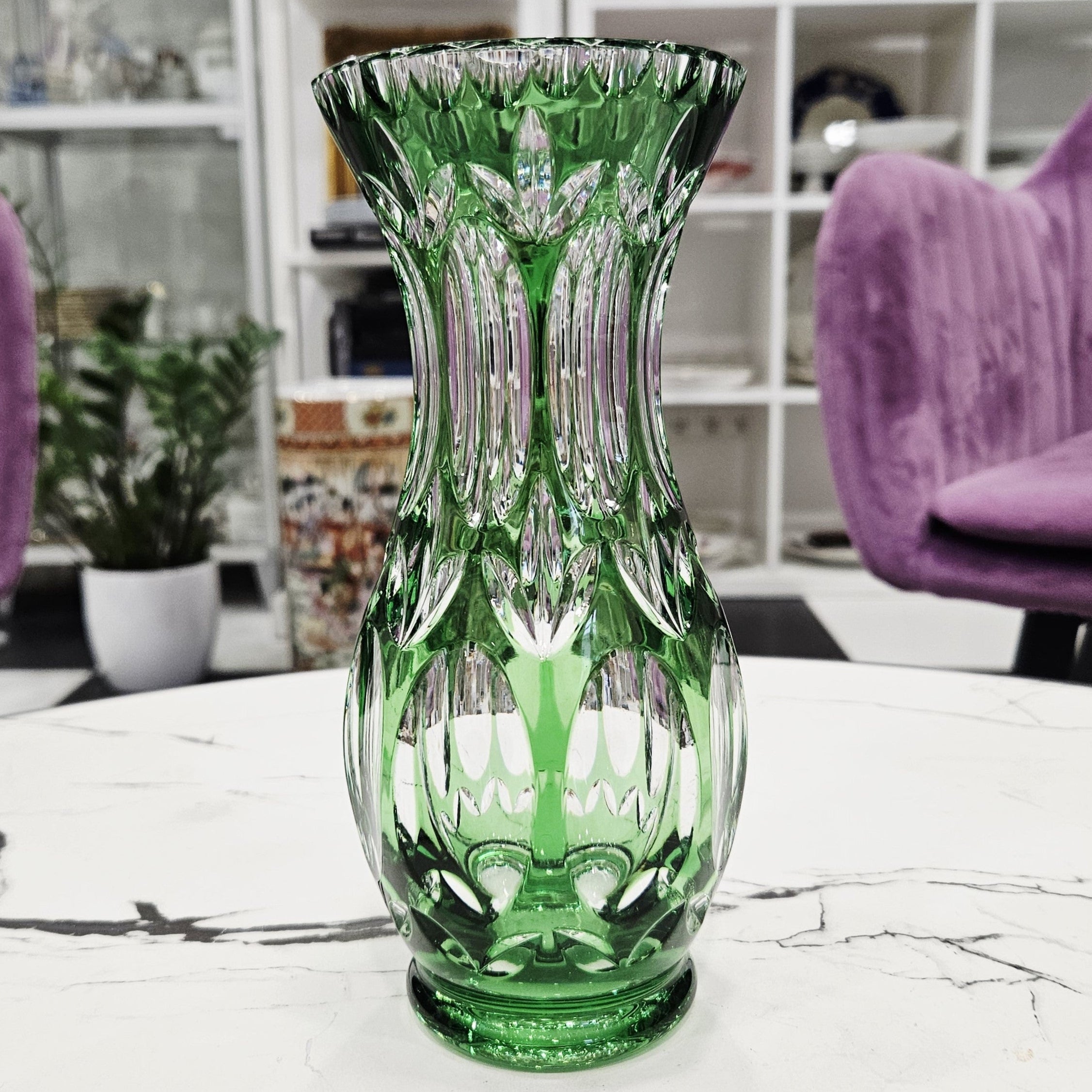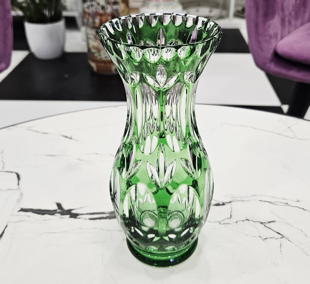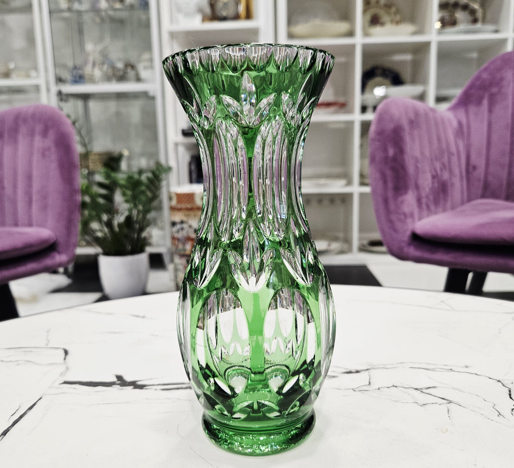 Sodrios žalios spalvos krištolas dailiai žaižaruoja šviesoje, o gilūs šlifavimo raštai kuria įspūdingą šviesos ir atspindžių žaismą. Ši vaza išsiskiria harmoningomis proporcijomis ir išraiškinga forma, kuri traukia akį net be gėlių.