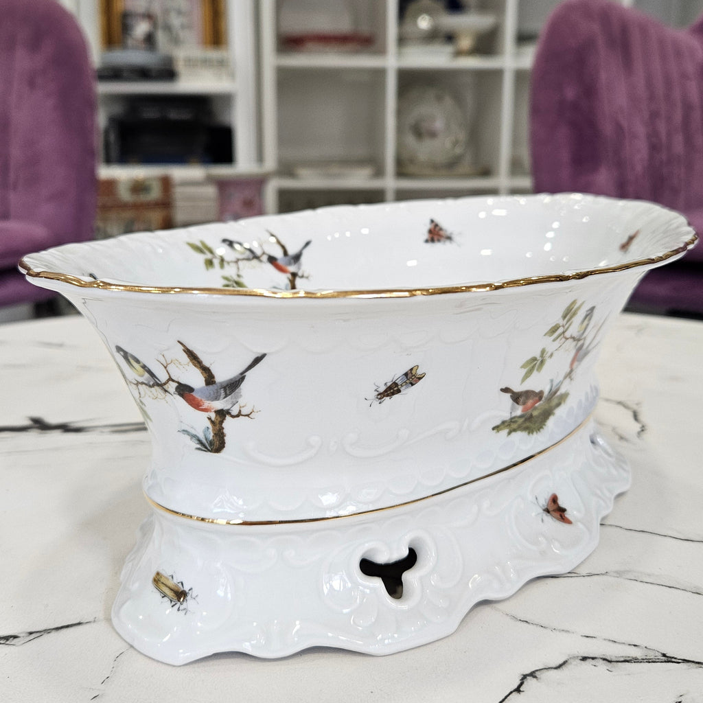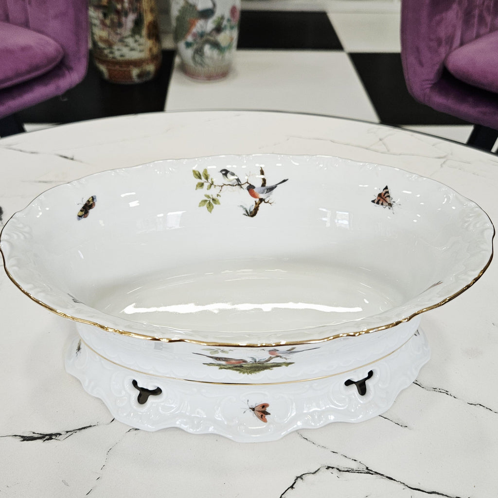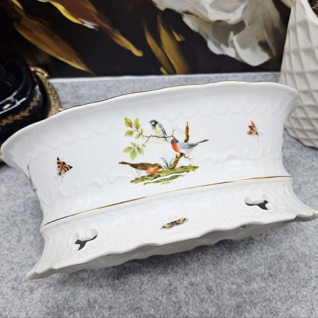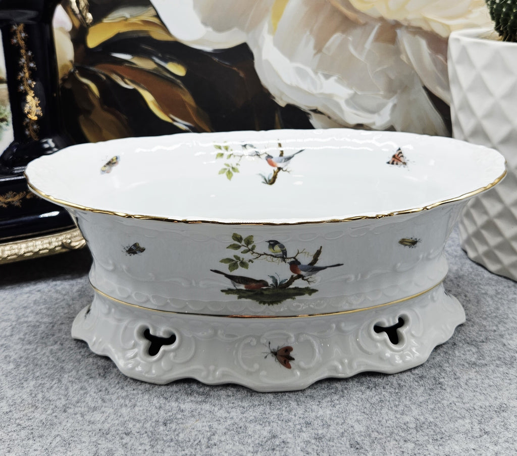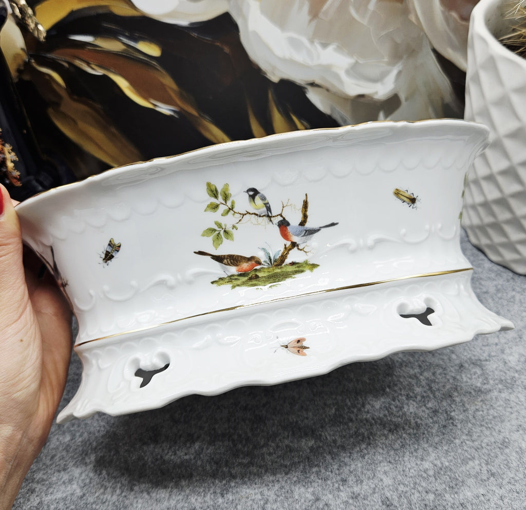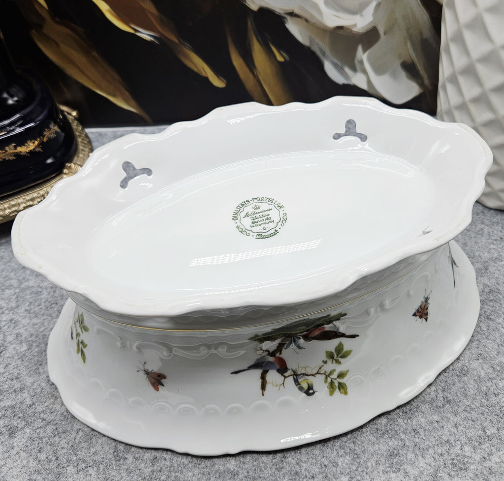 Išskirtinės kokybės vokiškas porceliano dubuo iš Seltmann Weiden manufaktūros, kolekcijos „Mozart“. Dekoruotas elegantiška paukščių ir vabzdžių kompozicija ant balto porceliano pagrindo, subtiliai paauksuotu krašteliu. Reljefinis kraštų ornamentas suteikia indui prabangos ir klasikinės estetikos.