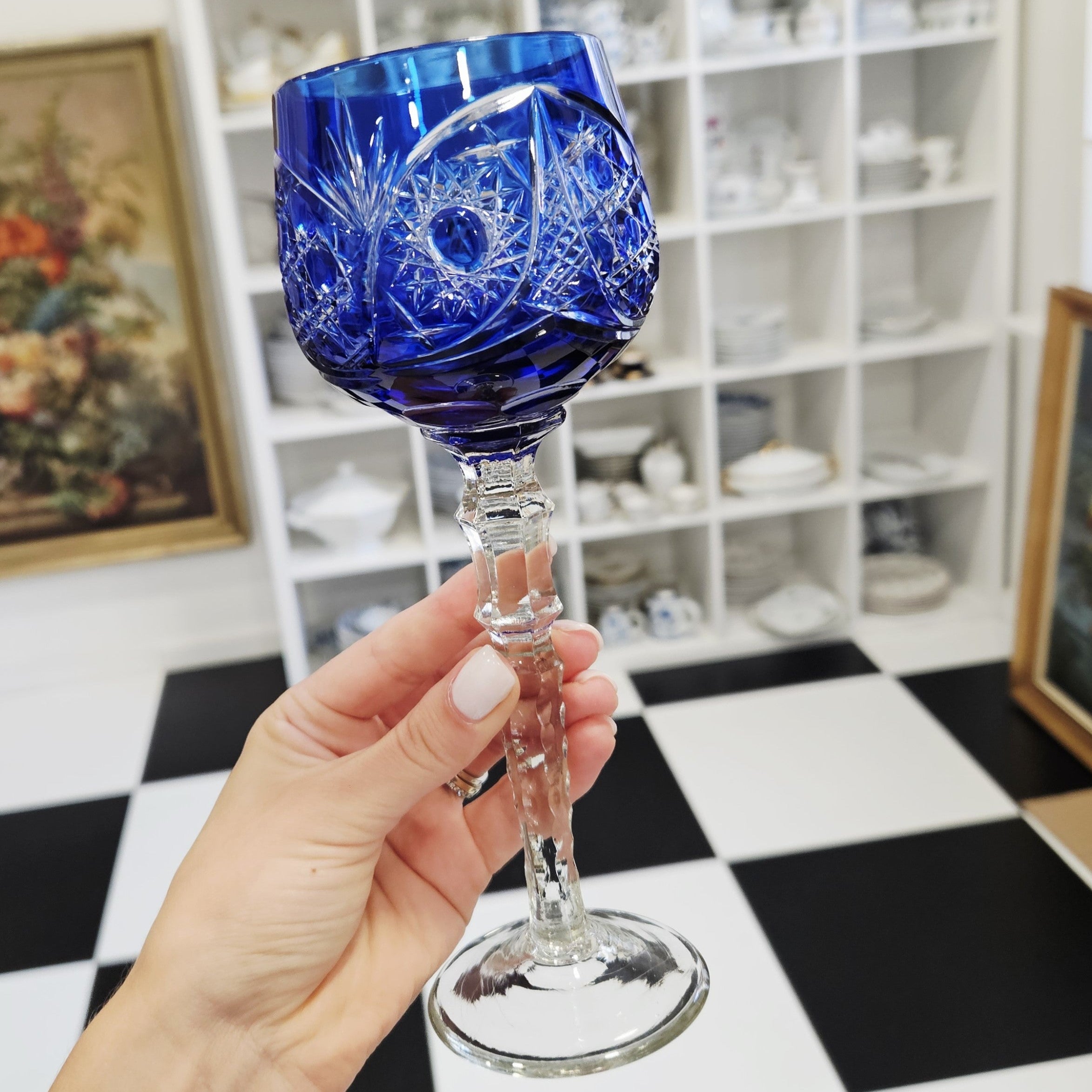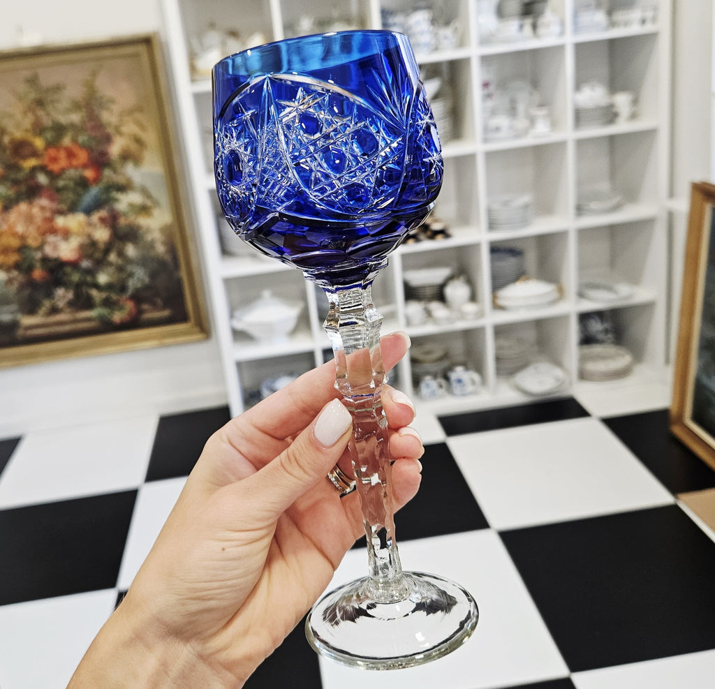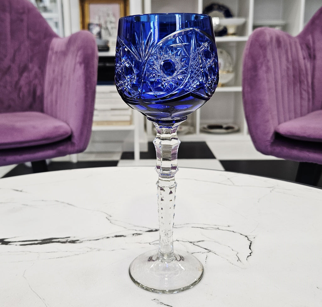 Rankomis raišyta, mėlynos spalvos, krištolinės vyno taurė.