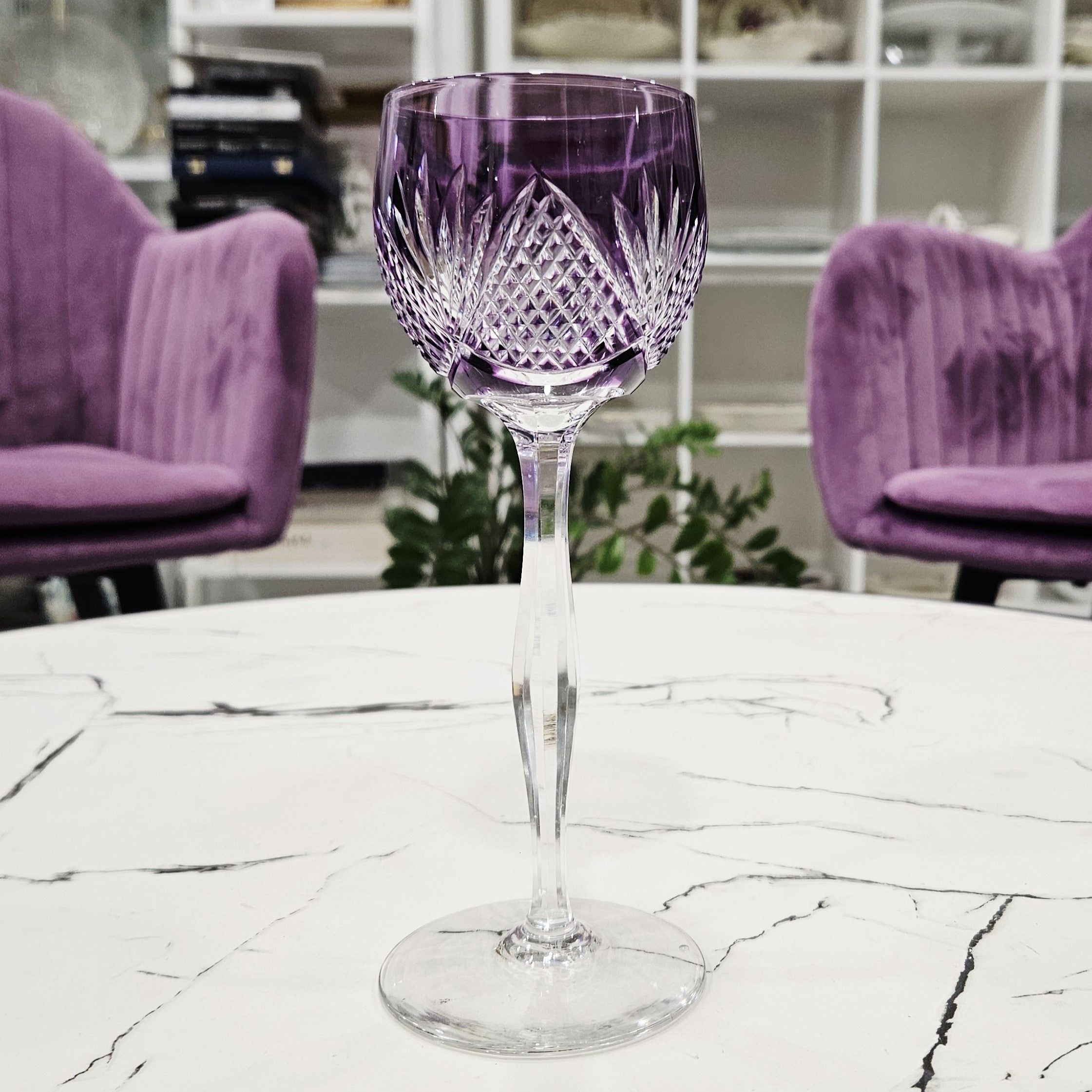 Elegantiška rankų darbo krištolinė taurė violetinės spalvos ir preciziškai šlifuotu dekoru. Taurės sieneles puošia išraiškingi geometriniai motyvai, kurie gražiai kontrastuoja su skaidriu nušlifuotu krištolu ir sukuria ypatingą šviesos žaismą.