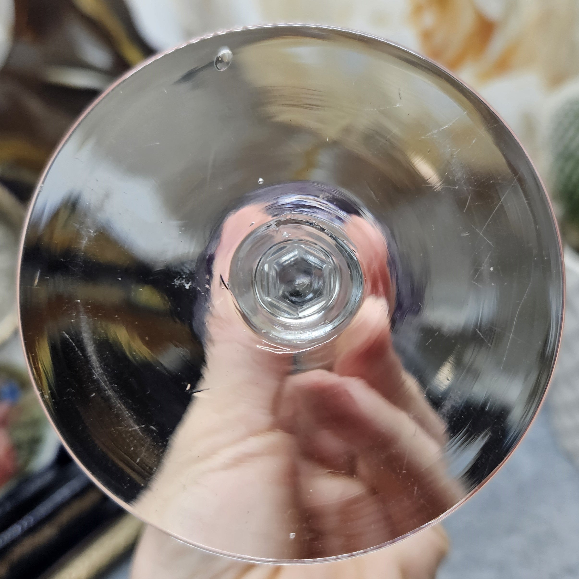 Būklė labai gera – be įskilimų ar nuskilimų, ant dugno yra oro burbuliukas. Kolejė nežymiai pabraižyta. (vadovautis nuotraukomis)