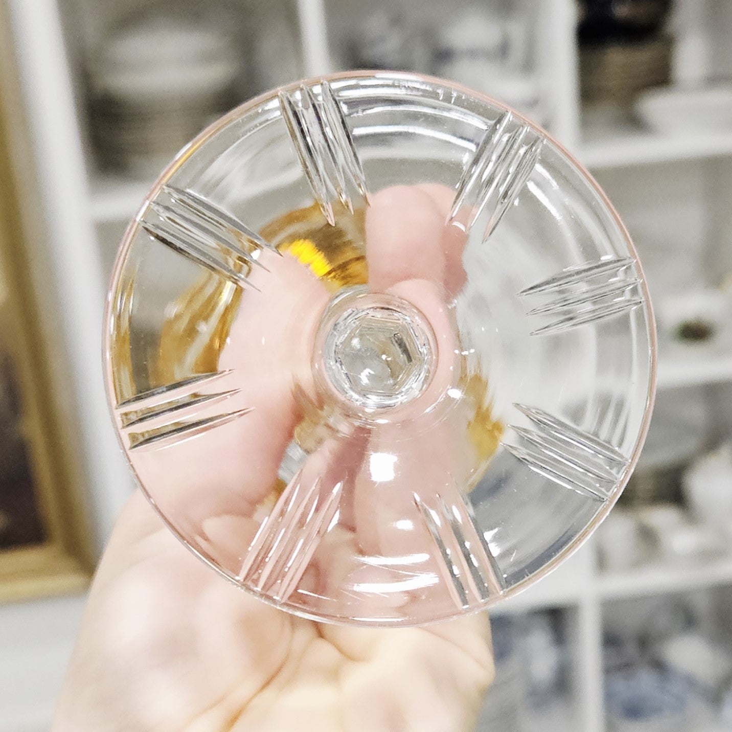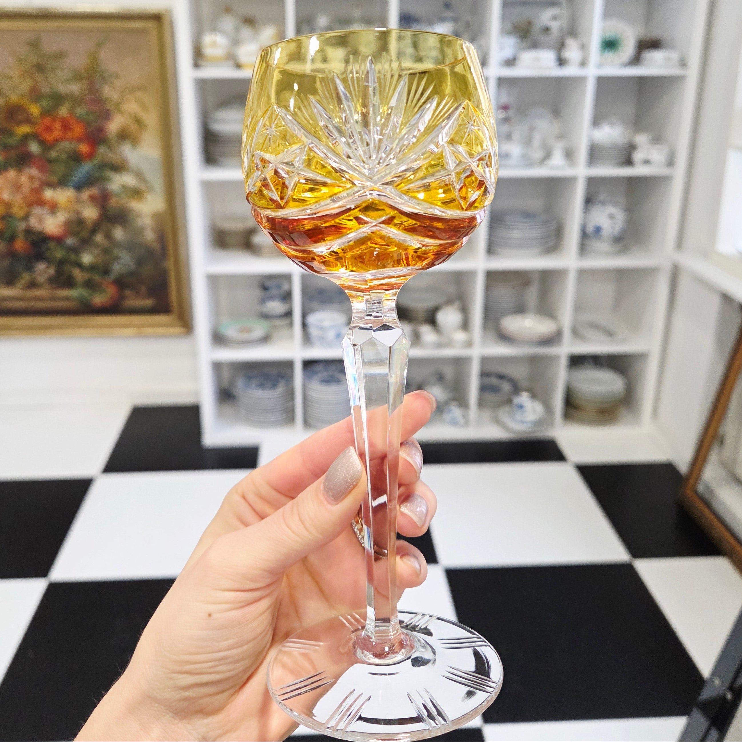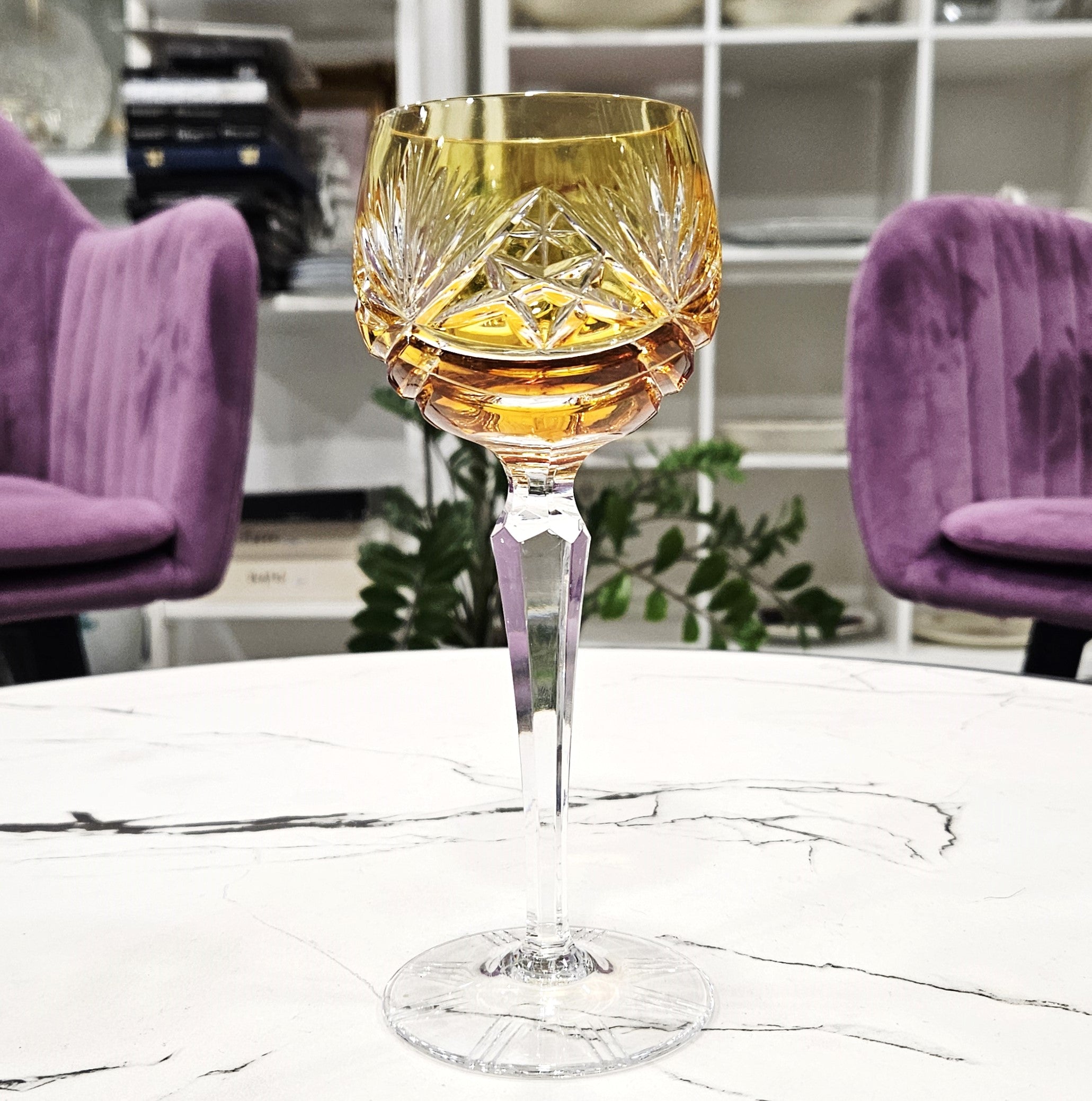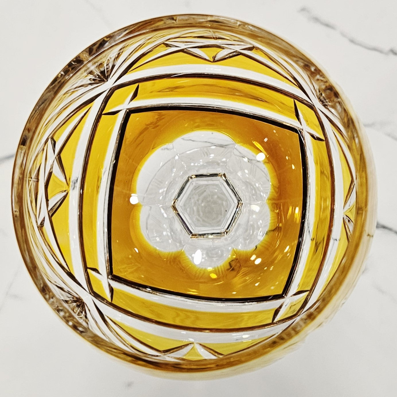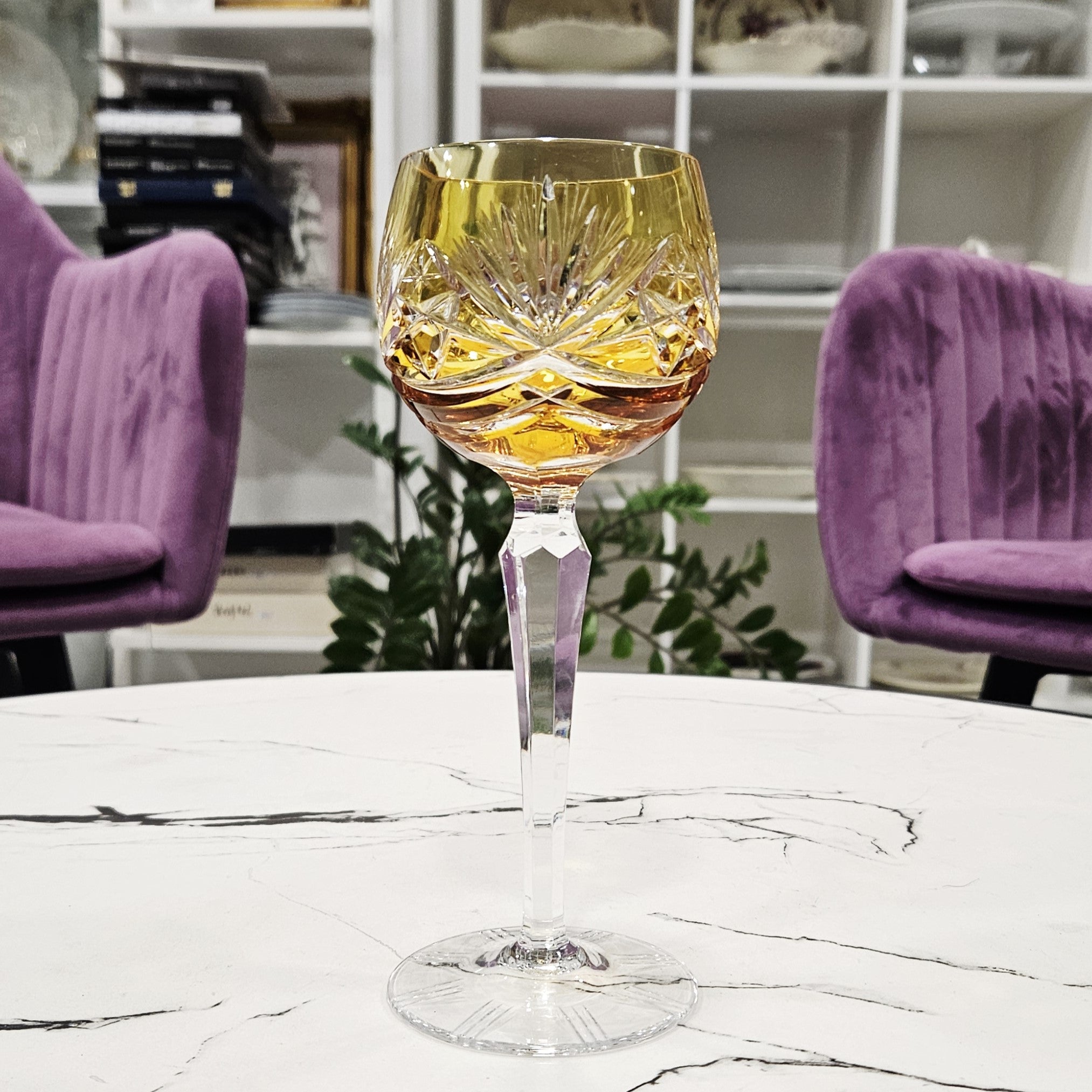 Elegantiška rankų darbo krištolinė taurė geltonos spalvos ir preciziškai šlifuotu dekoru. Taurės sieneles puošia išraiškingi geometriniai motyvai, kurie gražiai kontrastuoja su skaidriu nušlifuotu krištolu ir sukuria ypatingą šviesos žaismą.