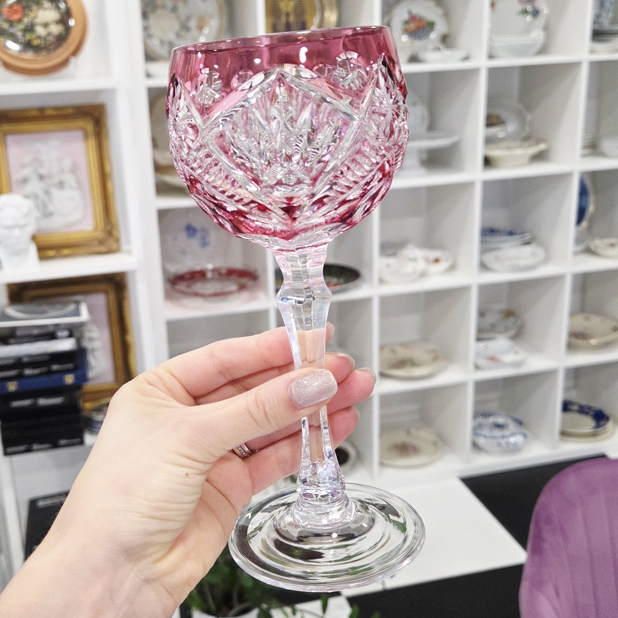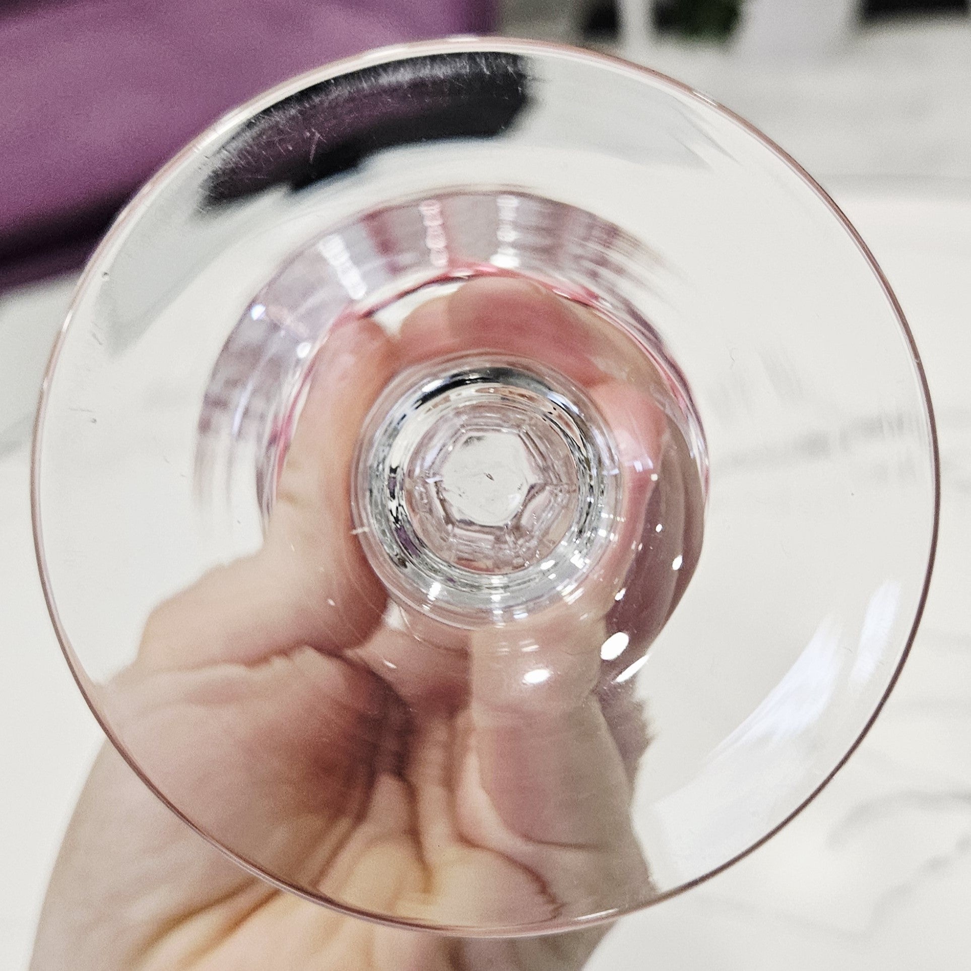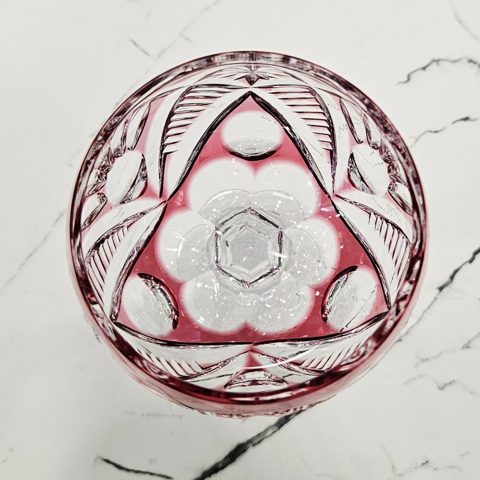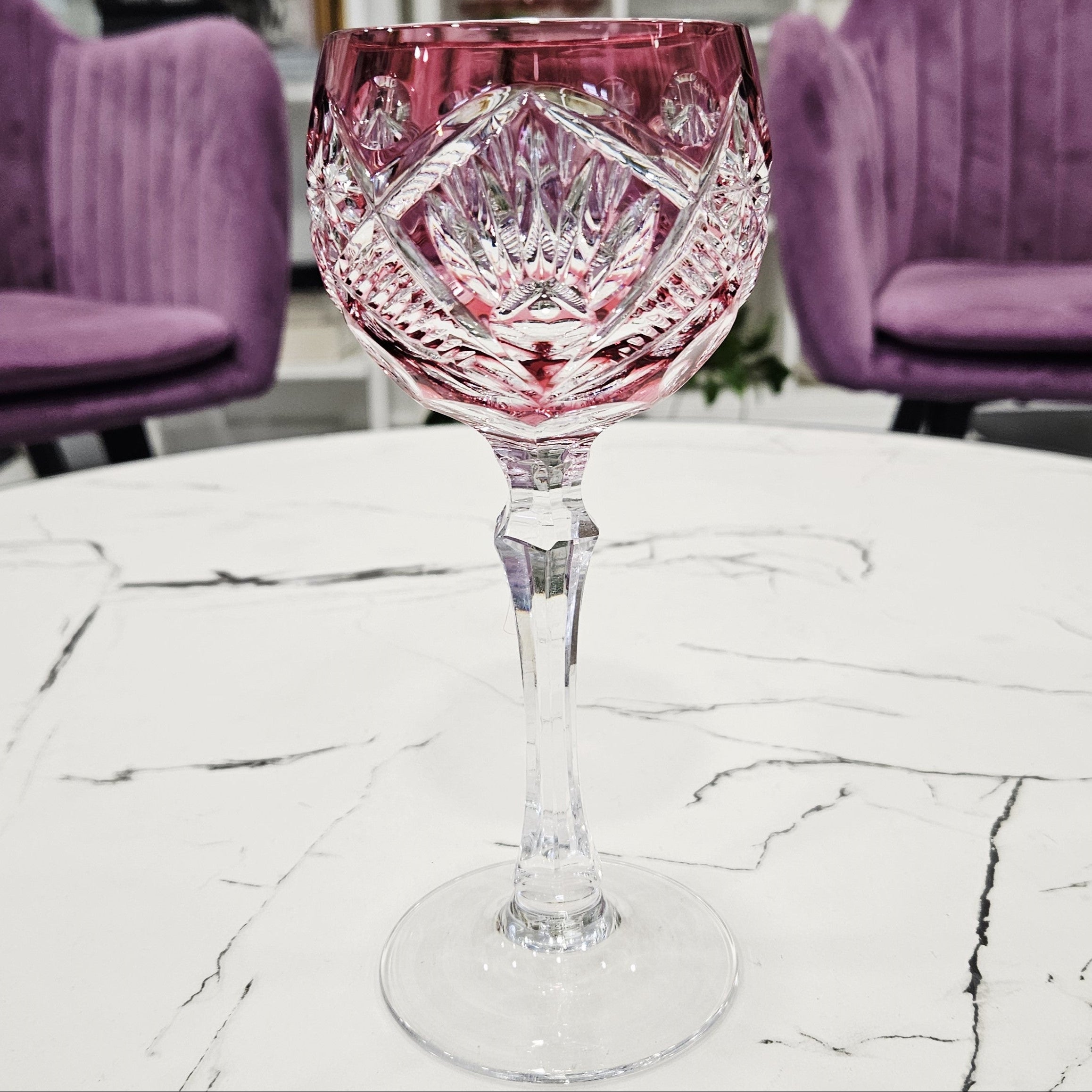 Elegantiška rankų darbo krištolinė taurė rausvo atspalvio ir preciziškai šlifuotu dekoru. Taurės sieneles puošia išraiškingi geometriniai motyvai, kurie gražiai kontrastuoja su skaidraus krištolo šlifavimu ir sukuria ypatingą šviesos žaismą.