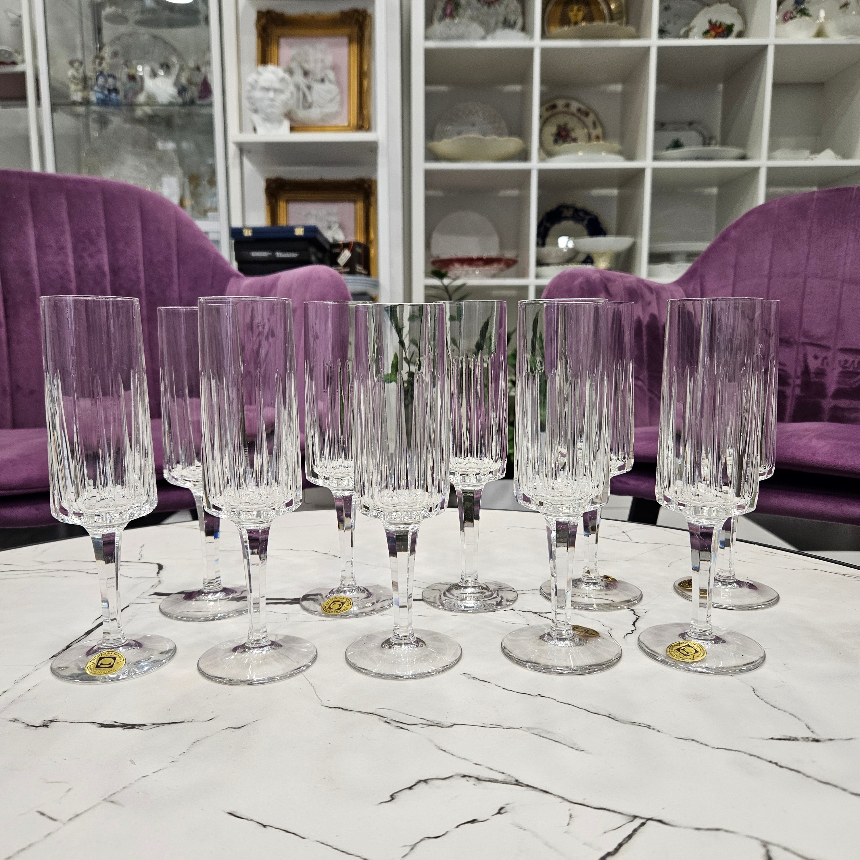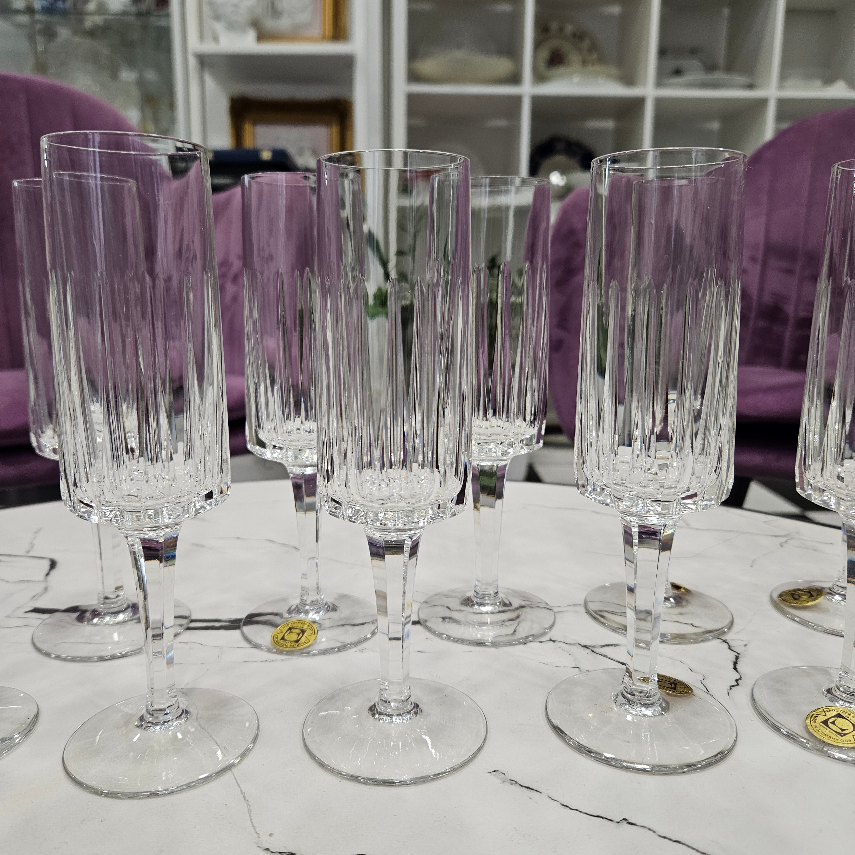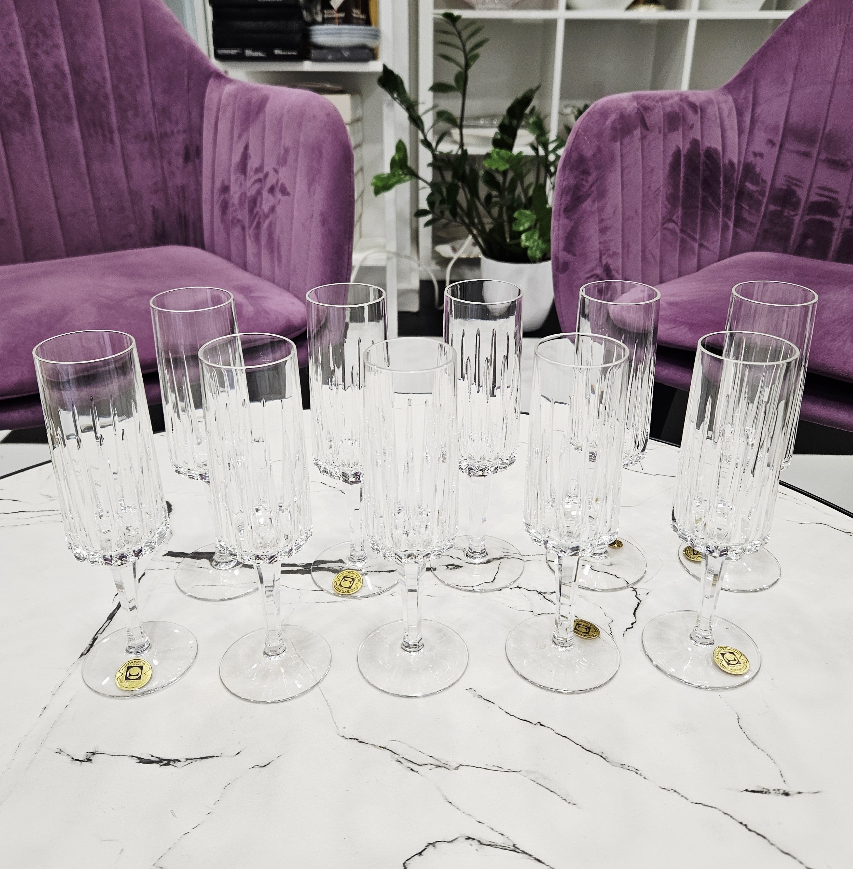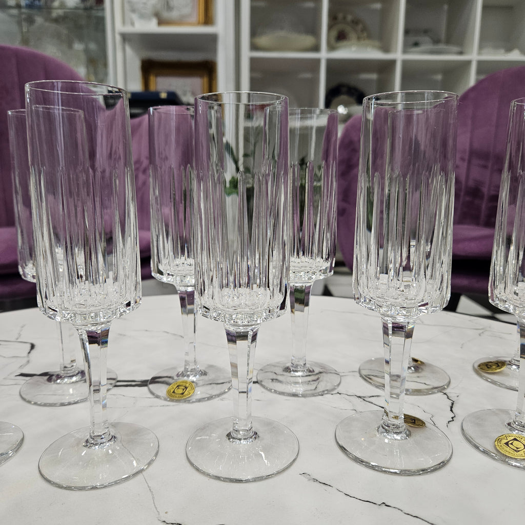 Įspūdingos, labai kokybiško krištolo šampano taurės, dekoruotos pasikartojančių klasikinių rombų motyvais tikras elegancijos dvelksmas.
