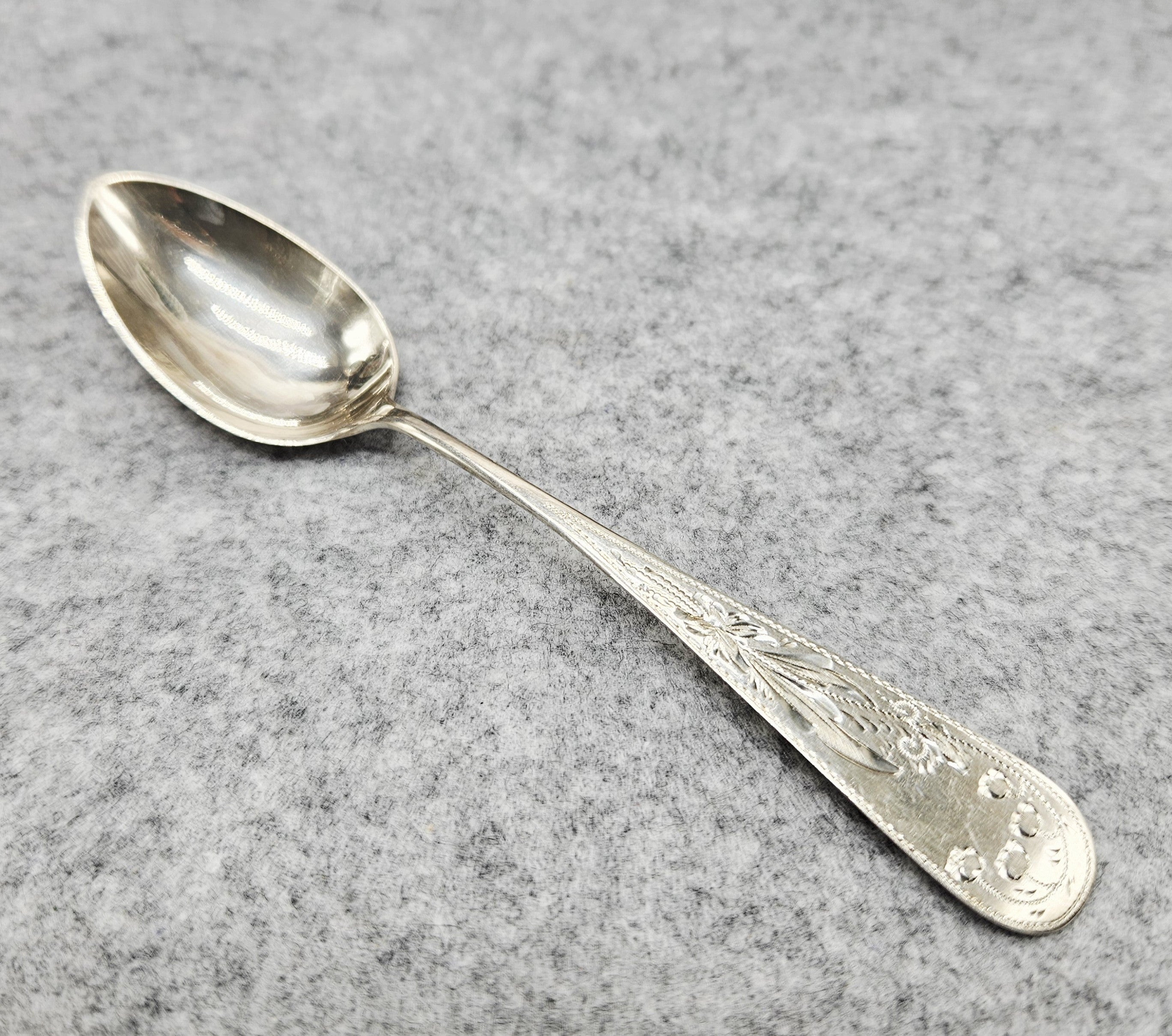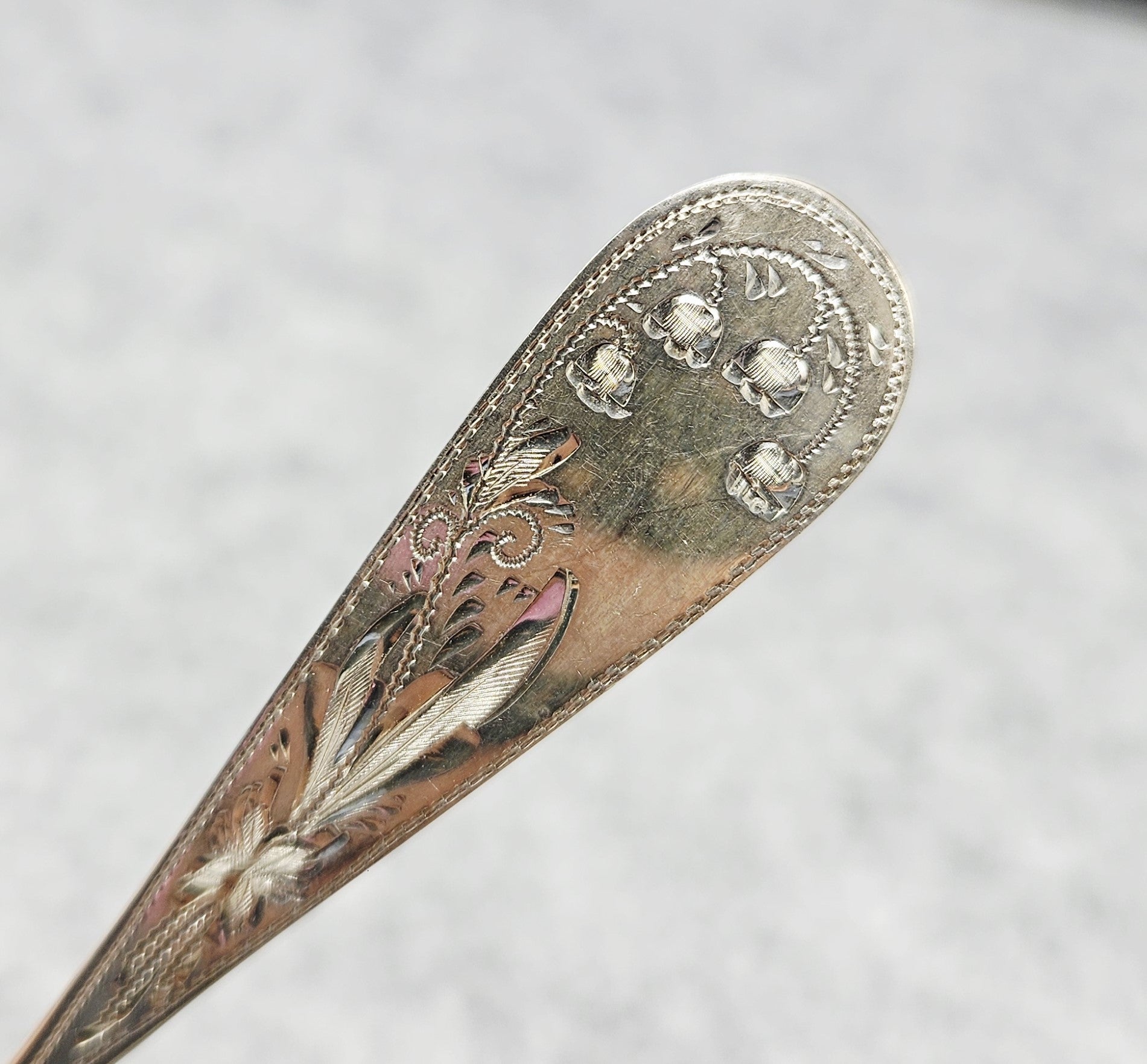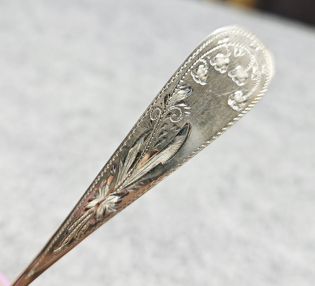 Sidabrinis paviršius iš dalies paauksuotas vidinėje pusėje – tai ne tik estetinis, bet ir apsauginis sprendimas, būdingas XIX–XX a. sandūros prabangiems stalo įrankiams.