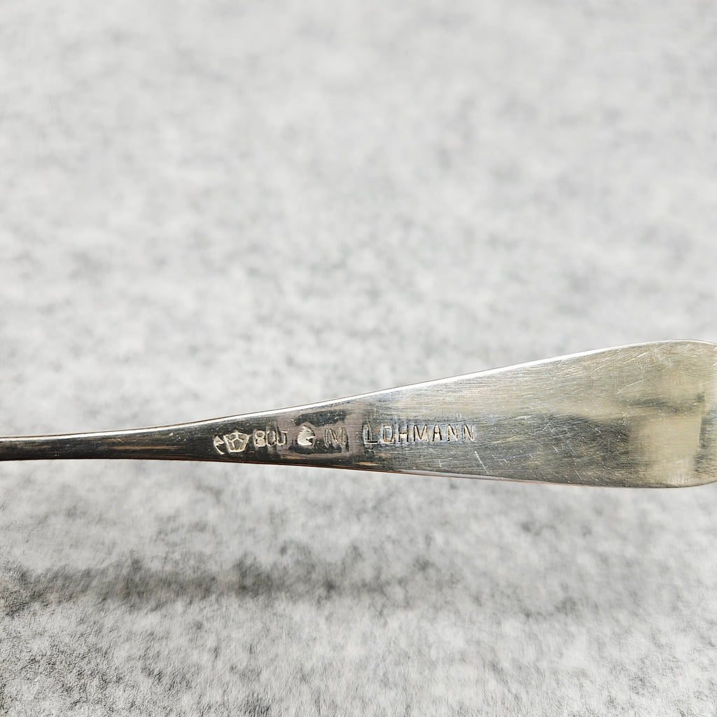Rinkinys pagamintas Vokietijoje, garsios Solingeno dirbinių manufaktūros C. W. Engels, o šaukšteliai pažymėti meistro M. Lohmann ir prabos ženklu 800 .