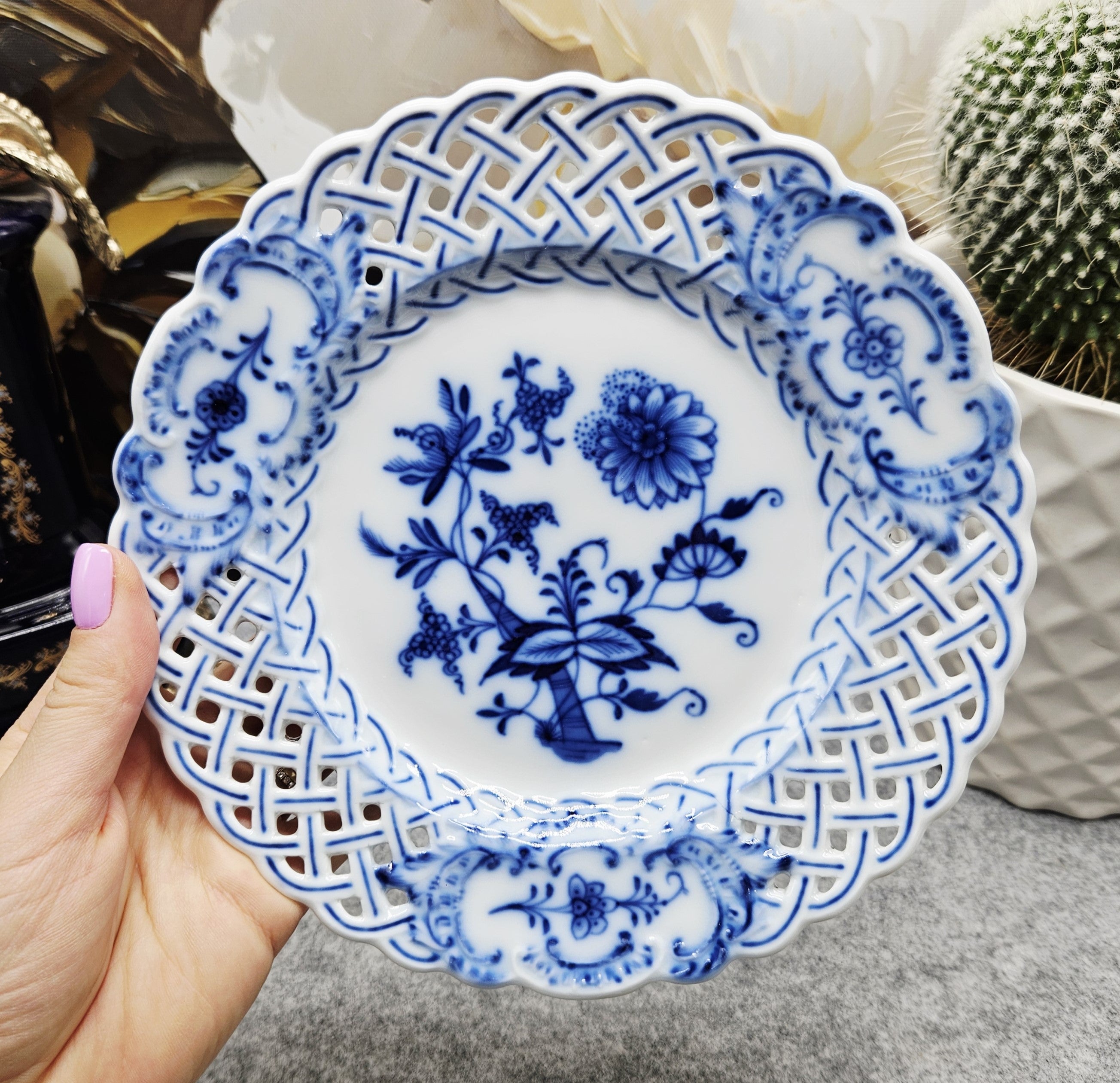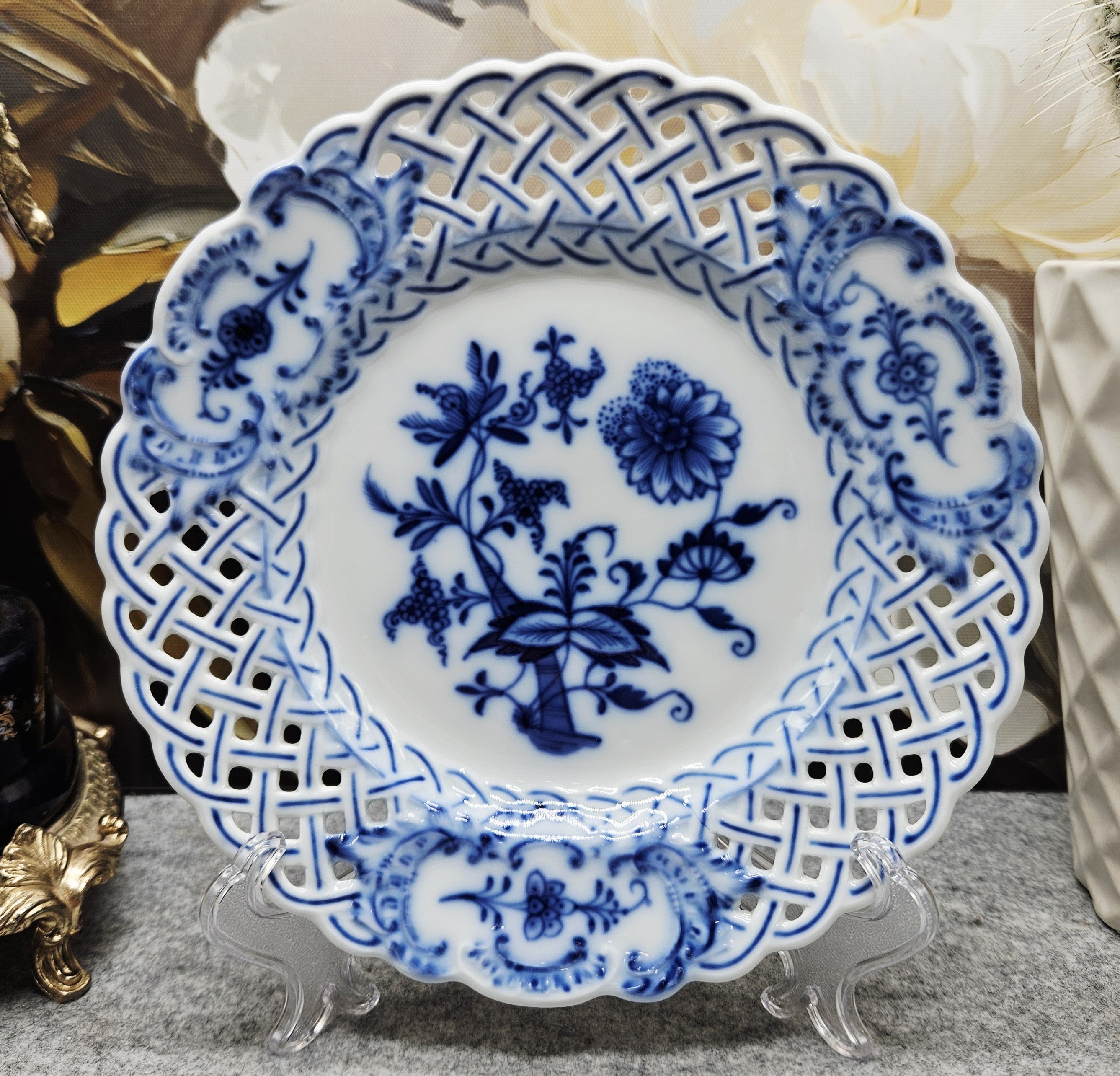 Išskirtinio grožio antikvarinė porceliano lėkštė, sukurta Carl Teichert manufaktūroje . Dekoruota klasikiniu „Zwiebelmuster“ („Mėlynasis svogūnas“) raštu – vienu iš žymiausių Meissen kūrinių, įkvėptu Rytų Azijos gėlių ir vaisių motyvų. Piešinys subtiliai ištapytas mėlyna kobalto glazūra po glazūra, kas būdinga tik aukščiausios klasės Carl Teichert Meissen gaminiams.