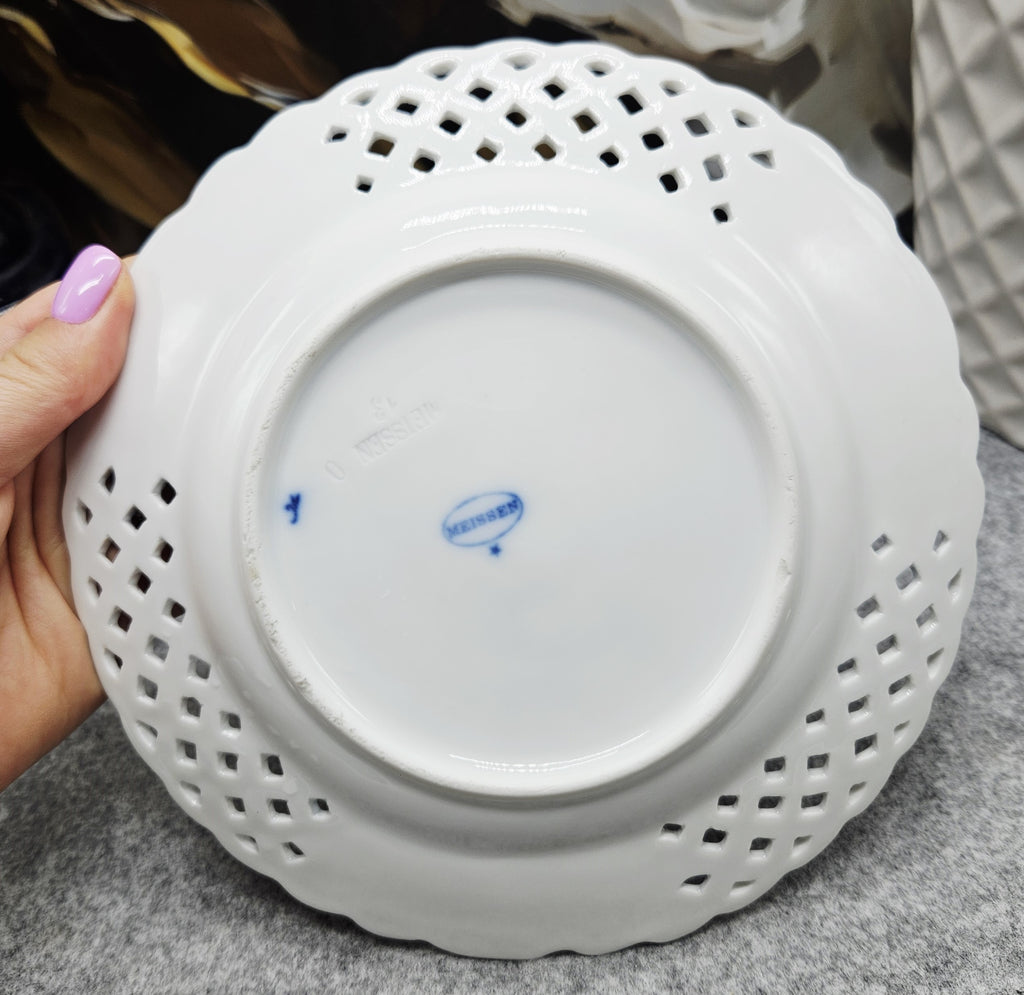 Ažūrinis kraštelis („reticulated rim“) su pynės ornamentu suteikia lėkštei lengvumo ir aristokratiško žavesio, o kruopštus modeliavimas liudija apie nepriekaištingą manufaktūros meistrystę.