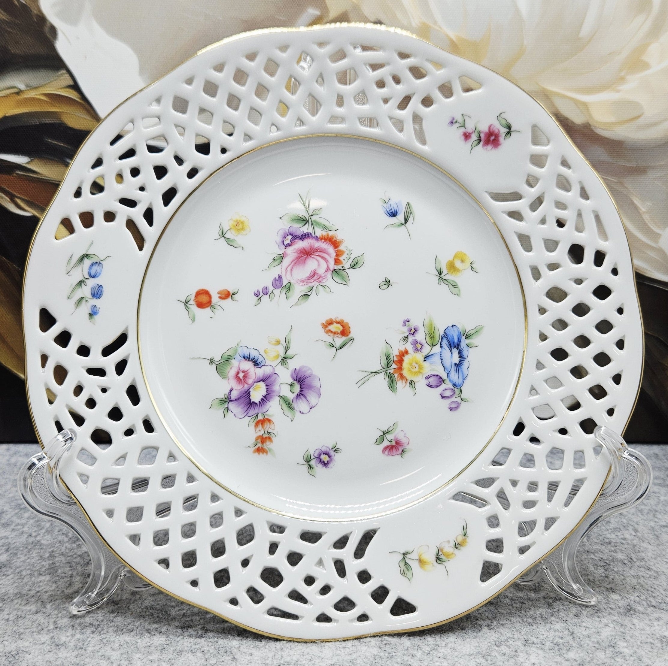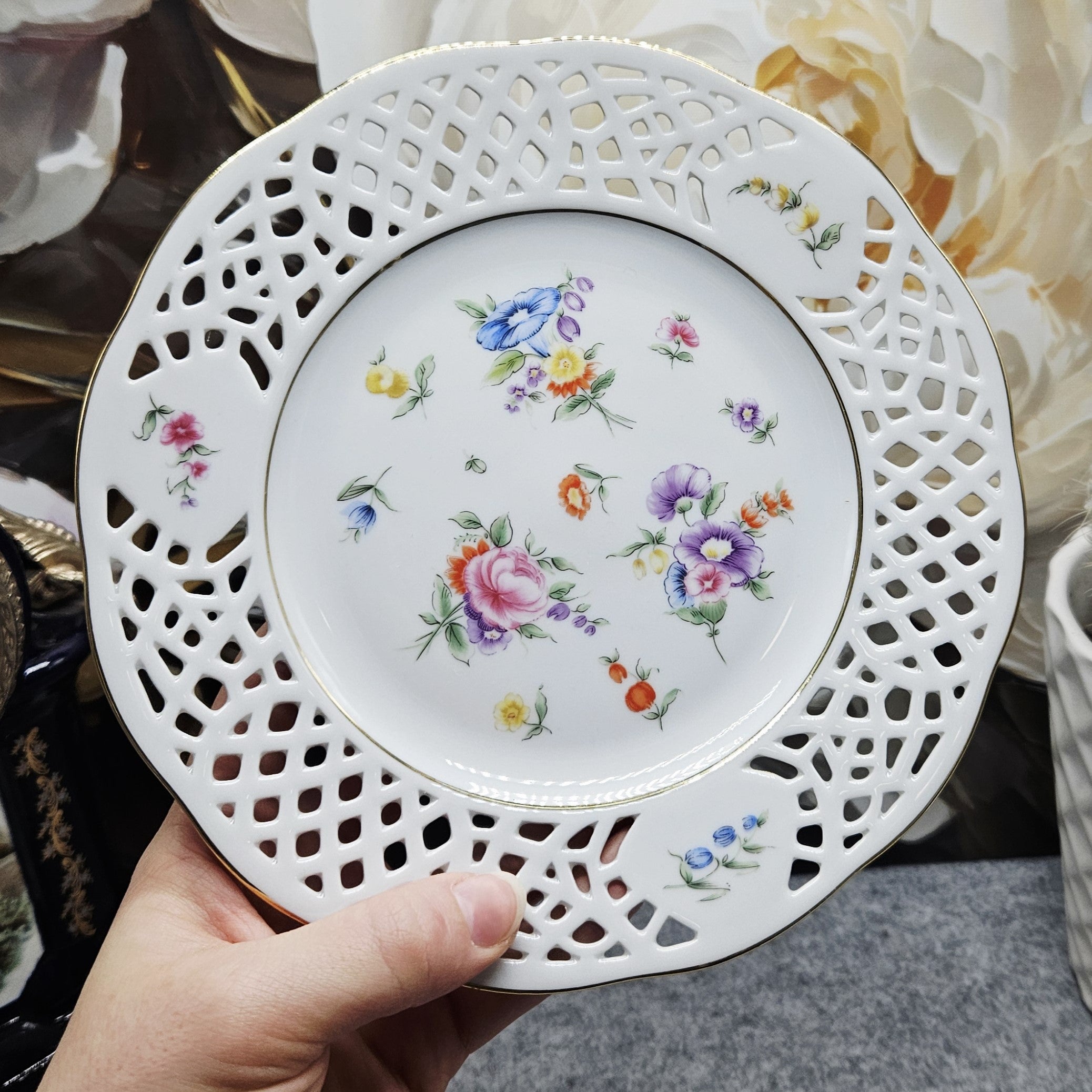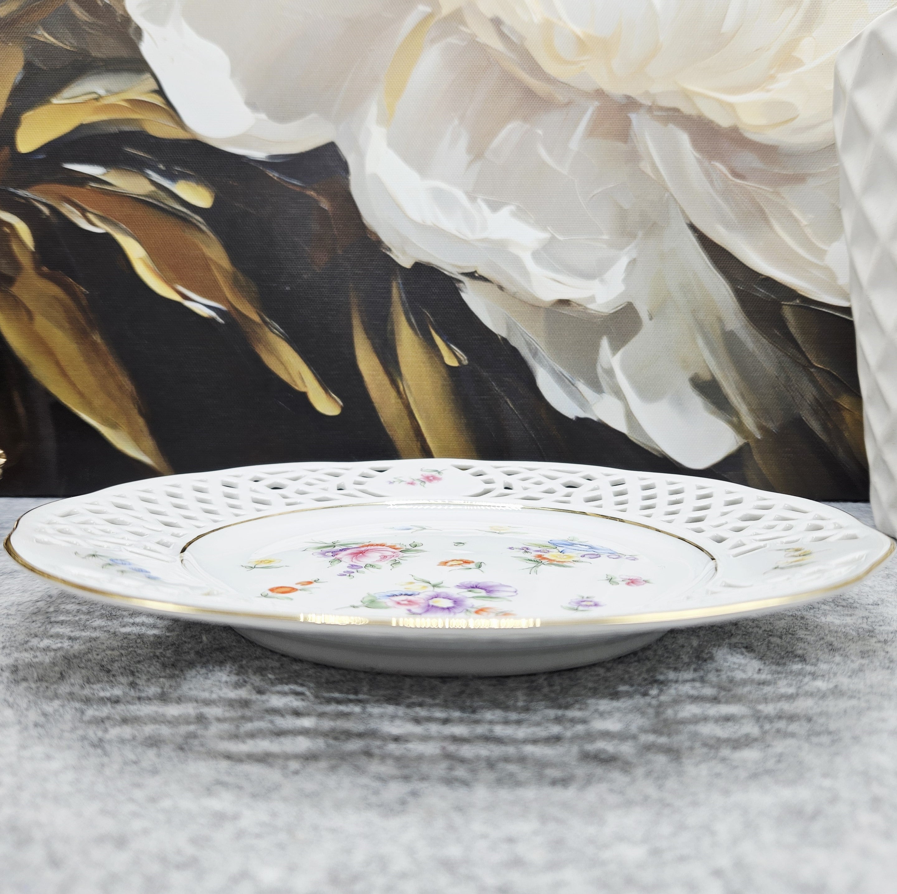 Nuostabi „Burg Lindau“ porceliano lėkštutė, dekoruota ažūriniais, auksuotais kraštelias ir sodo gėlių kompozicijomis. Tiks ir kaip desertinė lėkštė, ir skanėstams patiekti.