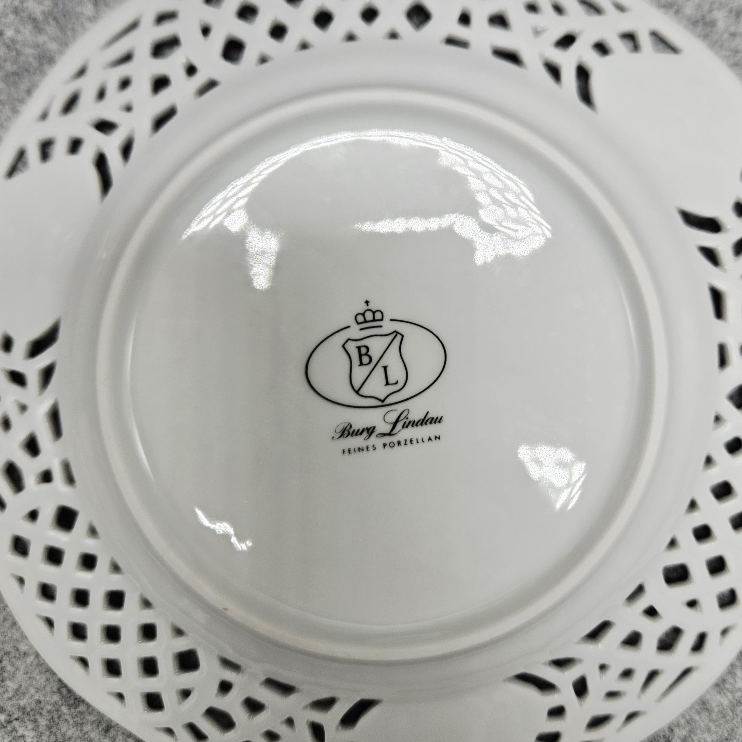 „Burg Lindau“ porceliano lėkštutė ažūriniais krašteliais. Pagaminta apie 1960m. (19cm)