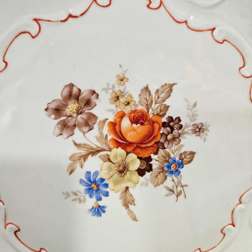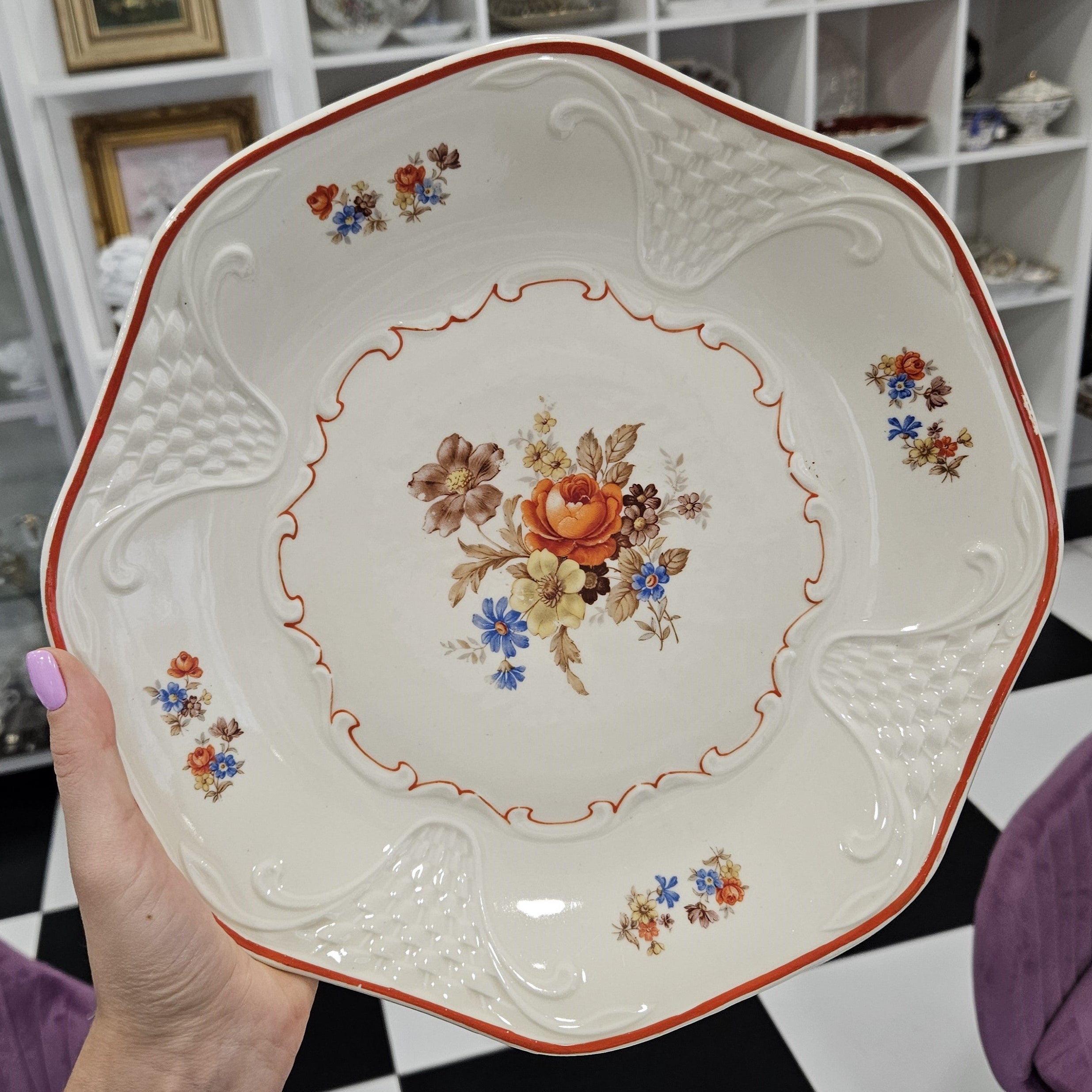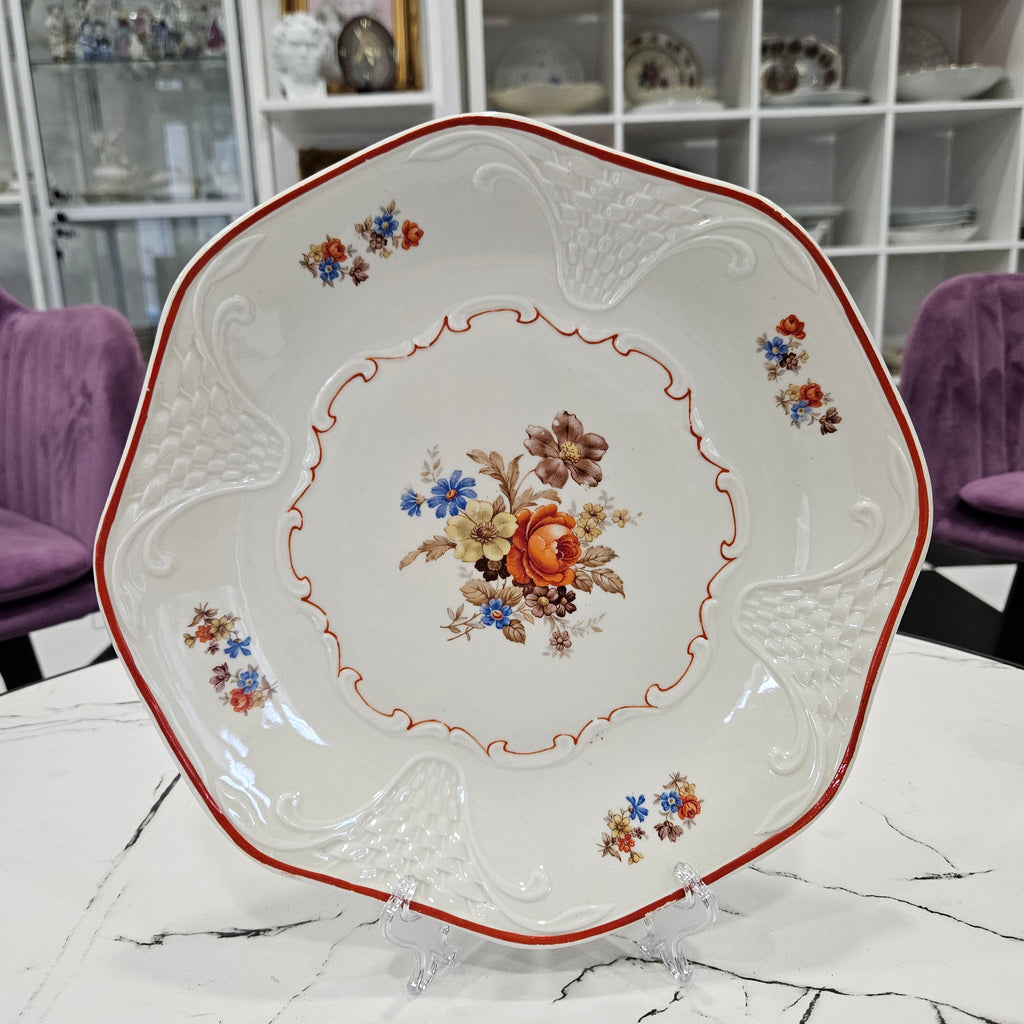 Antikvarinė C.P.C. Coburg porceliano serviravimo lėkštė, dekoruota spalvinga gėlių kompozicija centre. Švelnūs oranžiniai, geltoni ir mėlyni žiedai suteikia šilumos ir klasikinio žavesio, o reljefiniai kraštai bei subtilus apvadas paryškina išskirtinį formos dizainą.