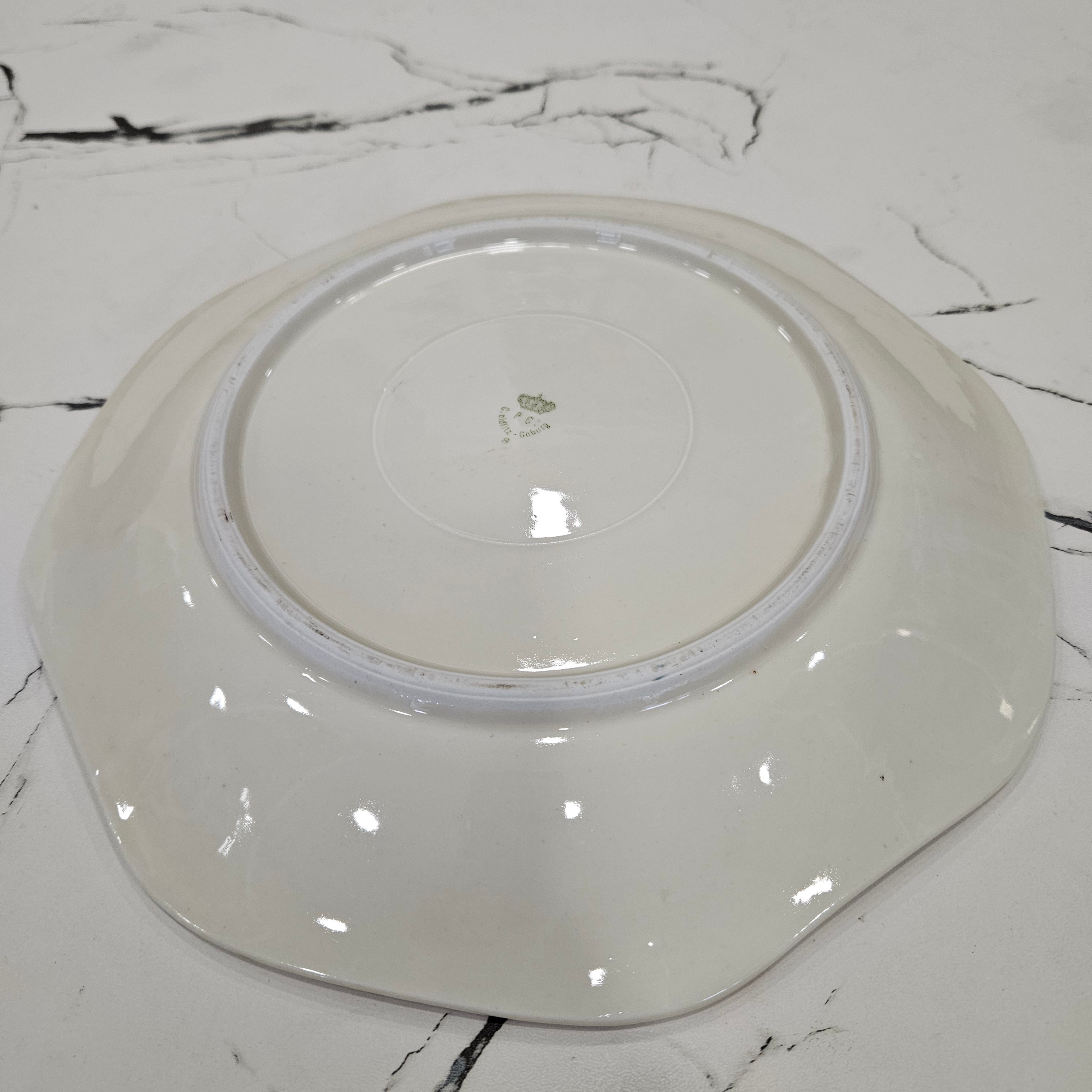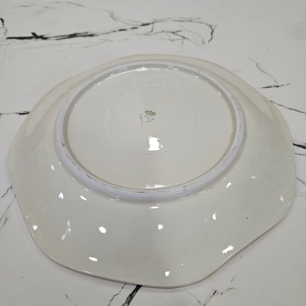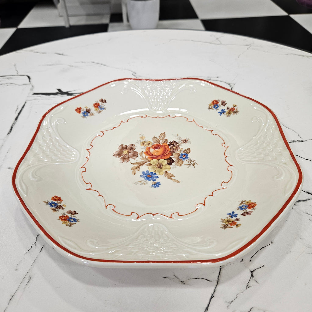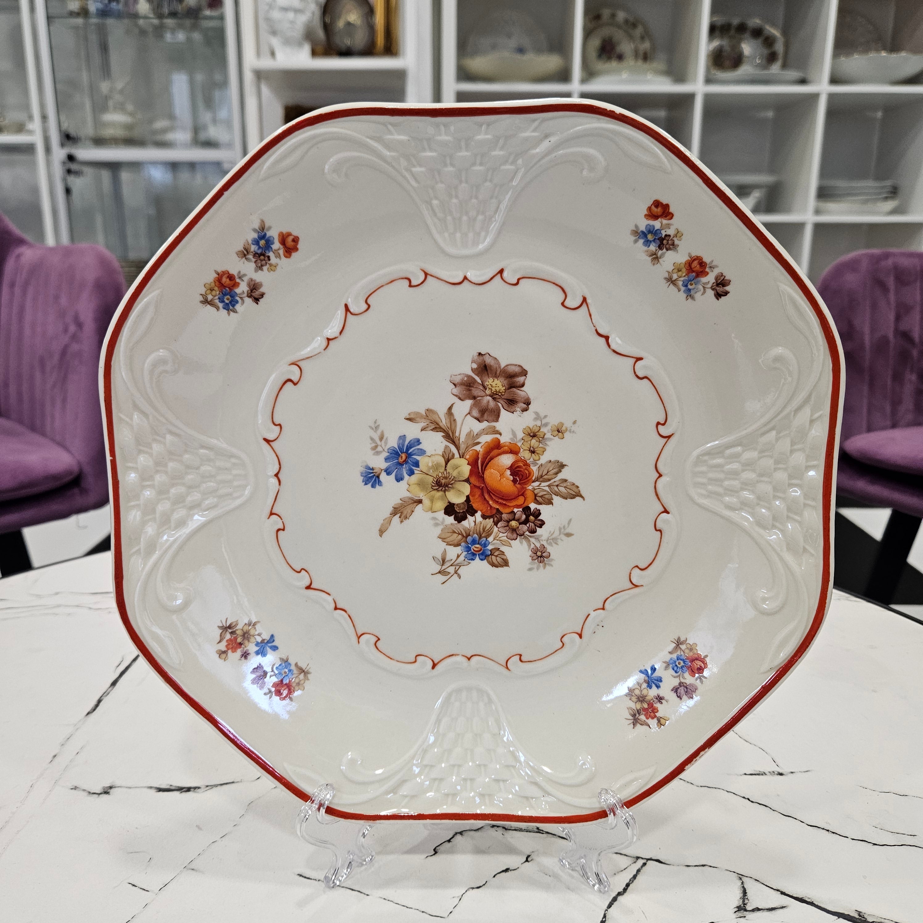 Antikvarinė C.P.C. Coburg porceliano serviravimo lėkštė, dekoruota spalvinga gėlių kompozicija centre. Švelnūs oranžiniai, geltoni ir mėlyni žiedai suteikia šilumos ir klasikinio žavesio, o reljefiniai kraštai bei subtilus apvadas paryškina išskirtinį formos dizainą.