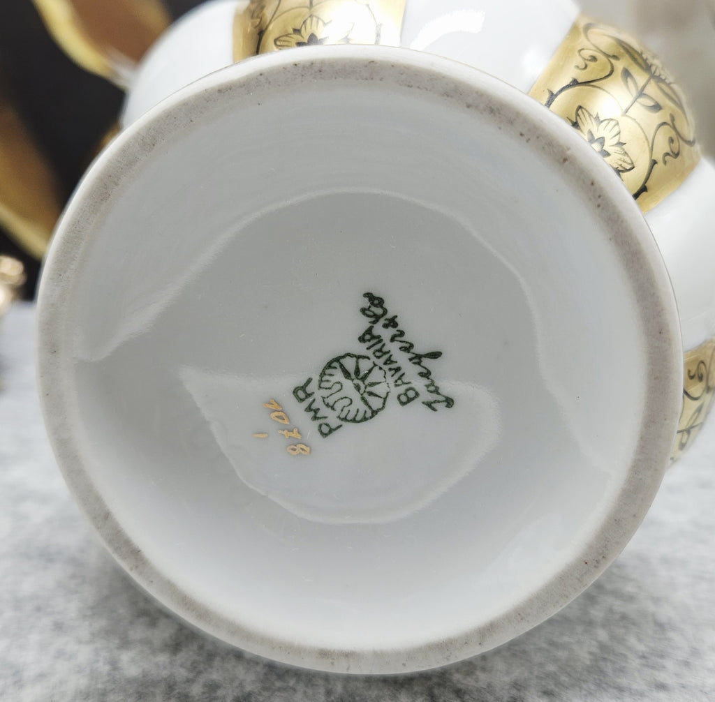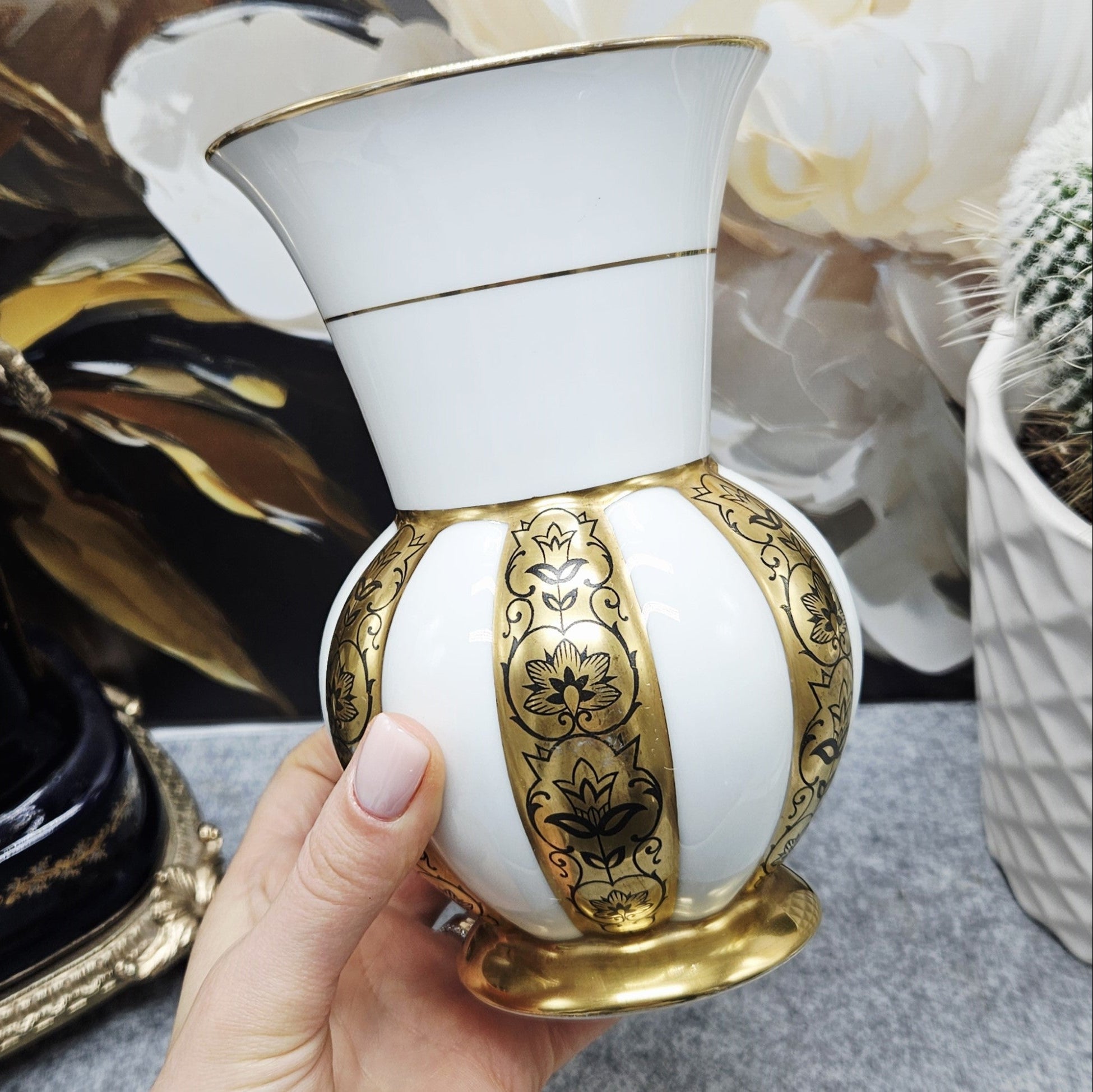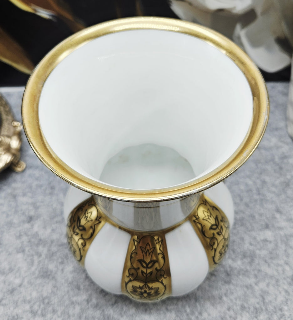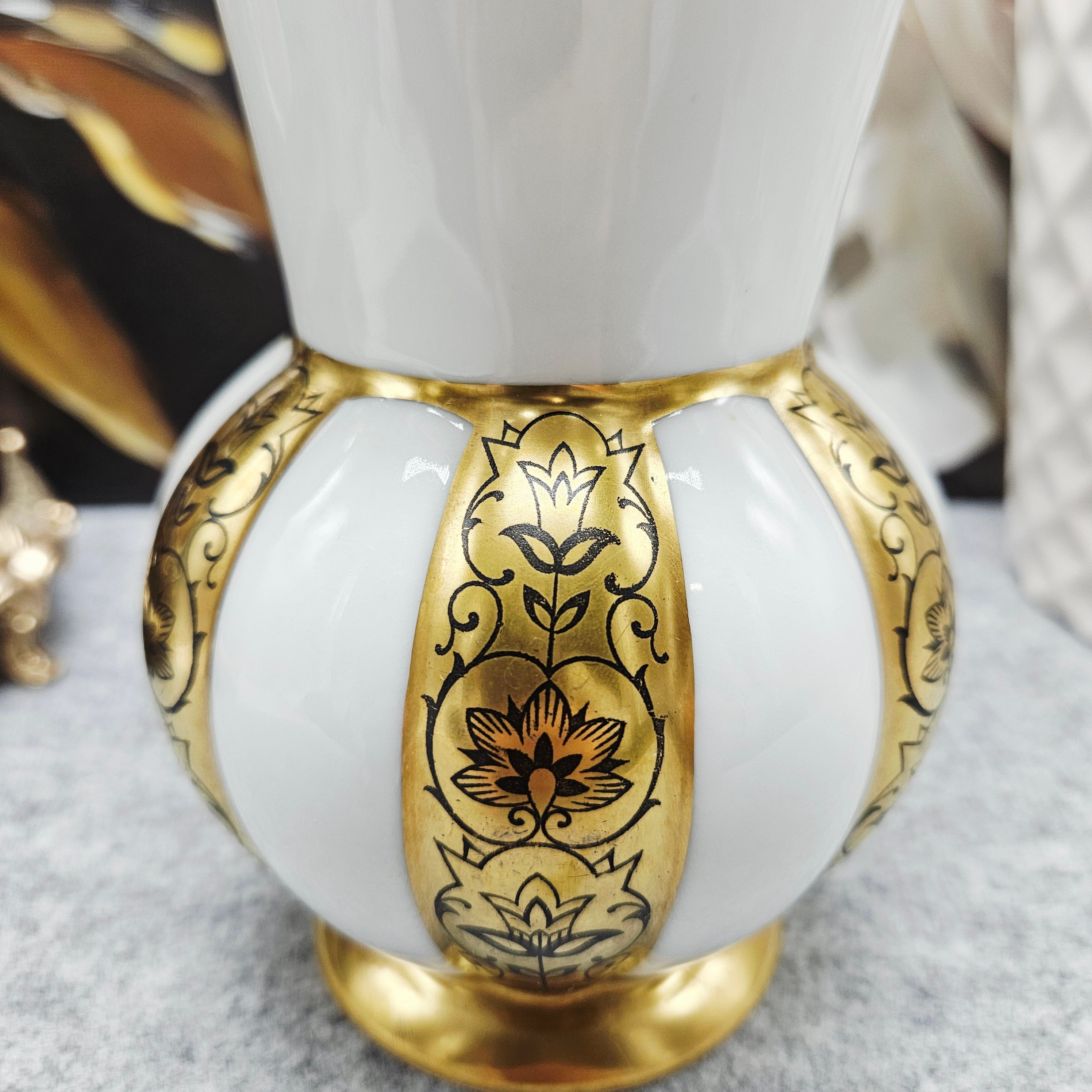 Ši elegantiška "PMR Bavaria Jaeger & Co" porcelianinė vaza yra klasikinio bavarų porceliano pavyzdys, išsiskiriantis prabanga ir meistriška dekoracija. Baltas blizgus porcelianas derinamas su aukso spalvos reljefinėmis juostomis, puoštomis subtiliais juodais gėlių ornamentais. Vazai būdingos švelniai platėjančios formos, o auksinė apdaila ant krašto ir pagrindo suteikia rafinuotumo. Tai dekoratyvinis, reprezentatyvus indas, puikiai tinkantis klasikiniam interjerui ar kolekcijai.