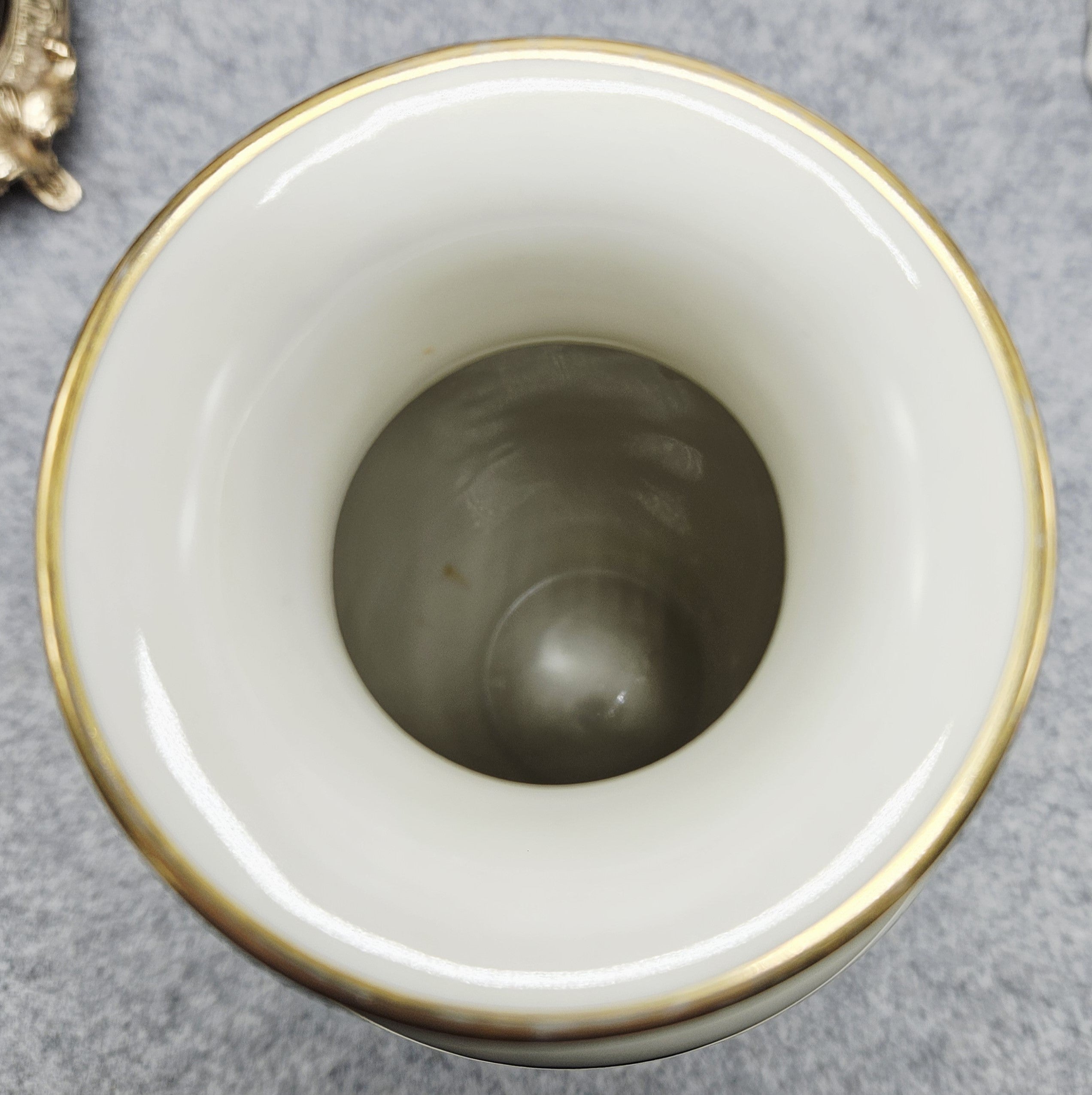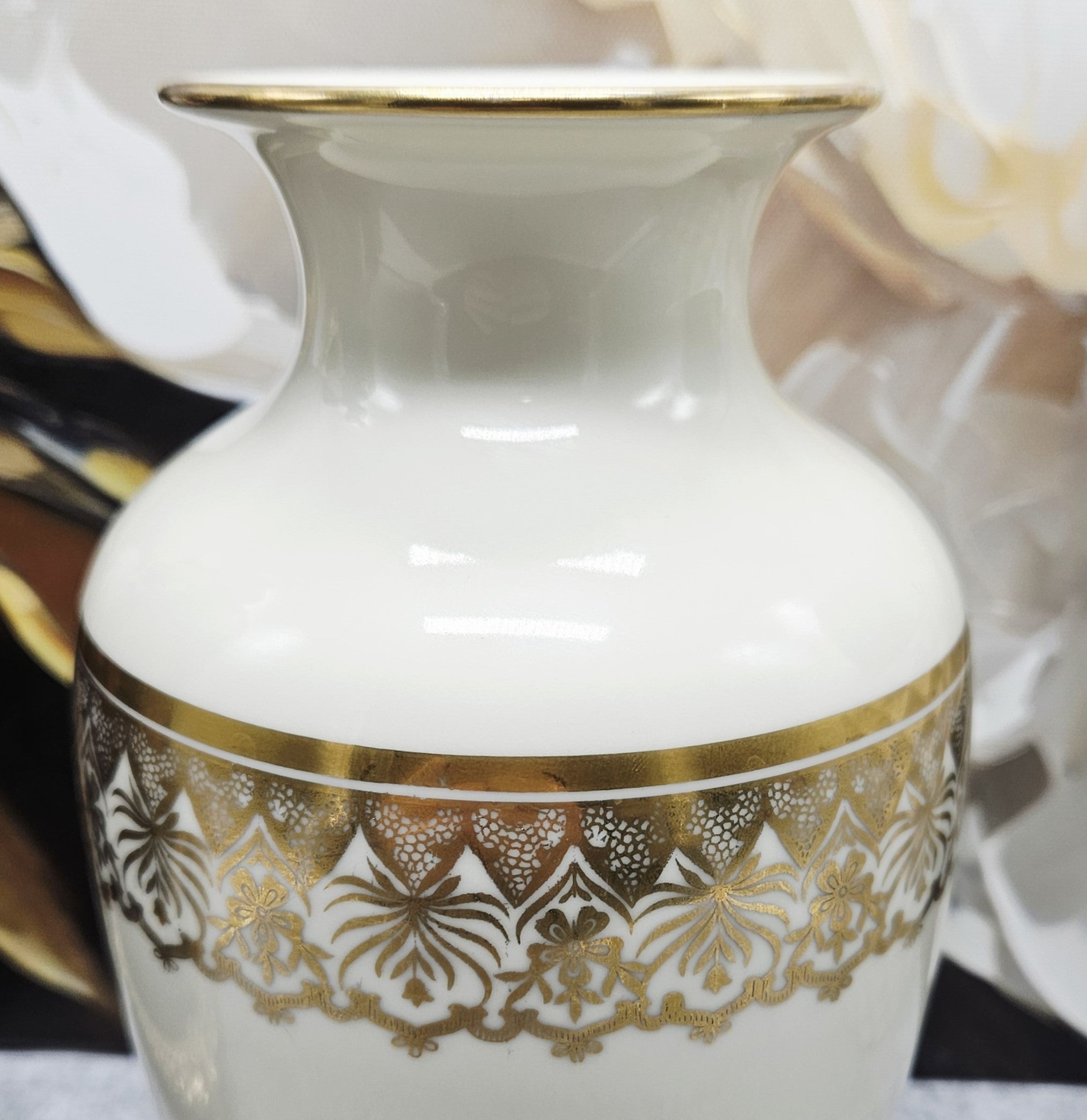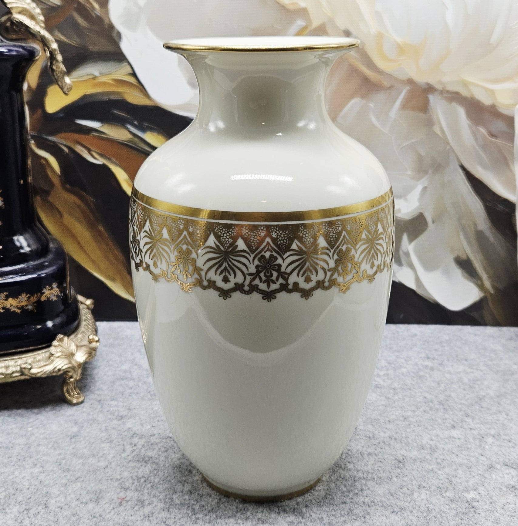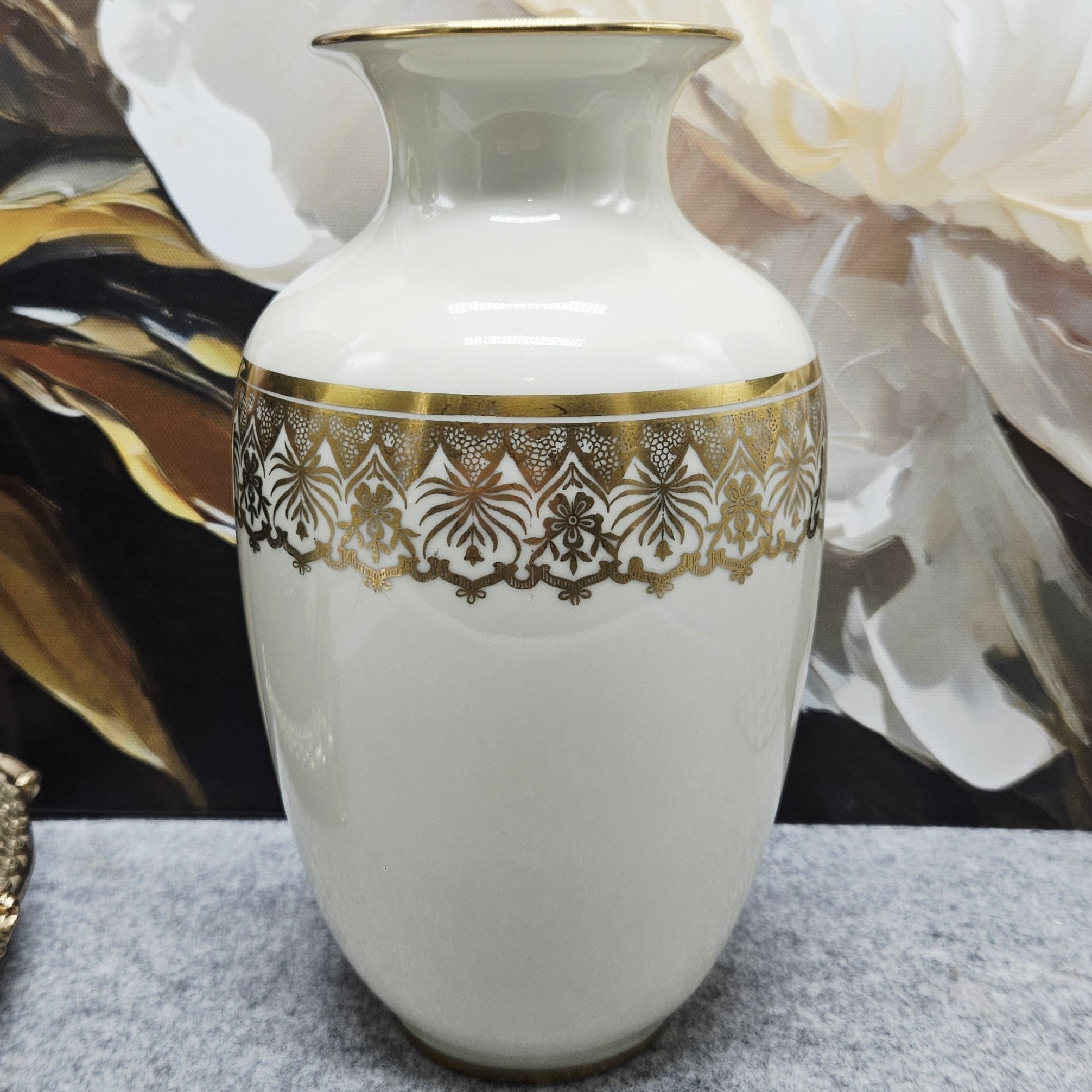 Išskirtinio minimalistinio dizaino porcelianinė vaza, sukurta žinomos Vokietijos manufaktūros „Eschenbach“. Vaza išsiskiria švelniu, klasikinės formos siluetu, subtiliu kreminiu porceliano blizgesiu ir elegantišku aukso ornamentu su gėlių, lapelių ir kaspinų ornamentu.