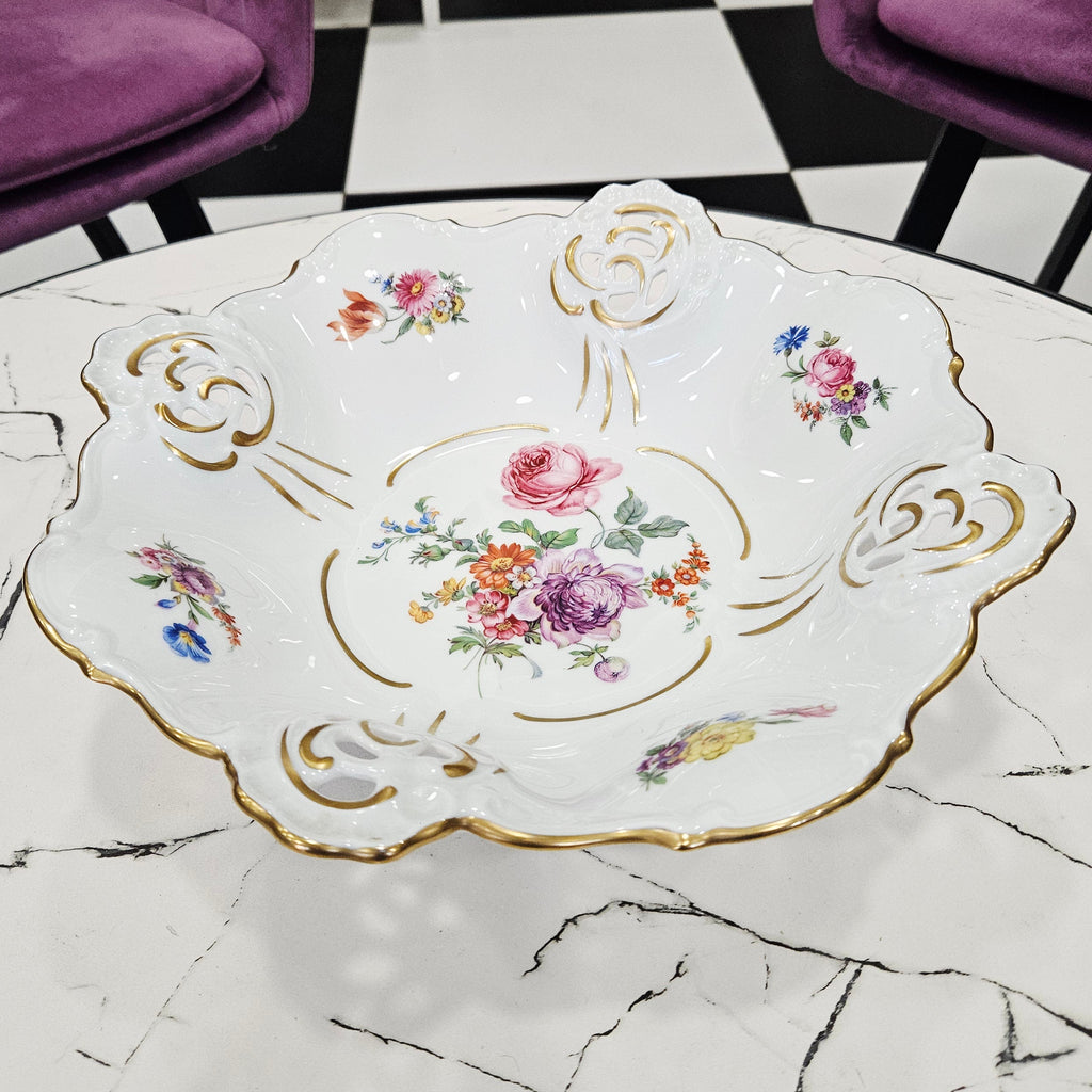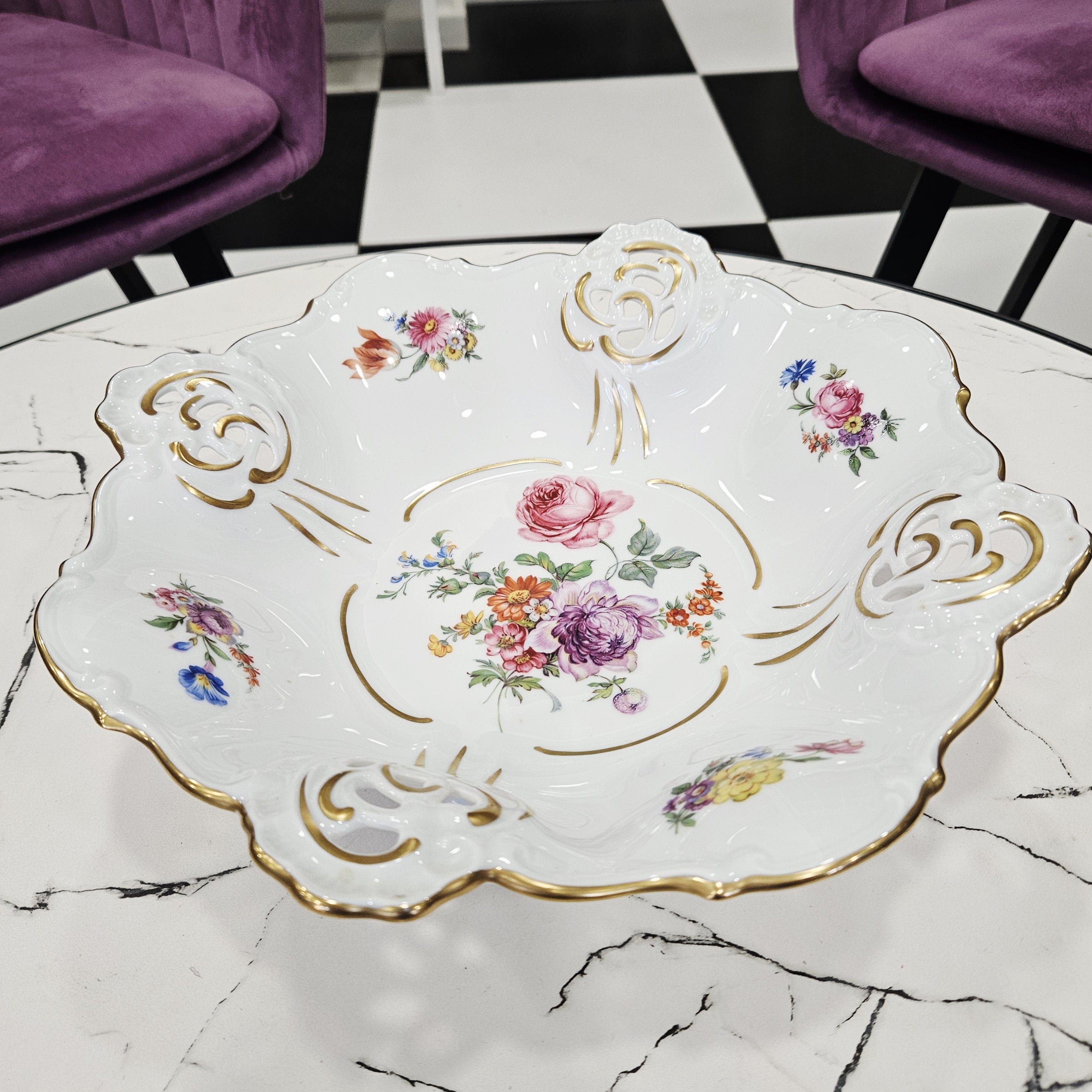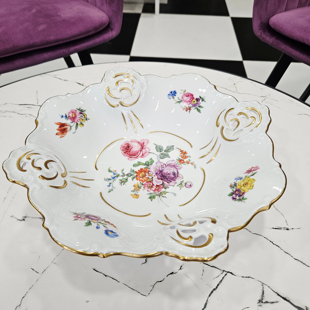 Išskirtinio grožio Weimar Porzellan gamybos porceliano dubuo, pagamintas Vokietijoje. Šis elegantiškas indas puošia kiekvieną stalą savo klasikine forma, ažūriniais kraštais ir prabangiu 24 K aukso dekoru.