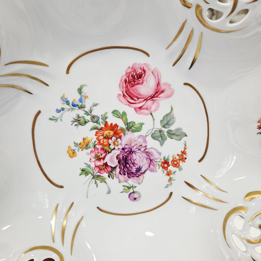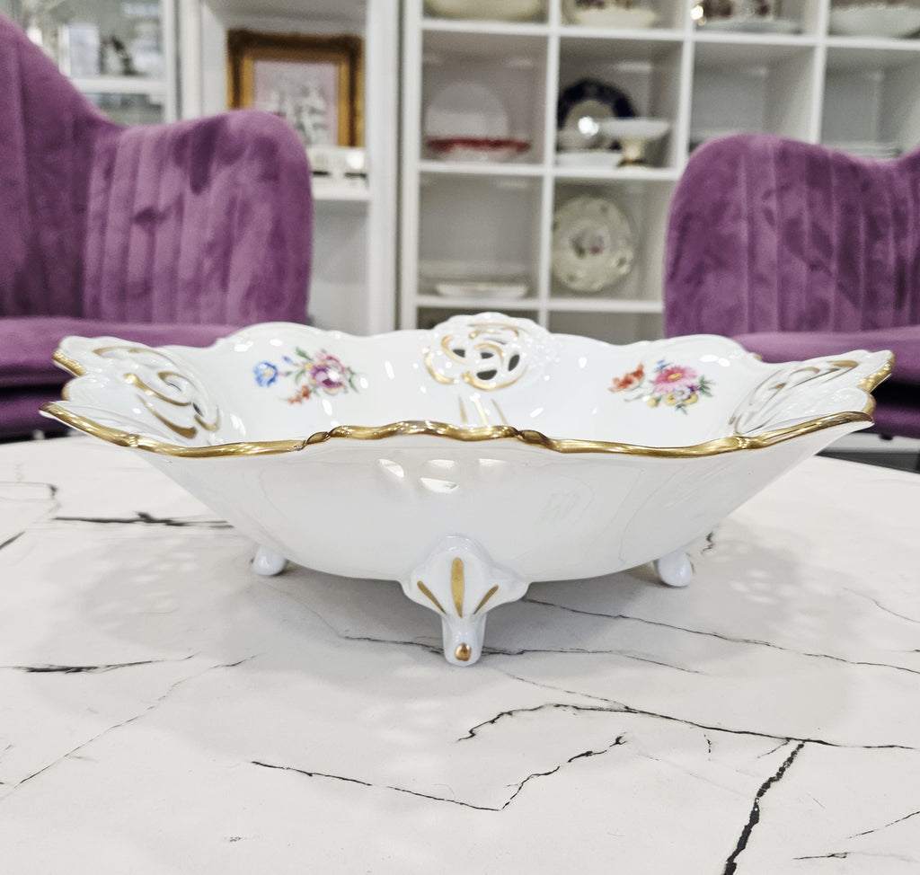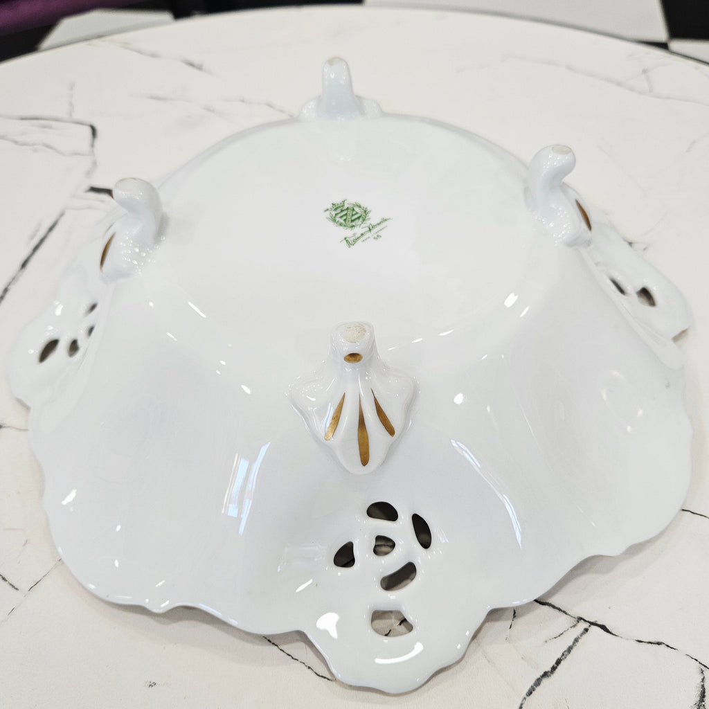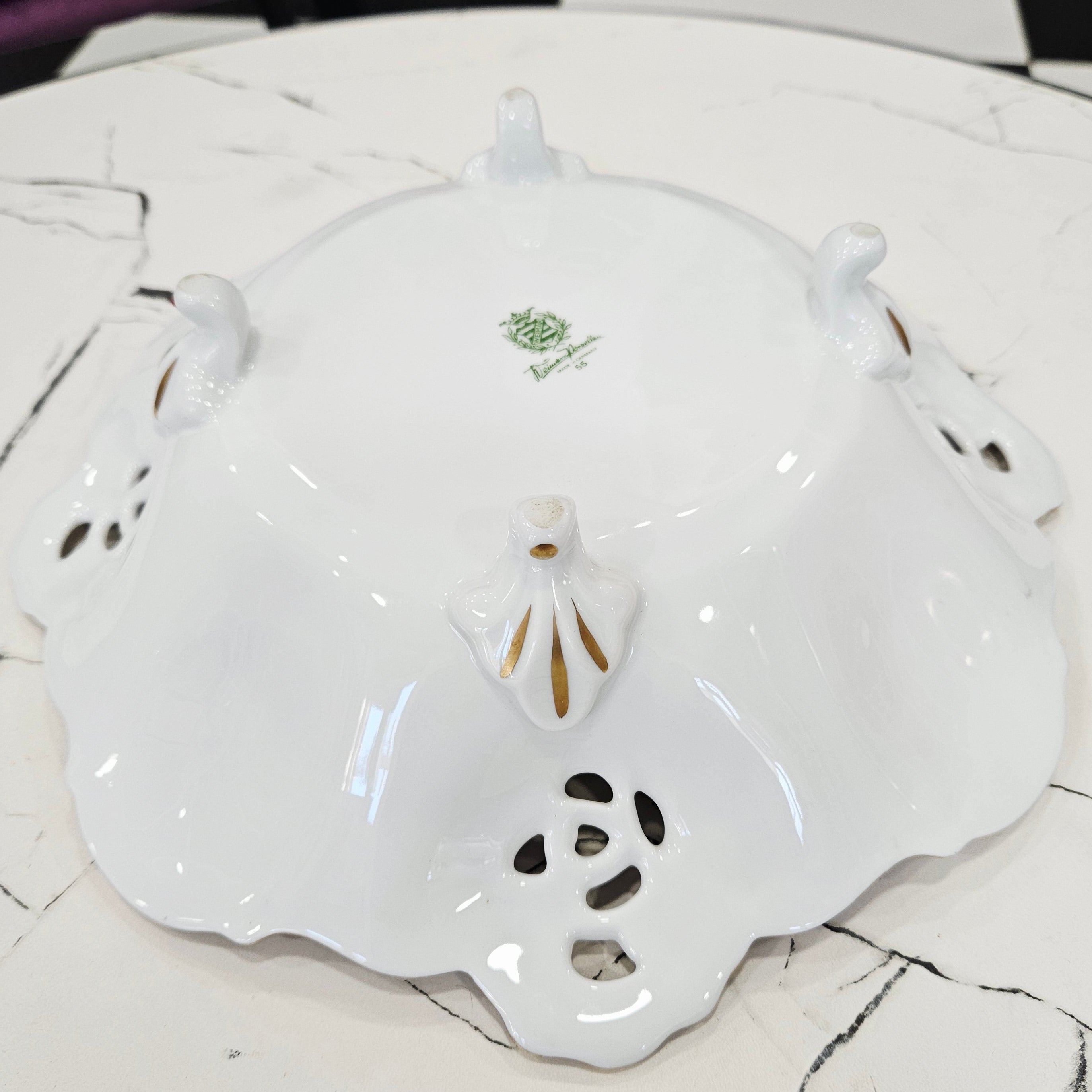 Išskirtinio grožio Weimar Porzellan gamybos porceliano dubuo, pagamintas Vokietijoje. Šis elegantiškas indas puošia kiekvieną stalą savo klasikine forma, ažūriniais kraštais ir prabangiu 24 K aukso dekoru.