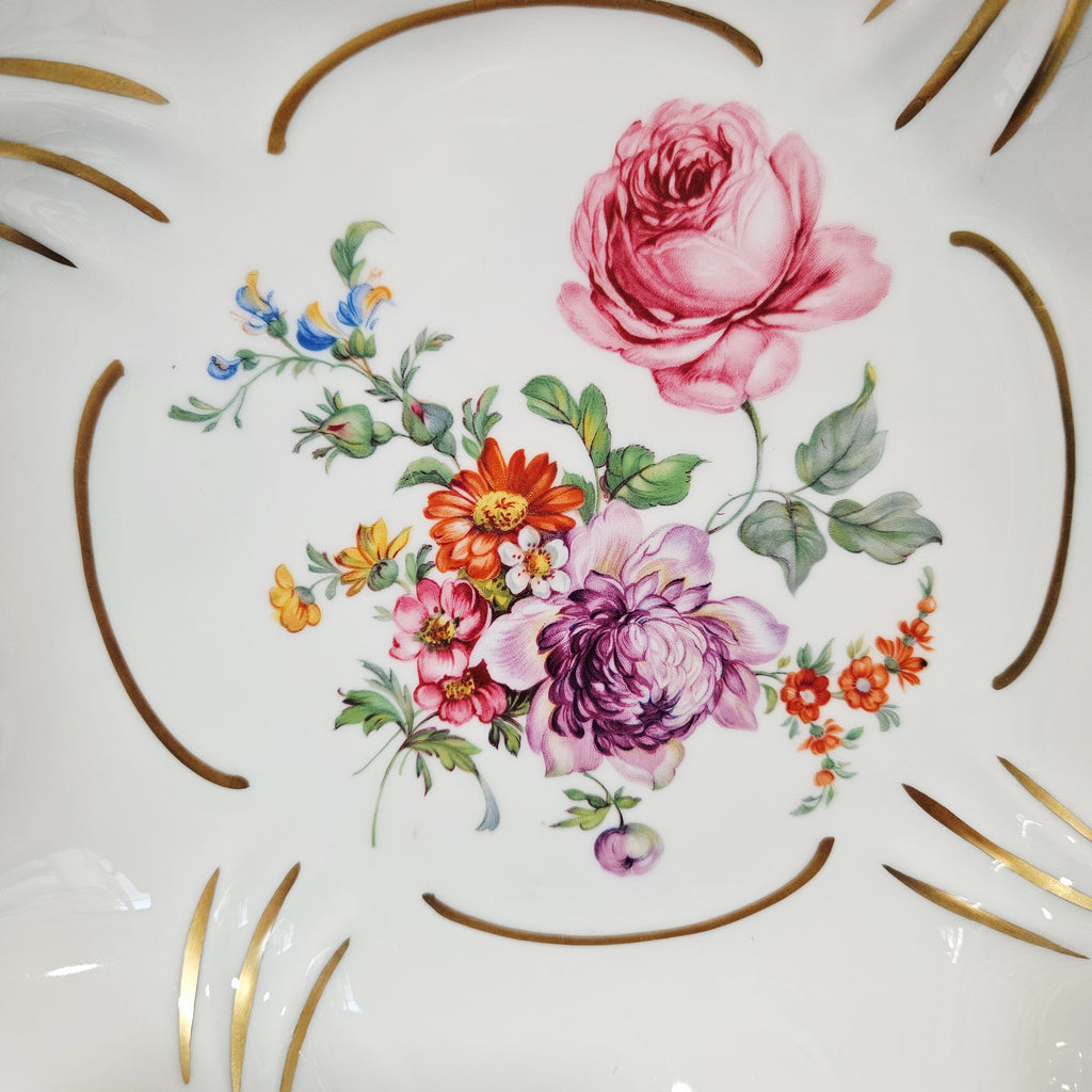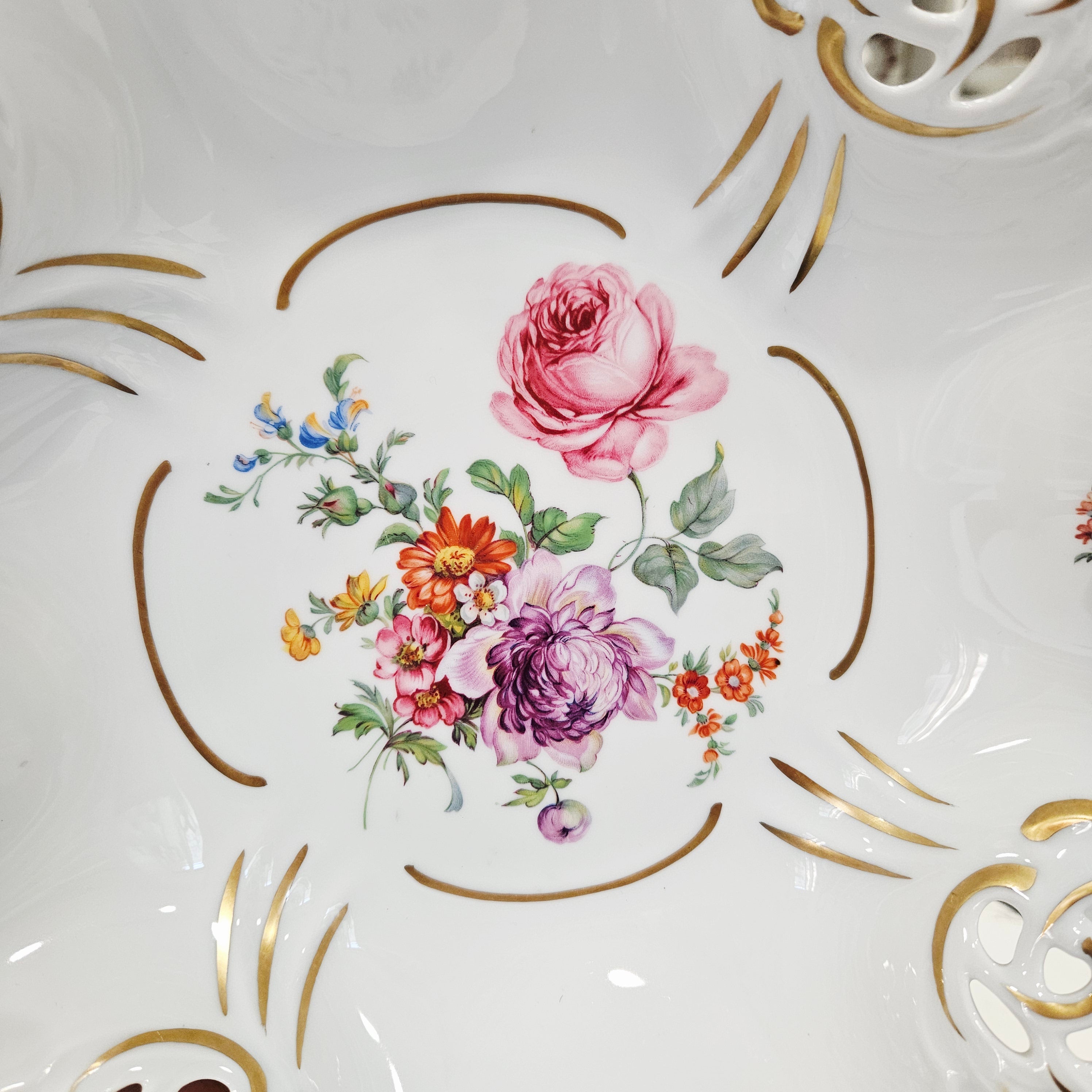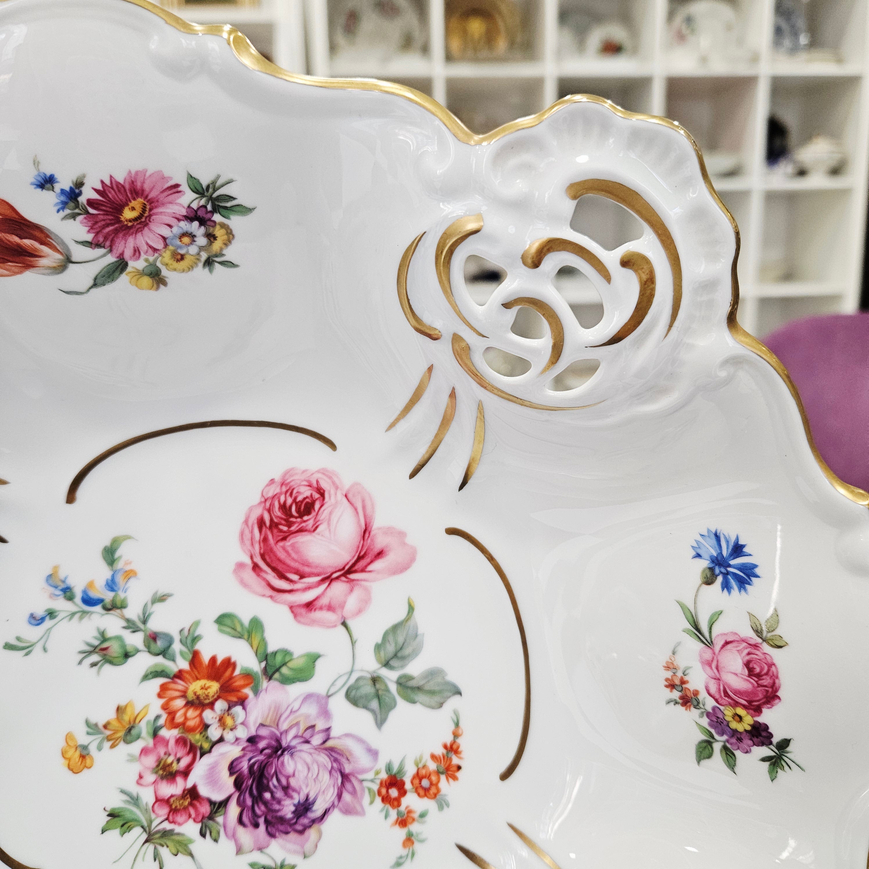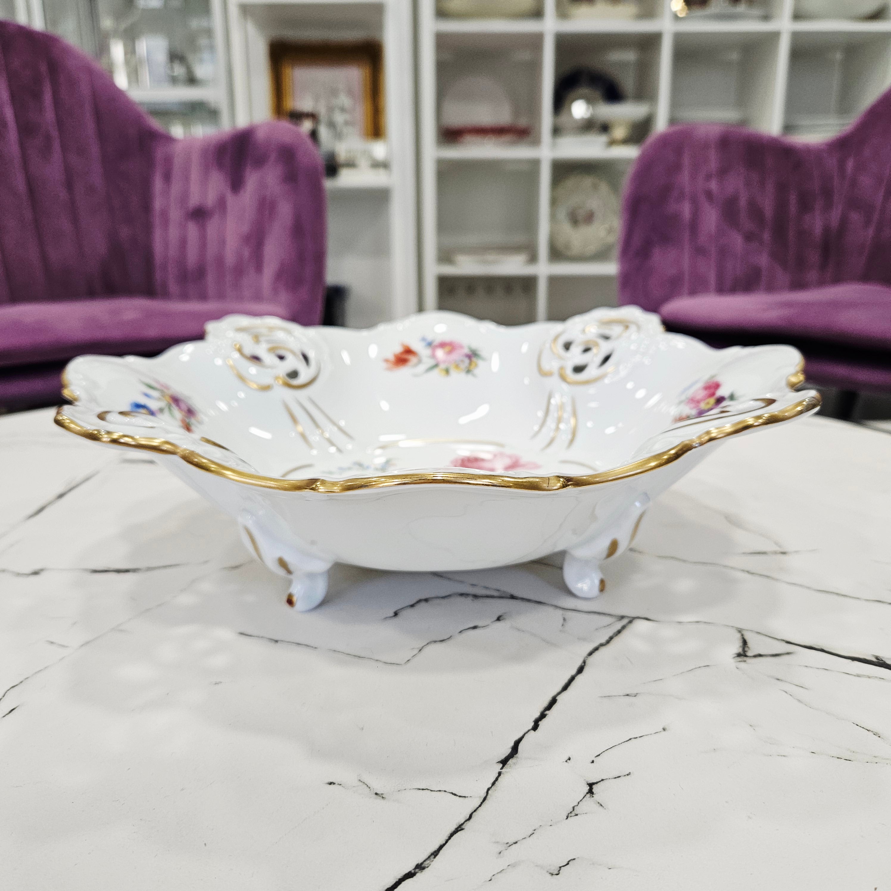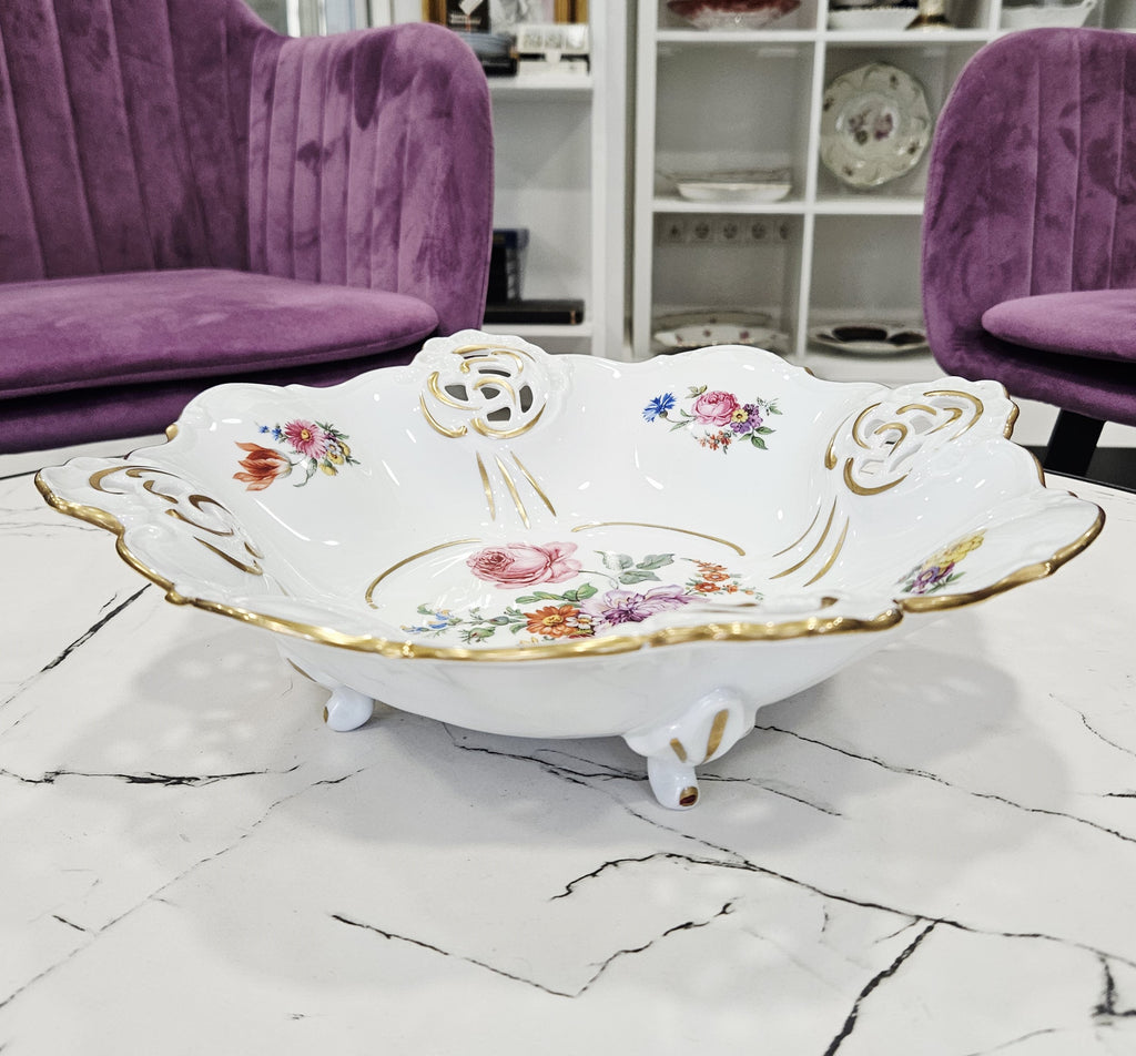 Centrinę dalį ir kraštus puošia gėlių kompozicijos – rožės, chrizantemos, našlaitės bei kiti spalvingi žiedai, perteikiantys vokiškos meistrystės ir romantizmo dvasią. Kraštai subtiliai paauksuoti, o keturios dekoratyvinės kojelės suteikia dubeniui lengvumo ir aristokratiškumo.