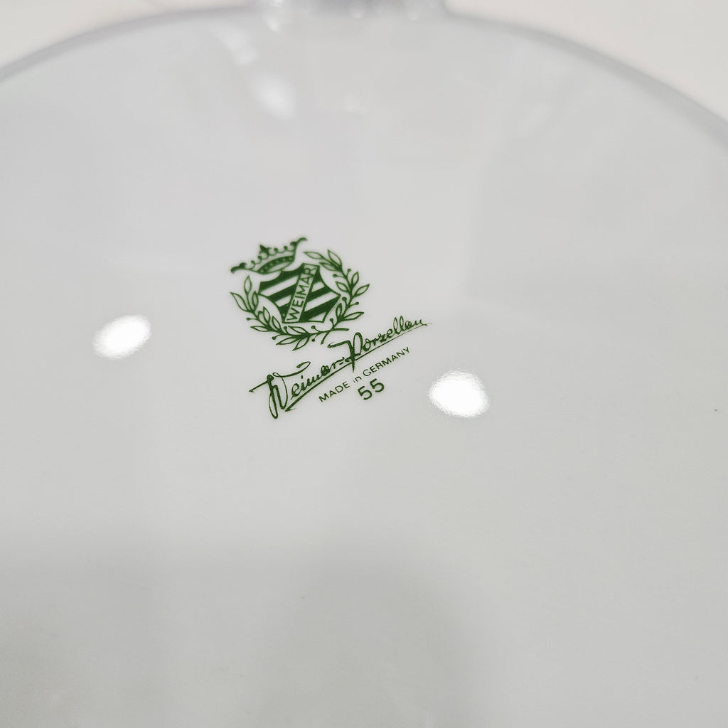 Ant dugno – žalias Weimar Porzellan ženklas su karūna ir užrašu „Made in Germany“, datuojamas XX a. viduriu .