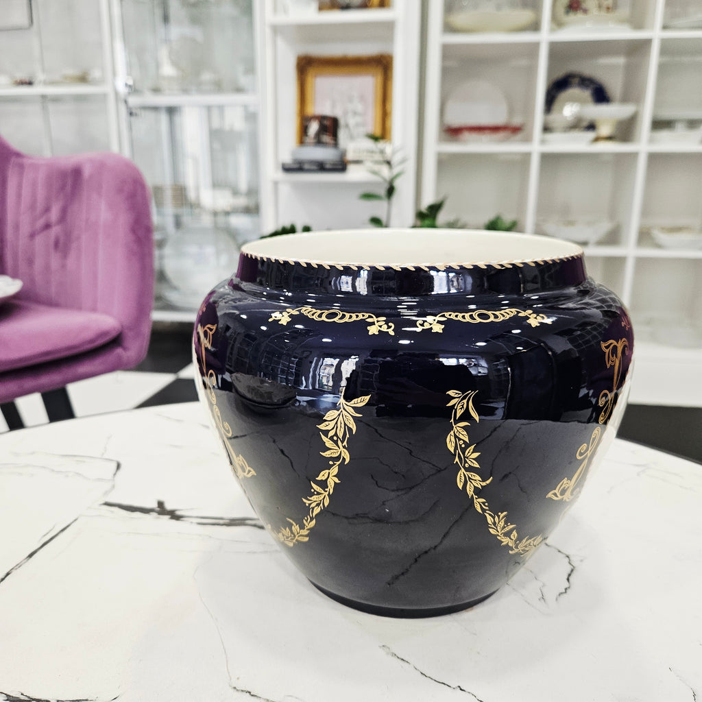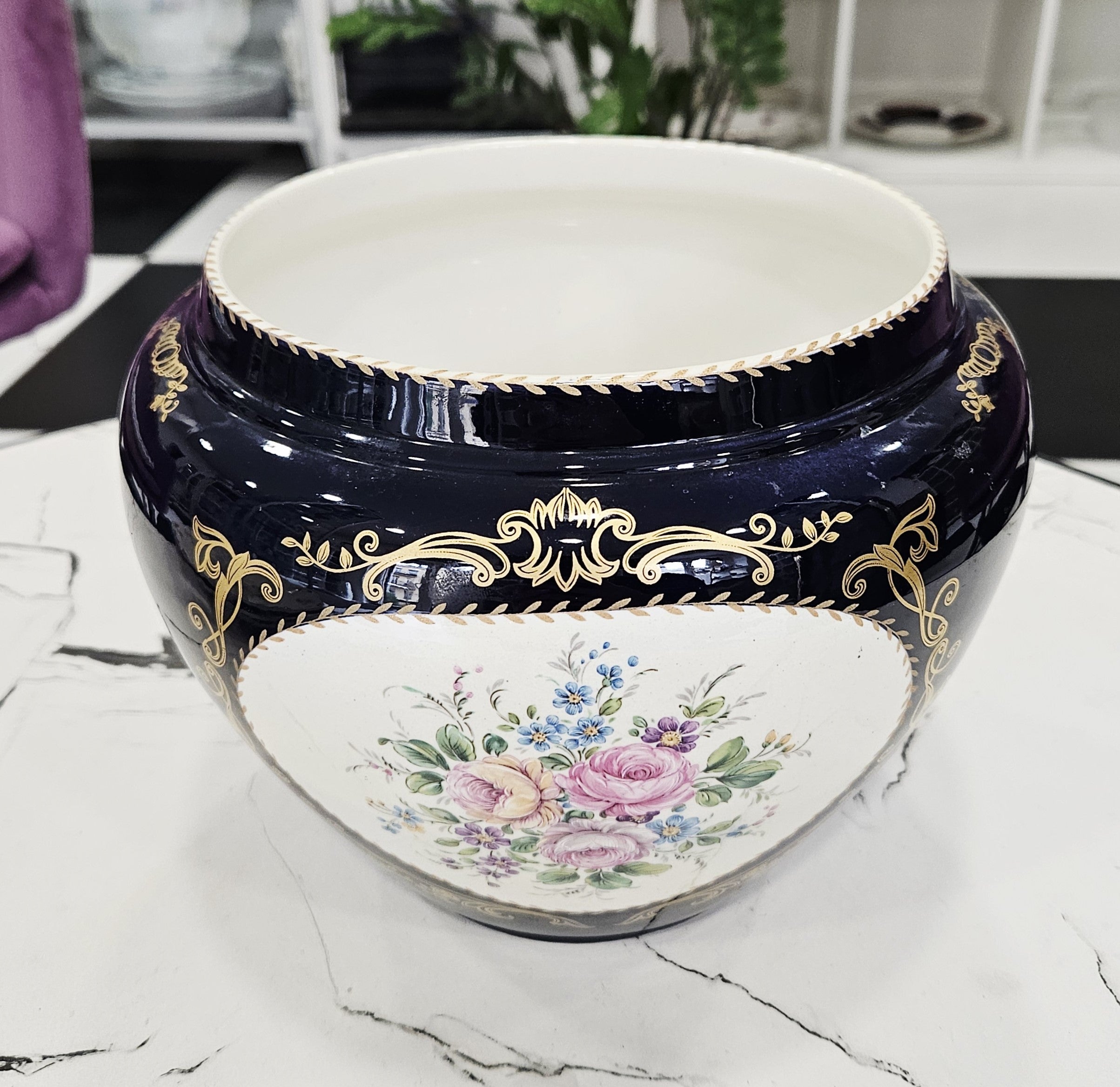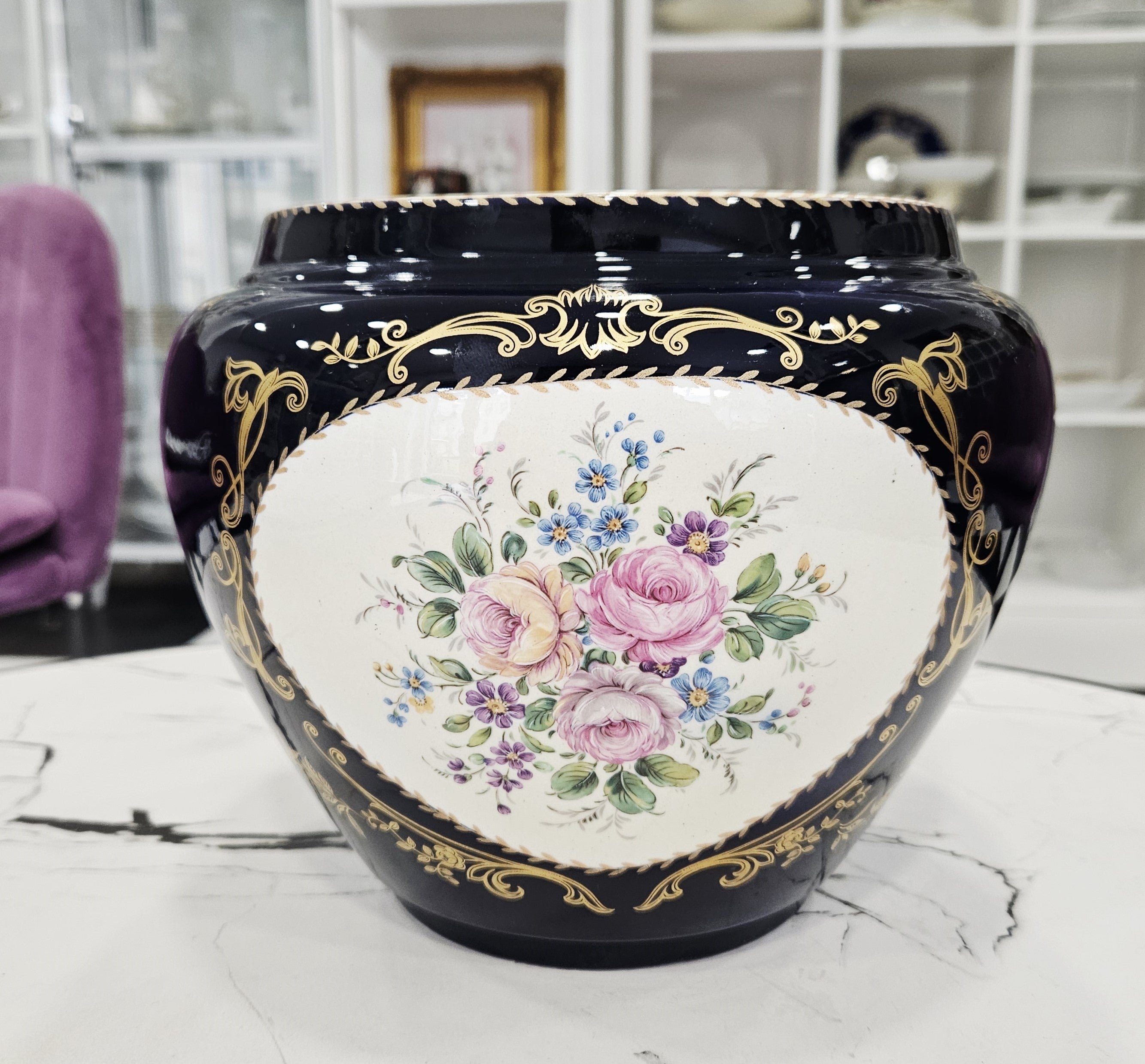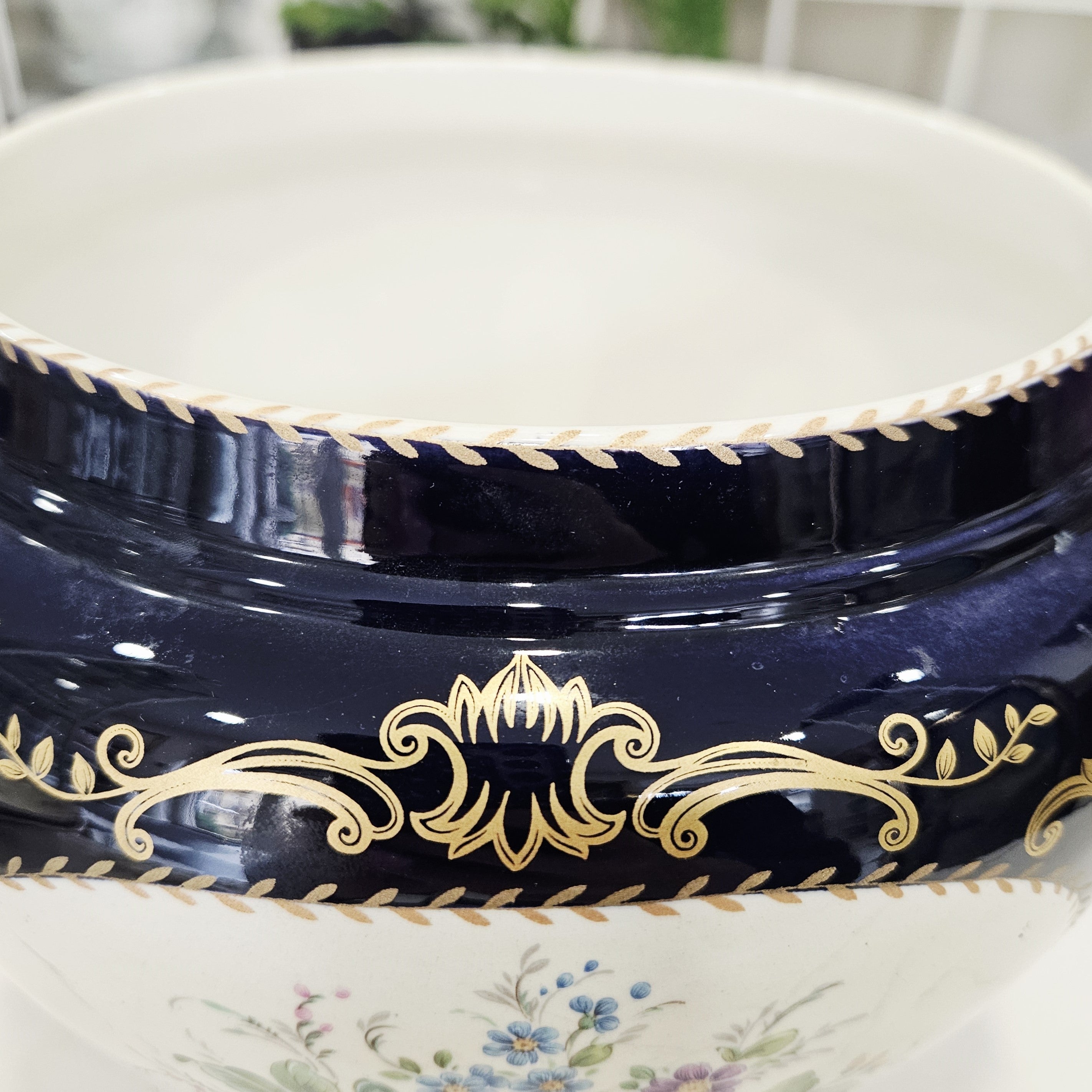 Elegantiškas 1930-ųjų laikotarpio C.A.S. Limoges porceliano dekoratyvinis vazonas (cachepot), pagamintas Prancūzijoje. Gili kobalto mėlyna spalva derinama su gausia aukso dekoracija ir ranka tapytomis polichrominėmis gėlių kompozicijomis abiejose pusėse. Tipiškas tarpukario Limoges stilius – romantiškas, prabangus ir vizualiai labai išraiškingas. Šis kūrinys puikiai tinka kaip interjero akcentas, kolekcijai arba klasikinio dekoro mėgėjui, vertinančiam autentišką prancūzų porceliano meistrystę.