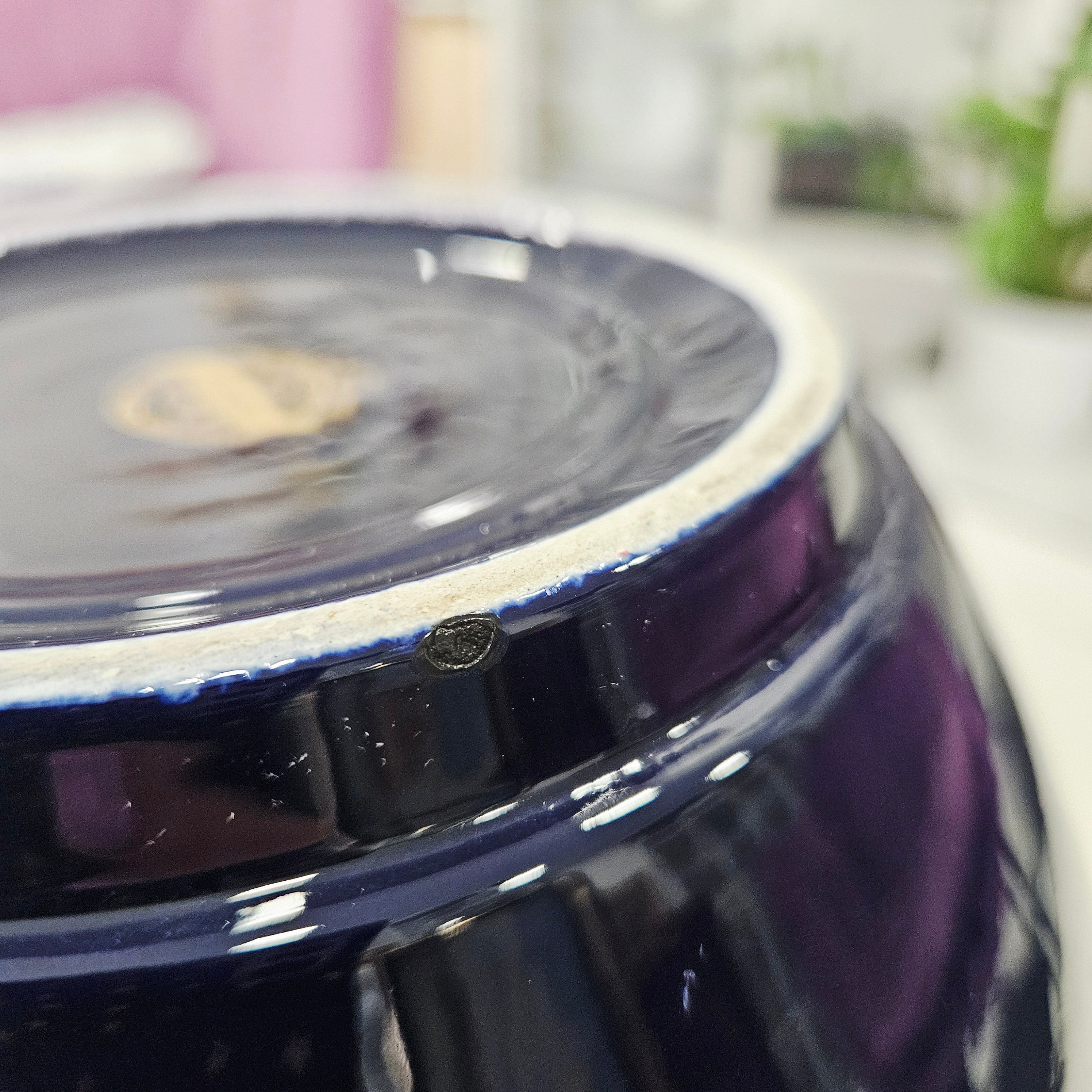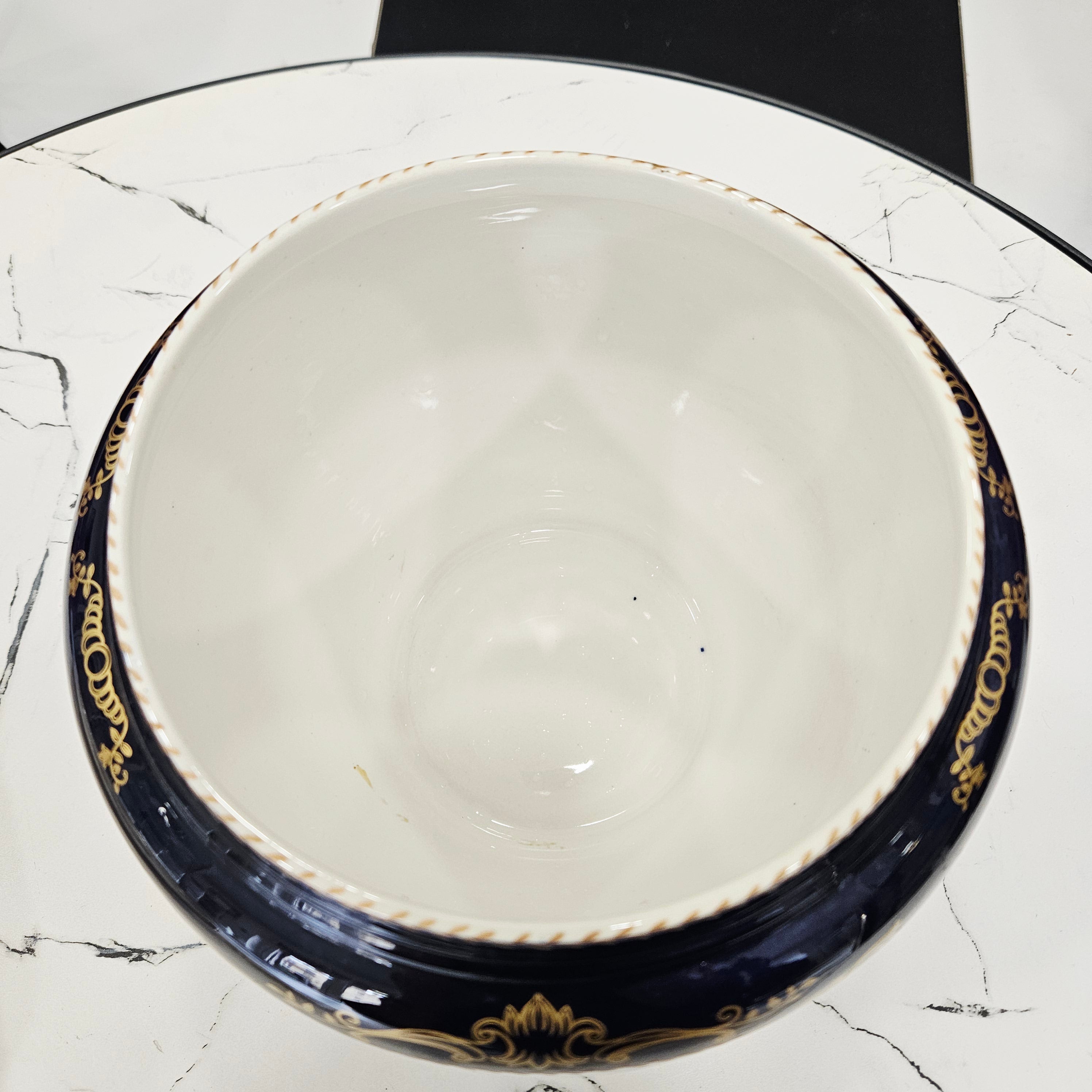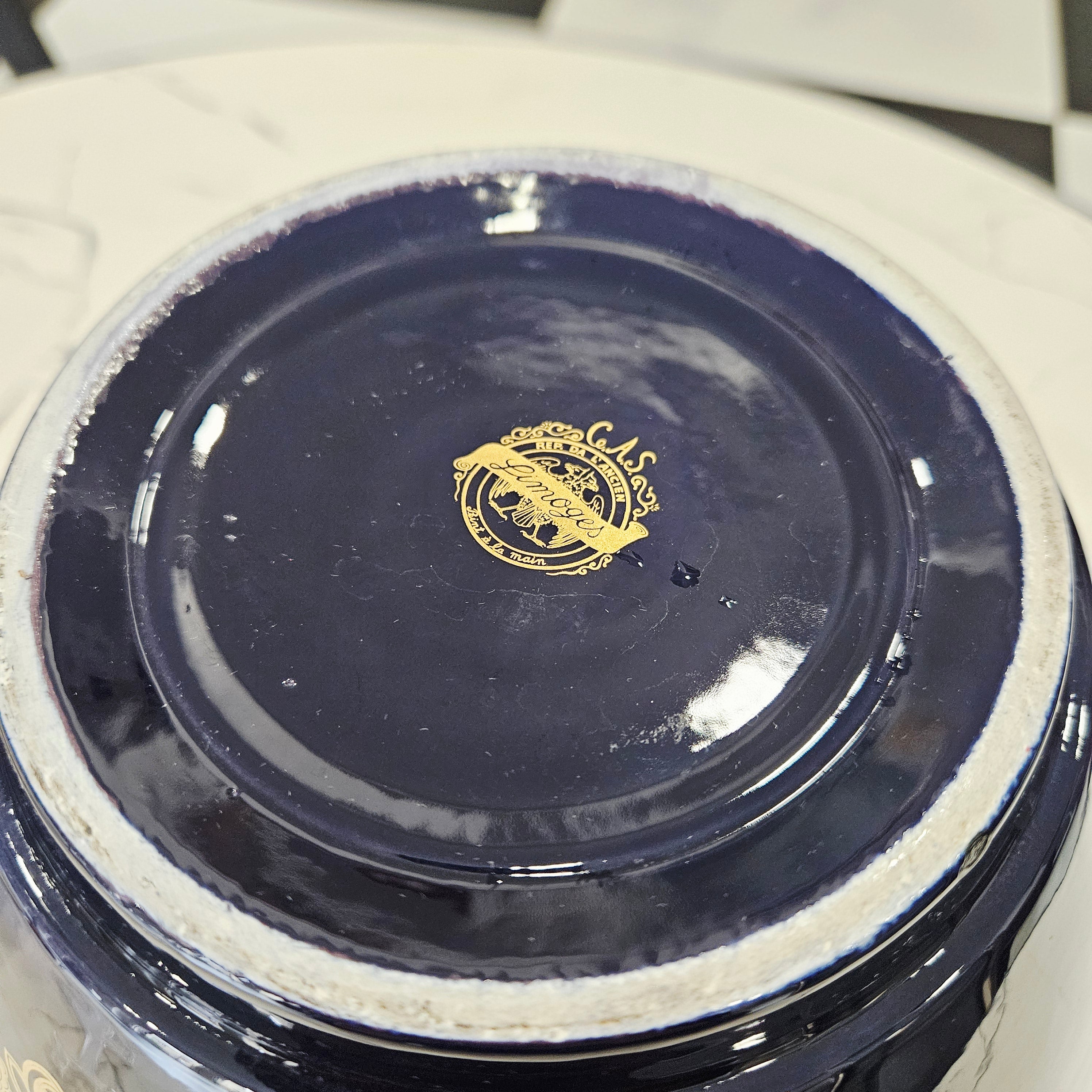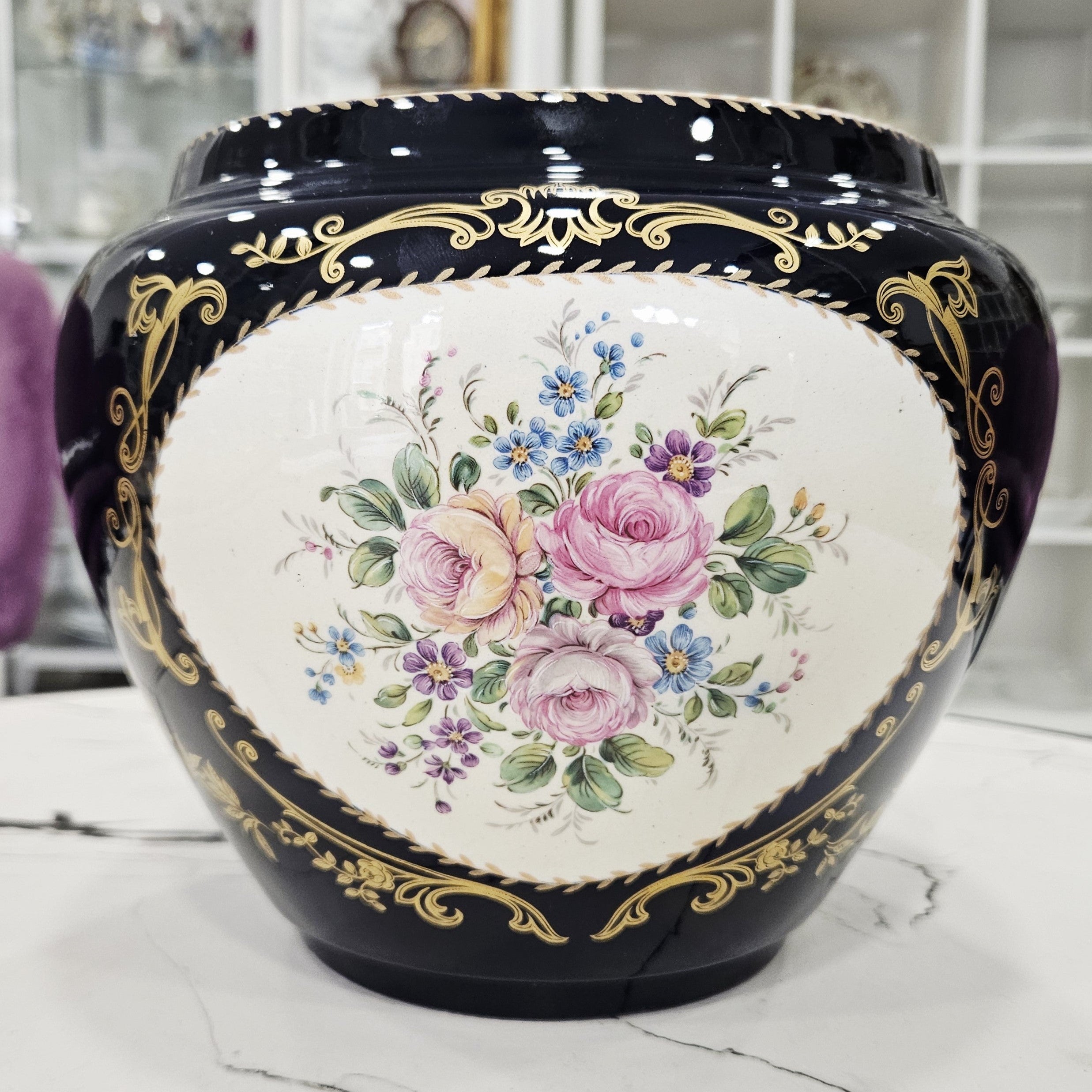 Elegantiškas 1930-ųjų laikotarpio C.A.S. Limoges porceliano dekoratyvinis vazonas (cachepot), pagamintas Prancūzijoje. Gili kobalto mėlyna spalva derinama su gausia aukso dekoracija ir ranka tapytomis polichrominėmis gėlių kompozicijomis abiejose pusėse. Tipiškas tarpukario Limoges stilius – romantiškas, prabangus ir vizualiai labai išraiškingas. Šis kūrinys puikiai tinka kaip interjero akcentas, kolekcijai arba klasikinio dekoro mėgėjui, vertinančiam autentišką prancūzų porceliano meistrystę.