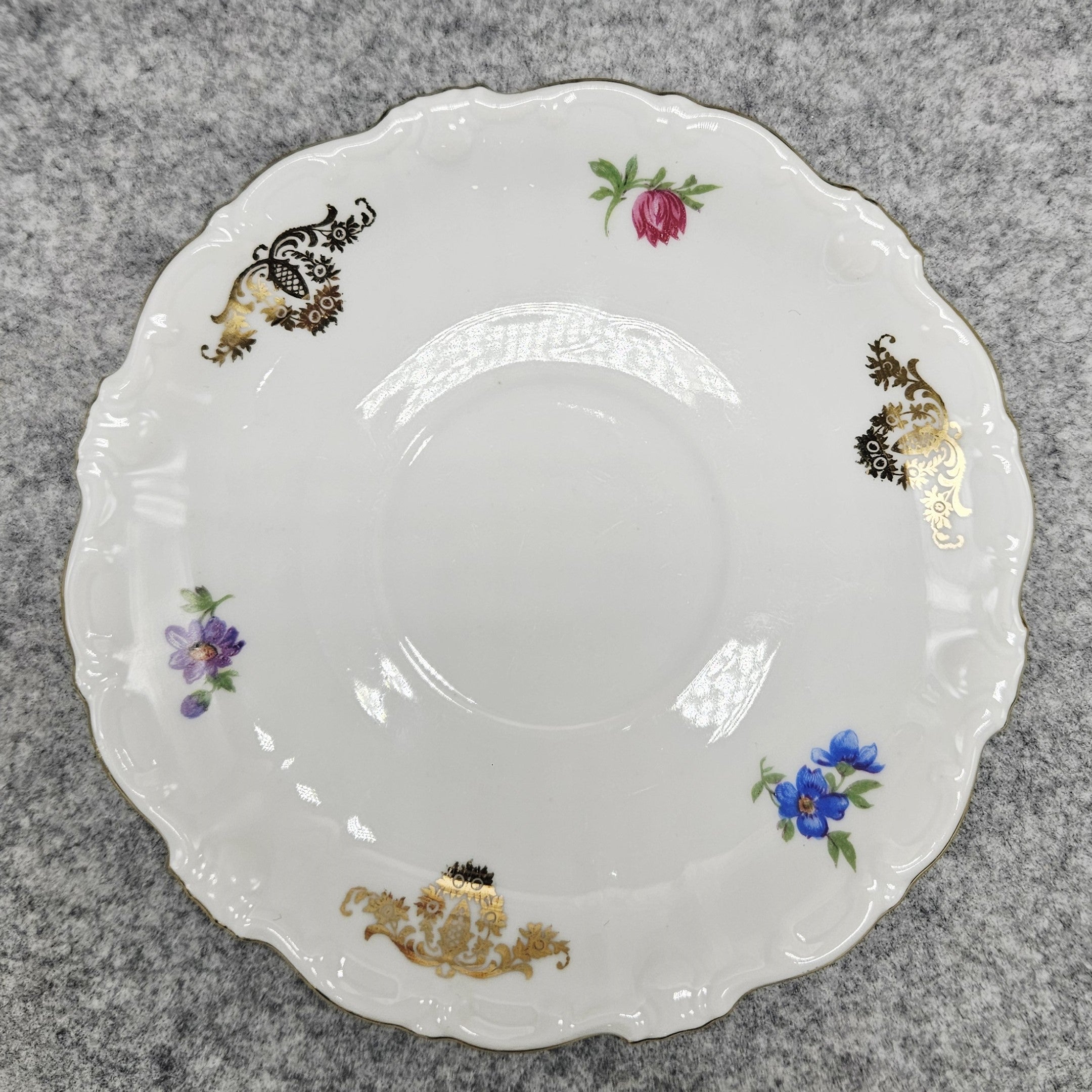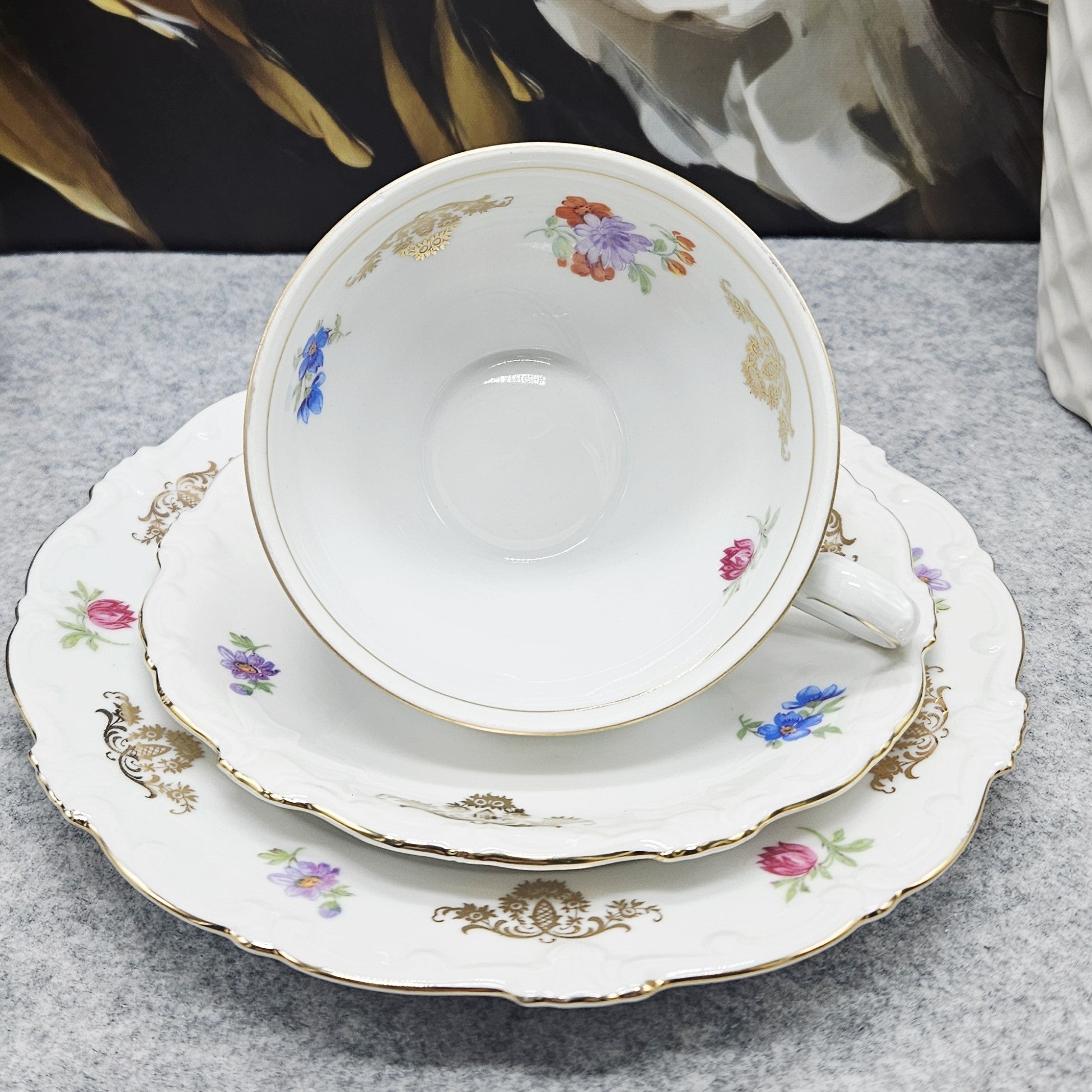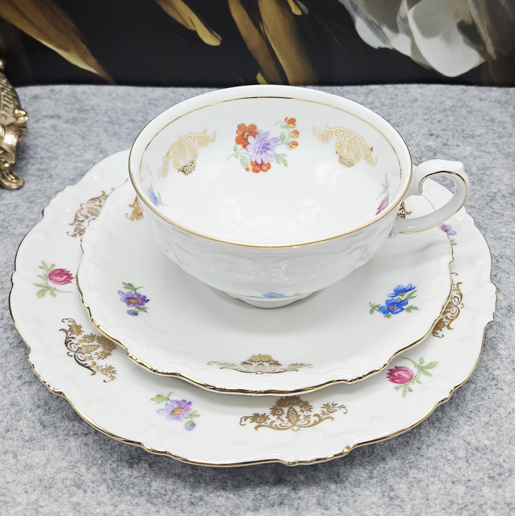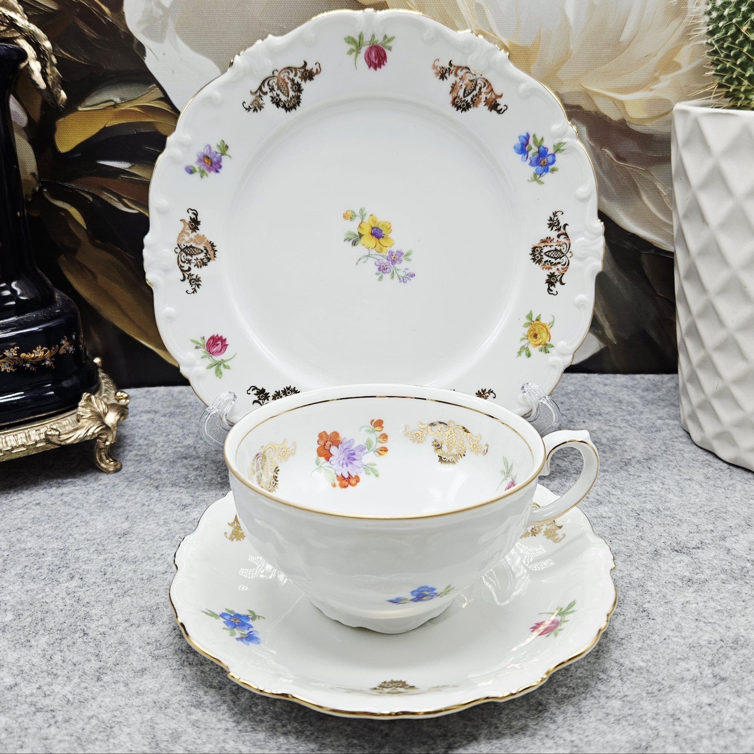 Klasikinis „Schirnding Bavaria“ porceliano trio, išsiskiriantis elegancija ir subtiliu dekoru. Rinkinį sudaro arbatos puodelis, lėkštutė ir desertinė lėkštė, pagaminti iš aukštos kokybės balto bavariško porceliano. Formos grakščios, su švelniai banguotais kraštais, būdingais tradiciniam vokiškam stiliui.