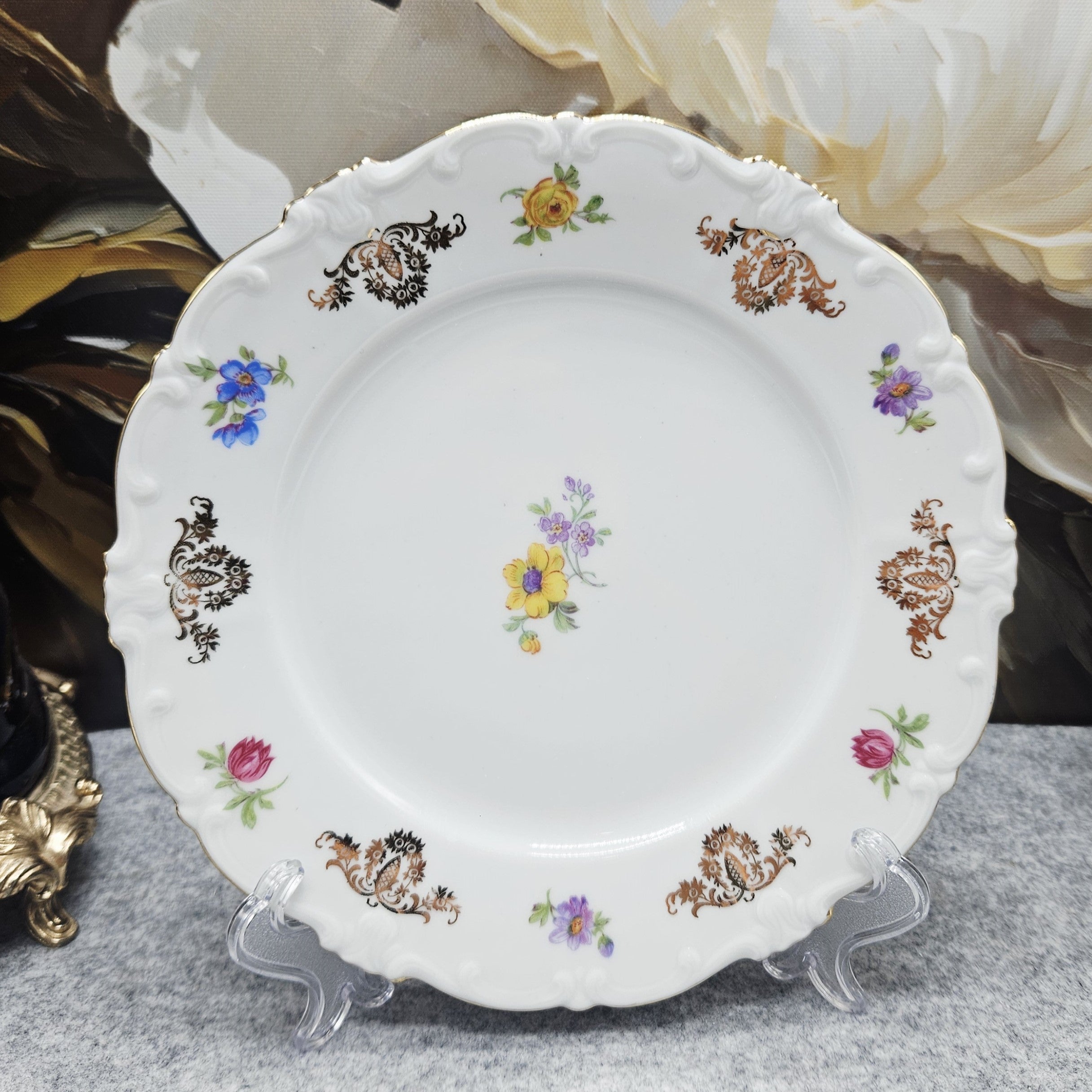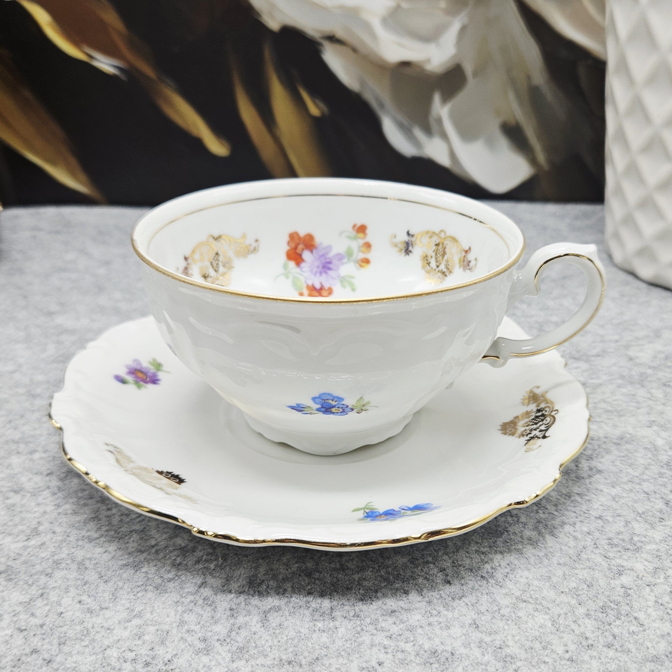 Puodelio vidų ir rinkinio paviršių puošia smulkūs gėlių motyvai – rožiniai, violetiniai ir mėlyni žiedai, harmoningai derinami su puošniais auksuotais ornamentais. Kraštai subtiliai paryškinti auksine linija, suteikiančia rinkiniui prabangos ir išskirtinumo.
