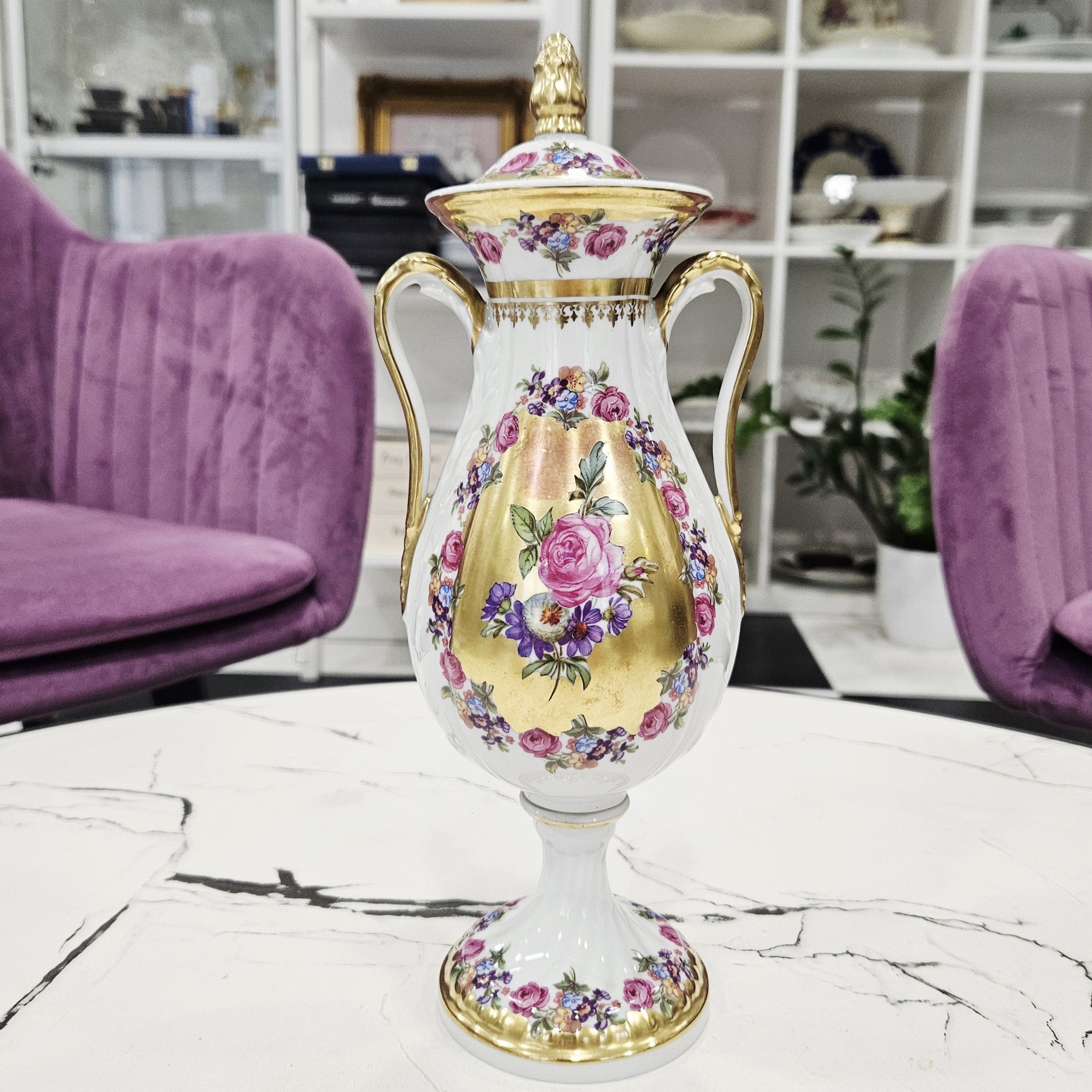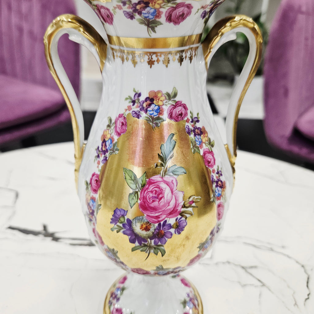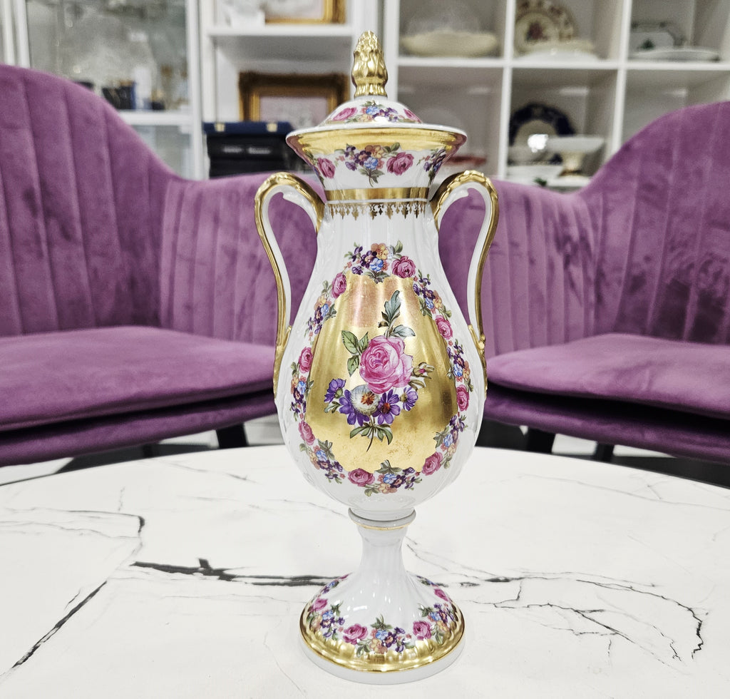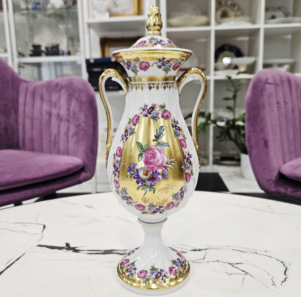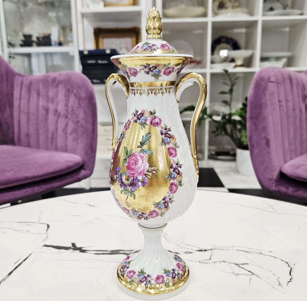 Išskirtinio grožio Rudolf Wachter (RW) Bavaria dekoratyvinė porceliano vaza su dangteliu – elegantiškas ir ryškus klasikinio bavarų porceliano pavyzdys. Vaza dekoruota gėlių puokštėmis, įkomponuotomis į prabangius matinio aukso laukus, papildytus subtiliomis rožėmis, violetiniais žiedeliais ir dekoratyvine apvadais. Švelniai reljefinis baltas porcelianas suteikia formai gyvumo ir prabangos pojūtį.