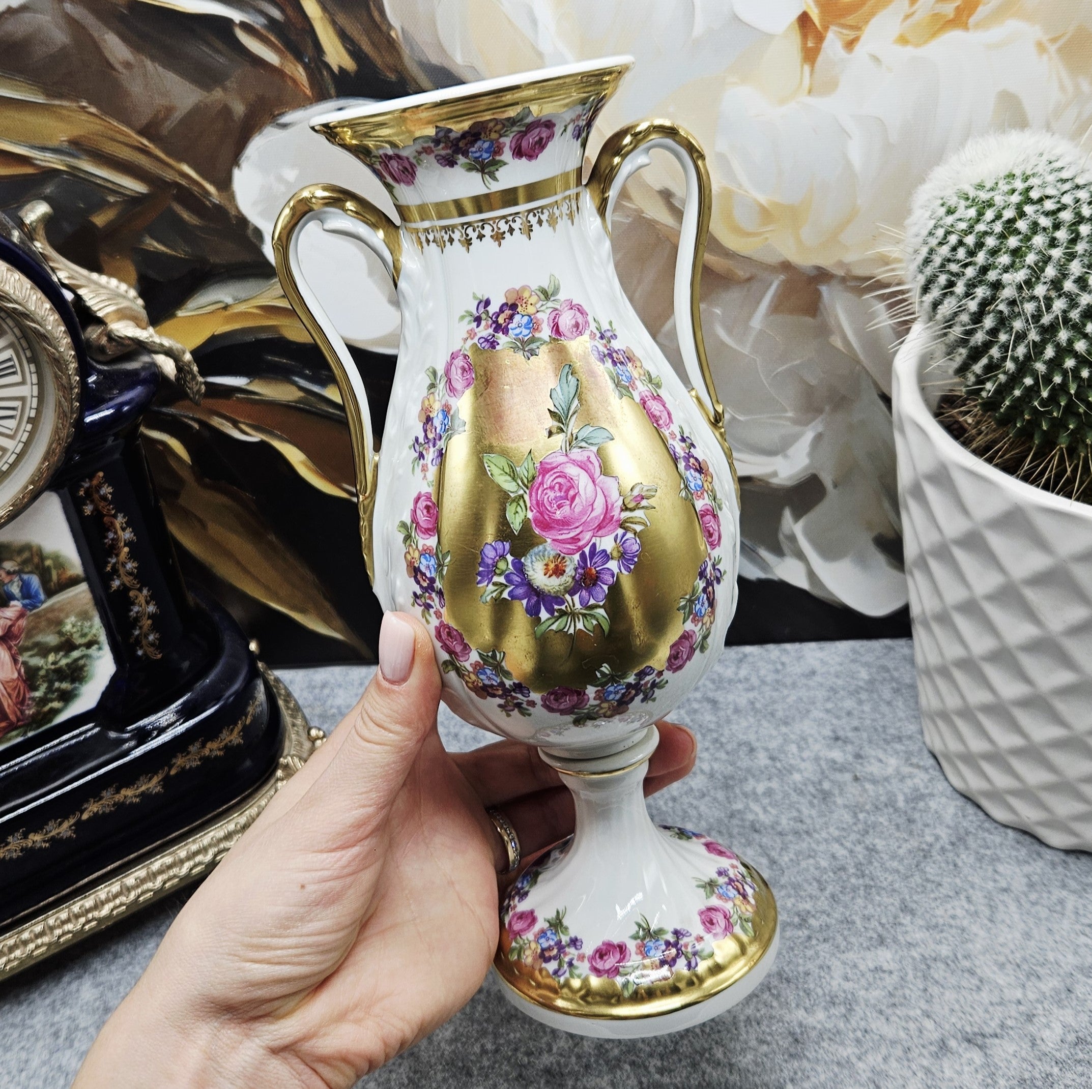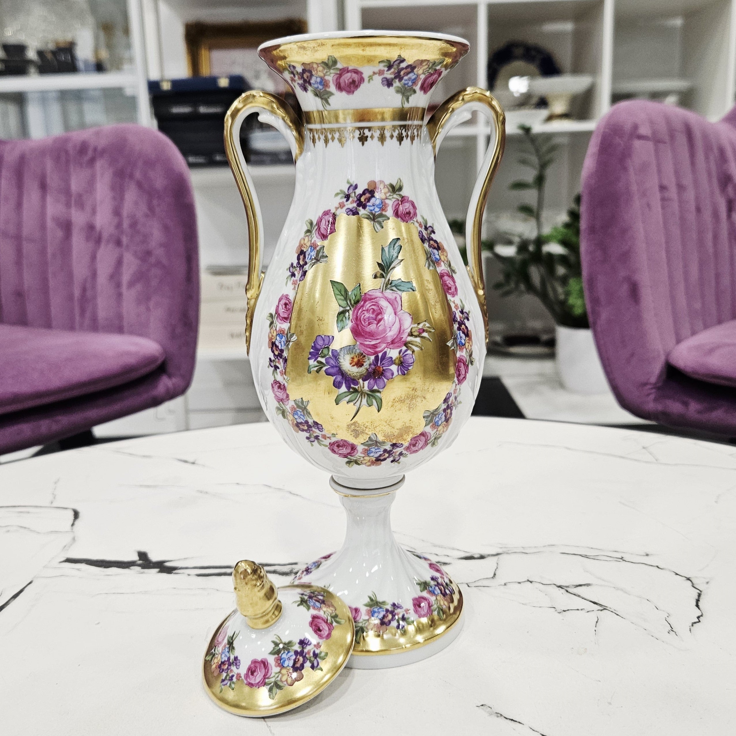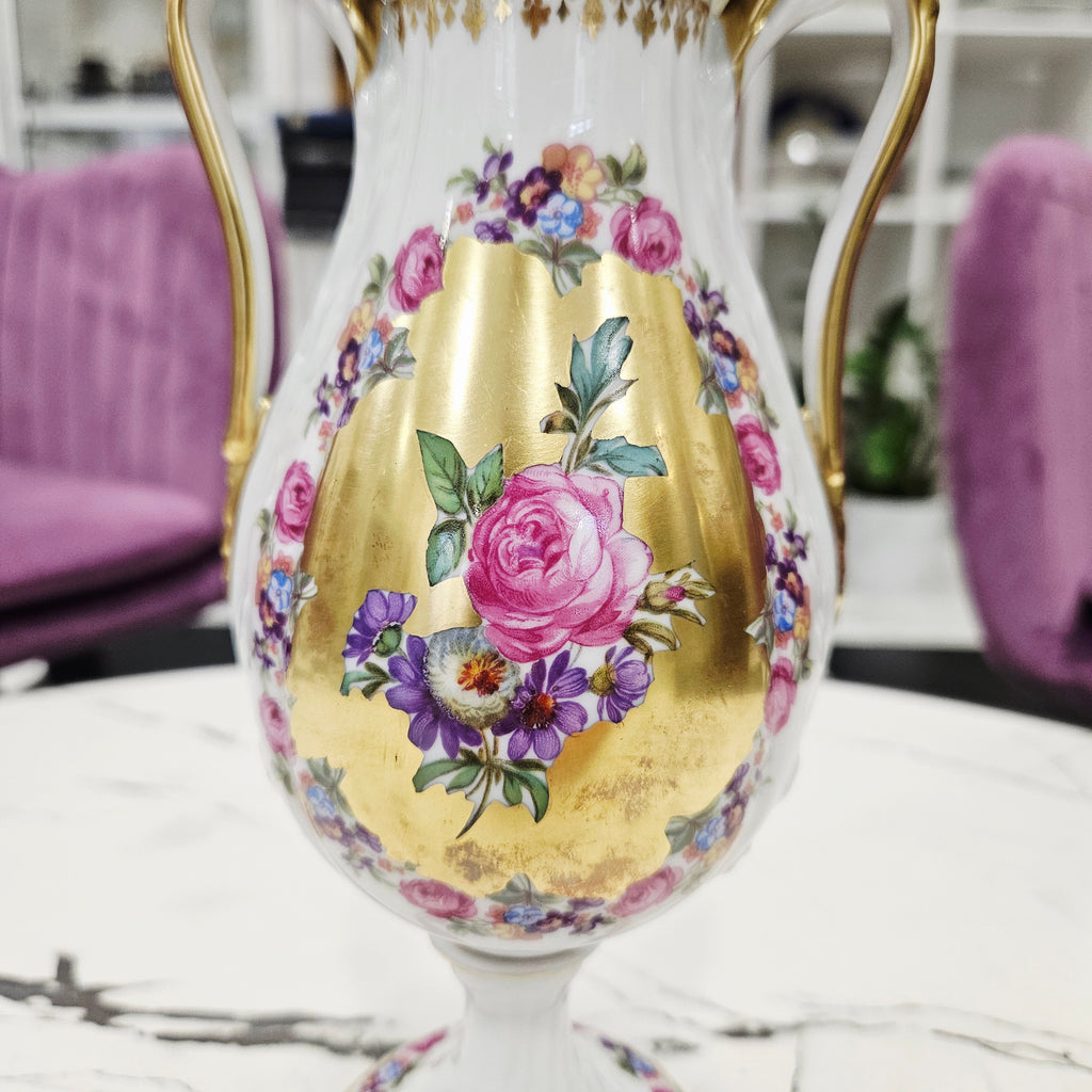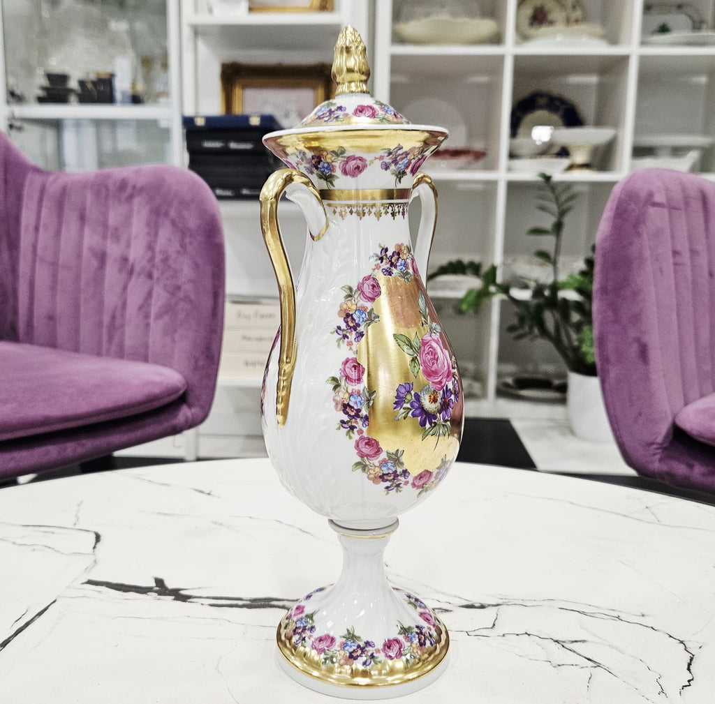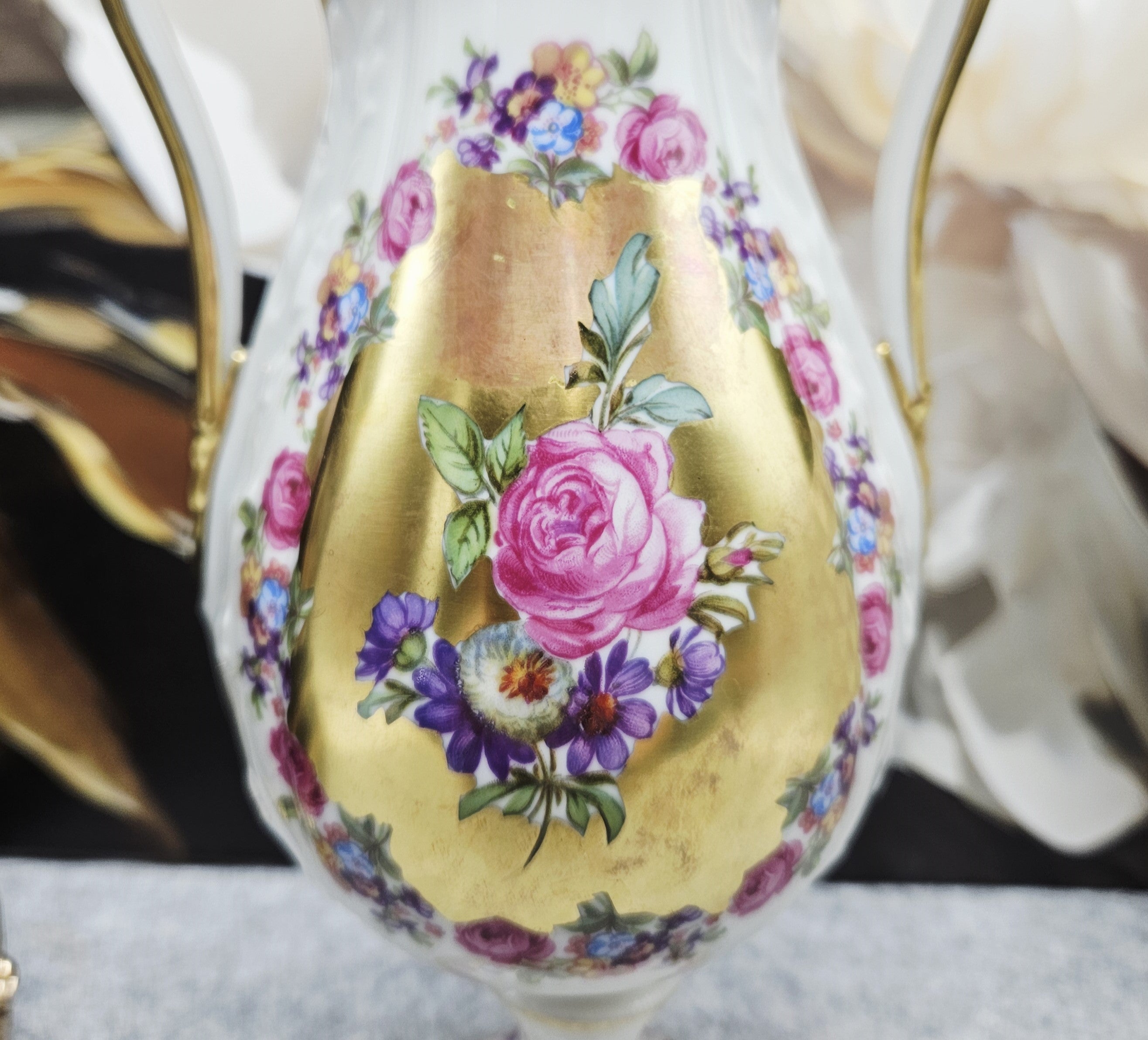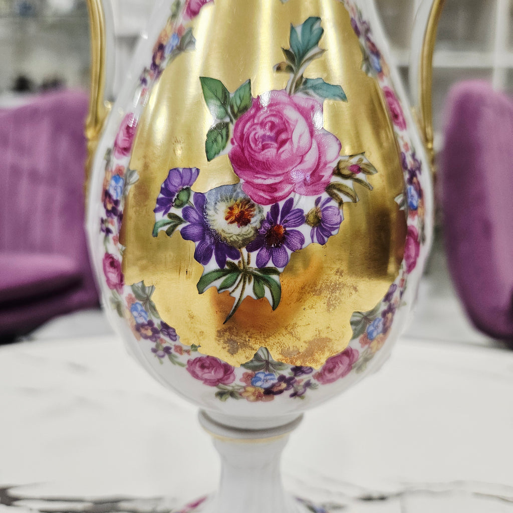 Išskirtinio grožio Rudolf Wachter (RW) Bavaria dekoratyvinė porceliano vaza su dangteliu – elegantiškas ir ryškus klasikinio bavarų porceliano pavyzdys. Vaza dekoruota gėlių puokštėmis, įkomponuotomis į prabangius matinio aukso laukus, papildytus subtiliomis rožėmis, violetiniais žiedeliais ir dekoratyvine apvadais. Švelniai reljefinis baltas porcelianas suteikia formai gyvumo ir prabangos pojūtį.