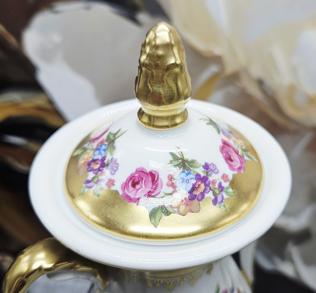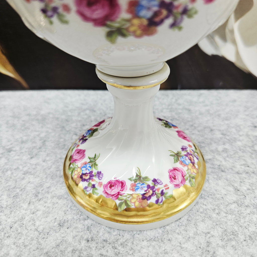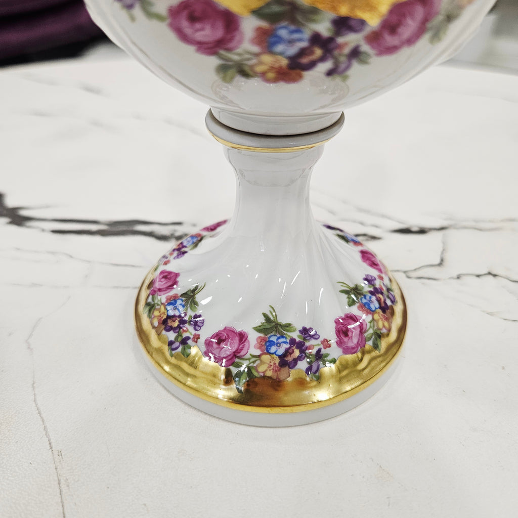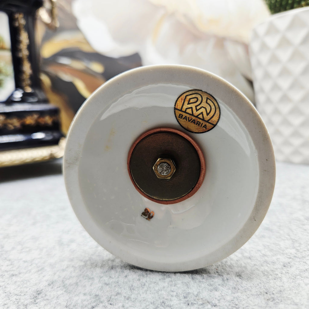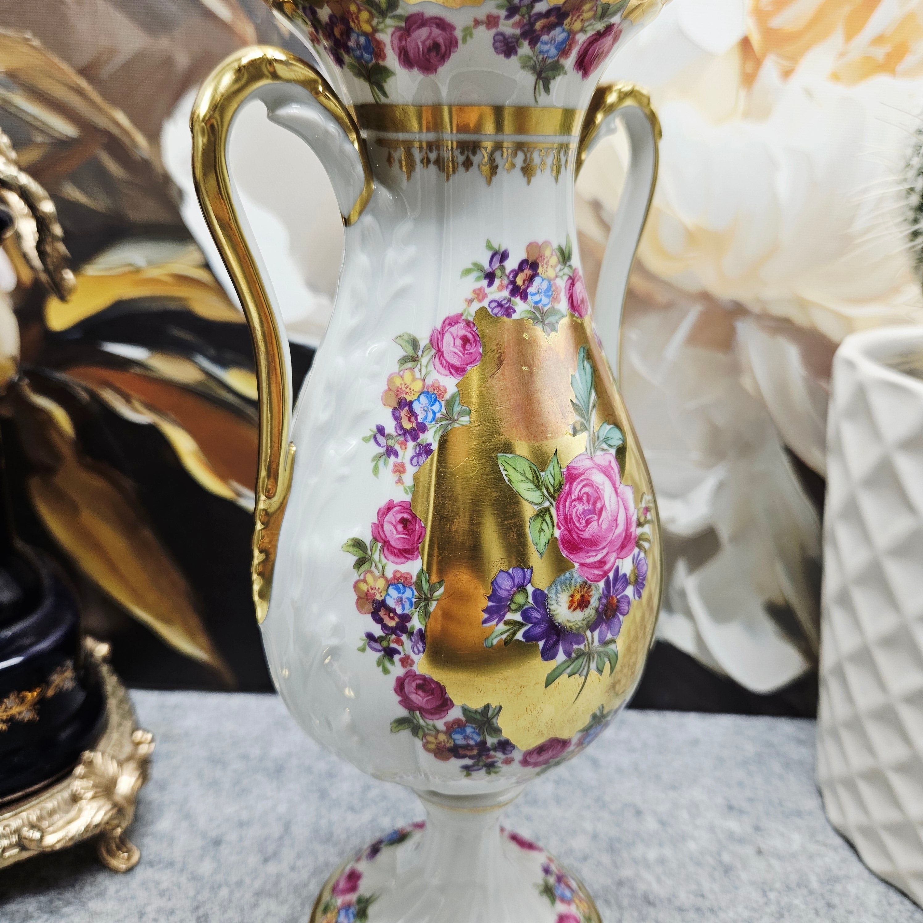 Išskirtinio grožio Rudolf Wachter (RW) Bavaria dekoratyvinė porceliano vaza su dangteliu – elegantiškas ir ryškus klasikinio bavarų porceliano pavyzdys. Vaza dekoruota gėlių puokštėmis, įkomponuotomis į prabangius matinio aukso laukus, papildytus subtiliomis rožėmis, violetiniais žiedeliais ir dekoratyvine apvadais. Švelniai reljefinis baltas porcelianas suteikia formai gyvumo ir prabangos pojūtį.