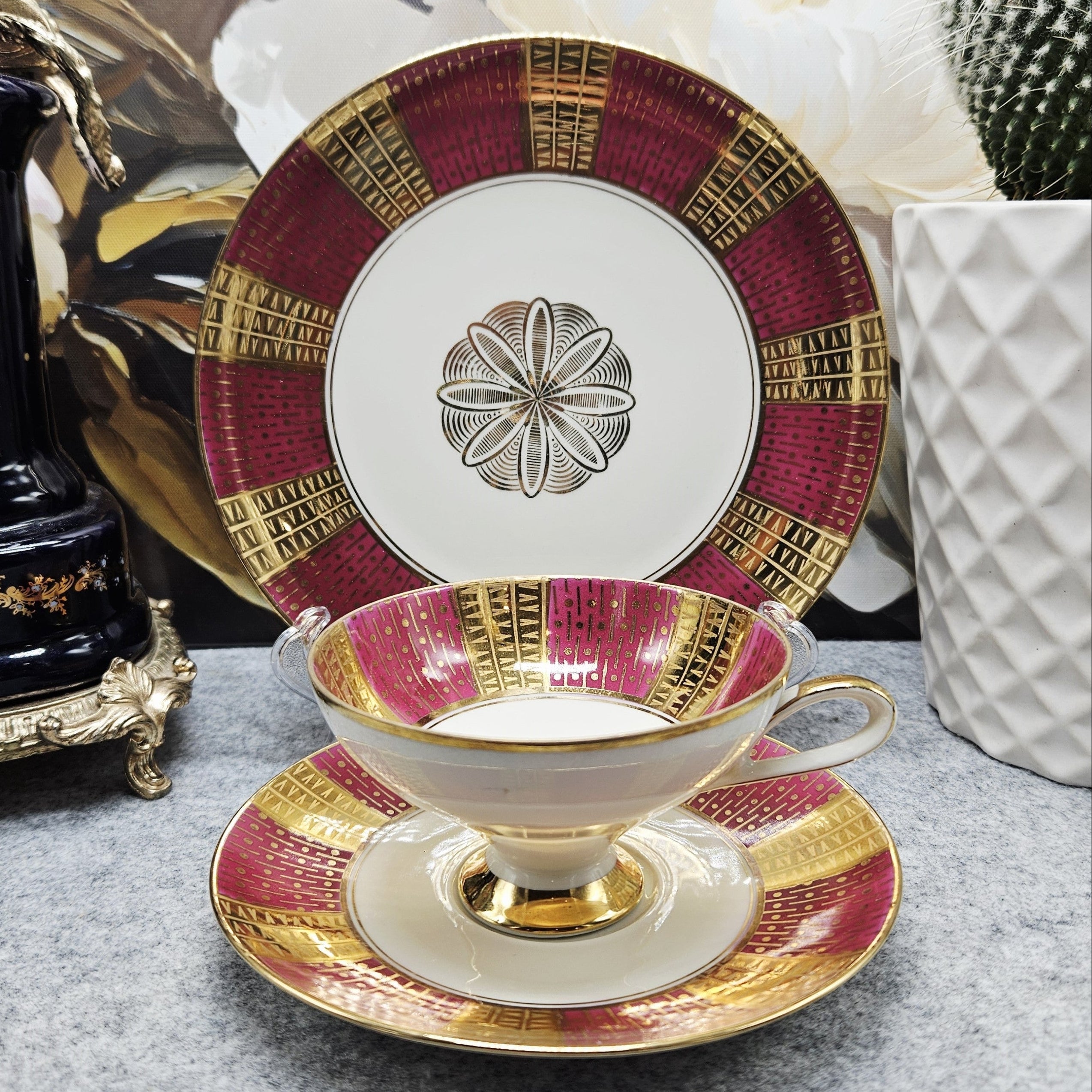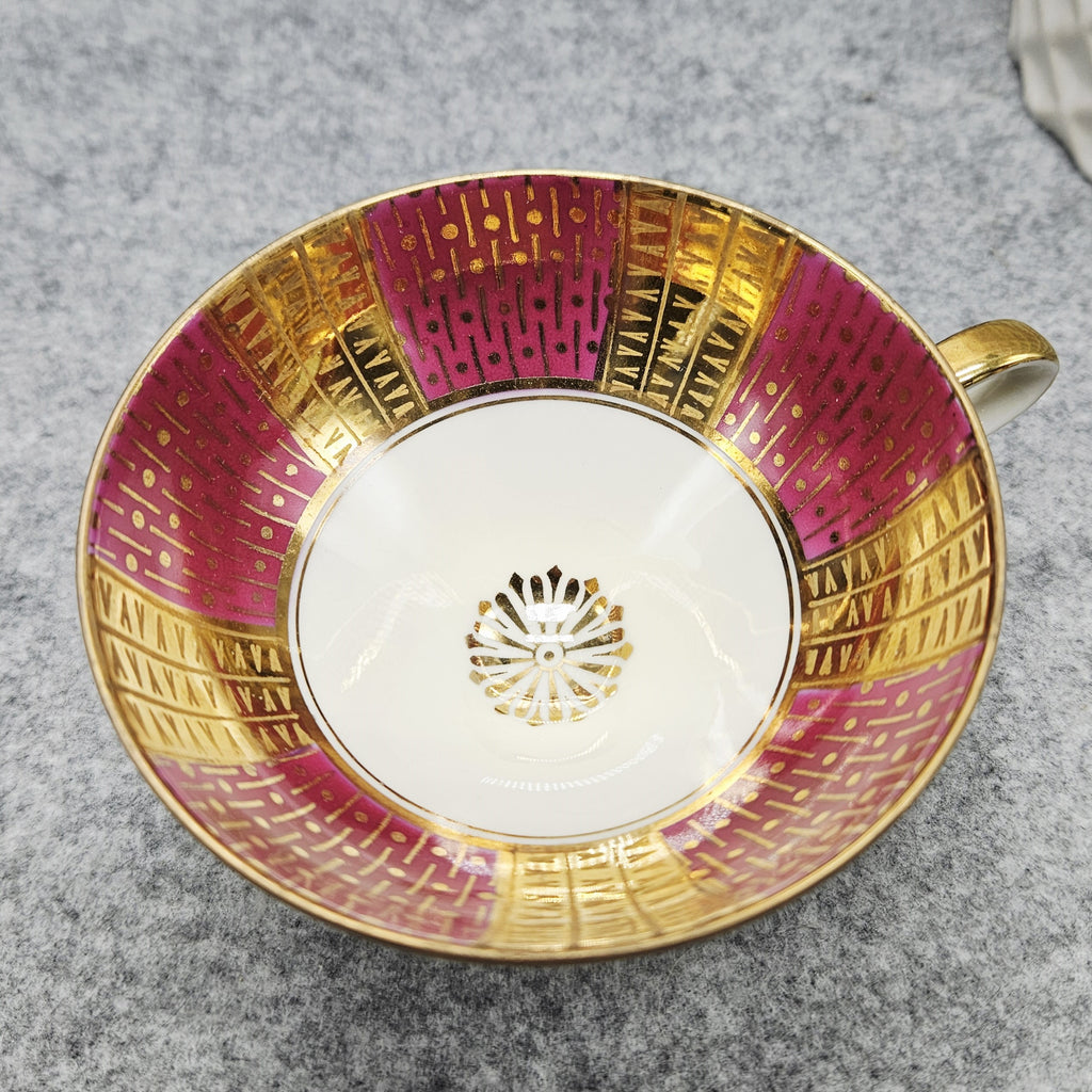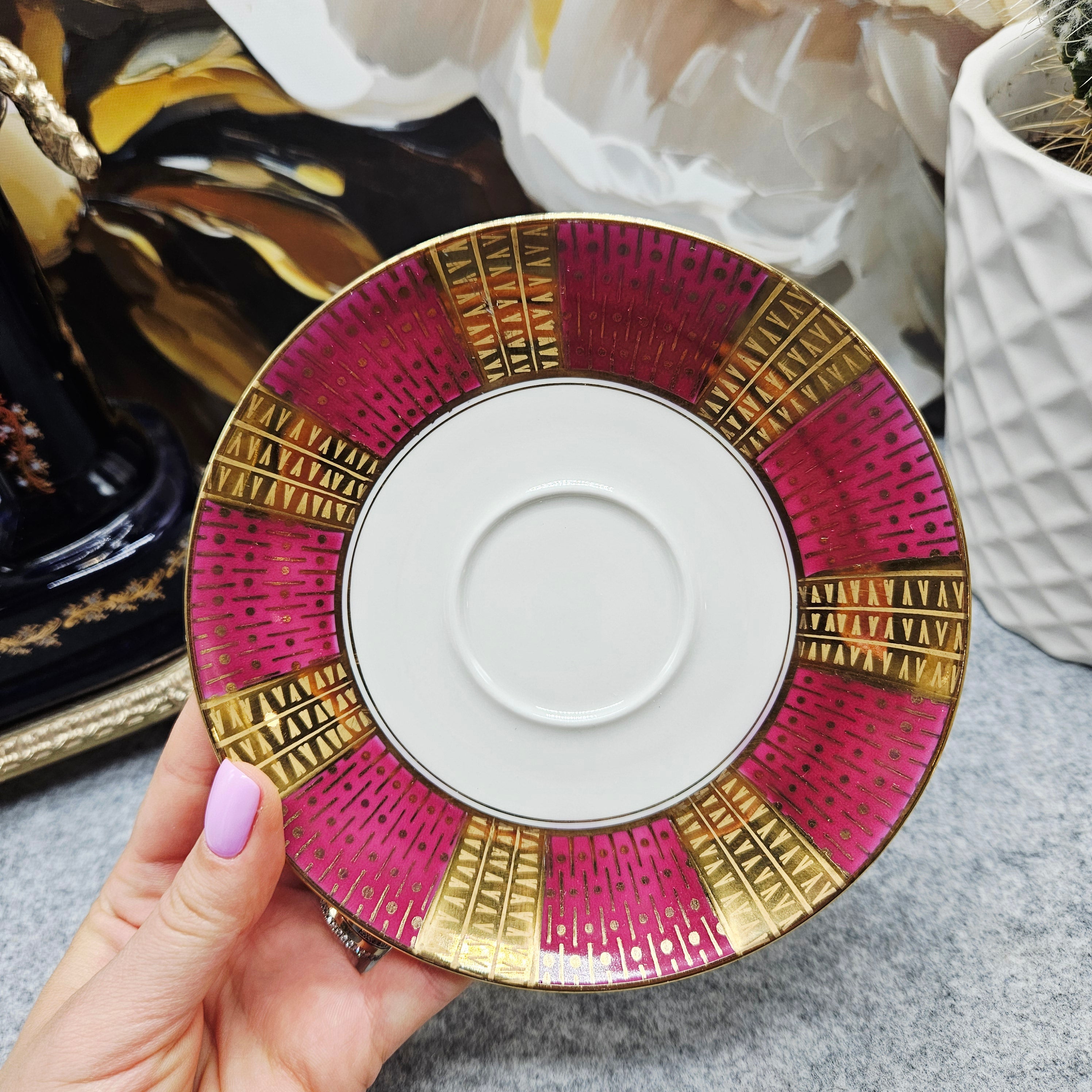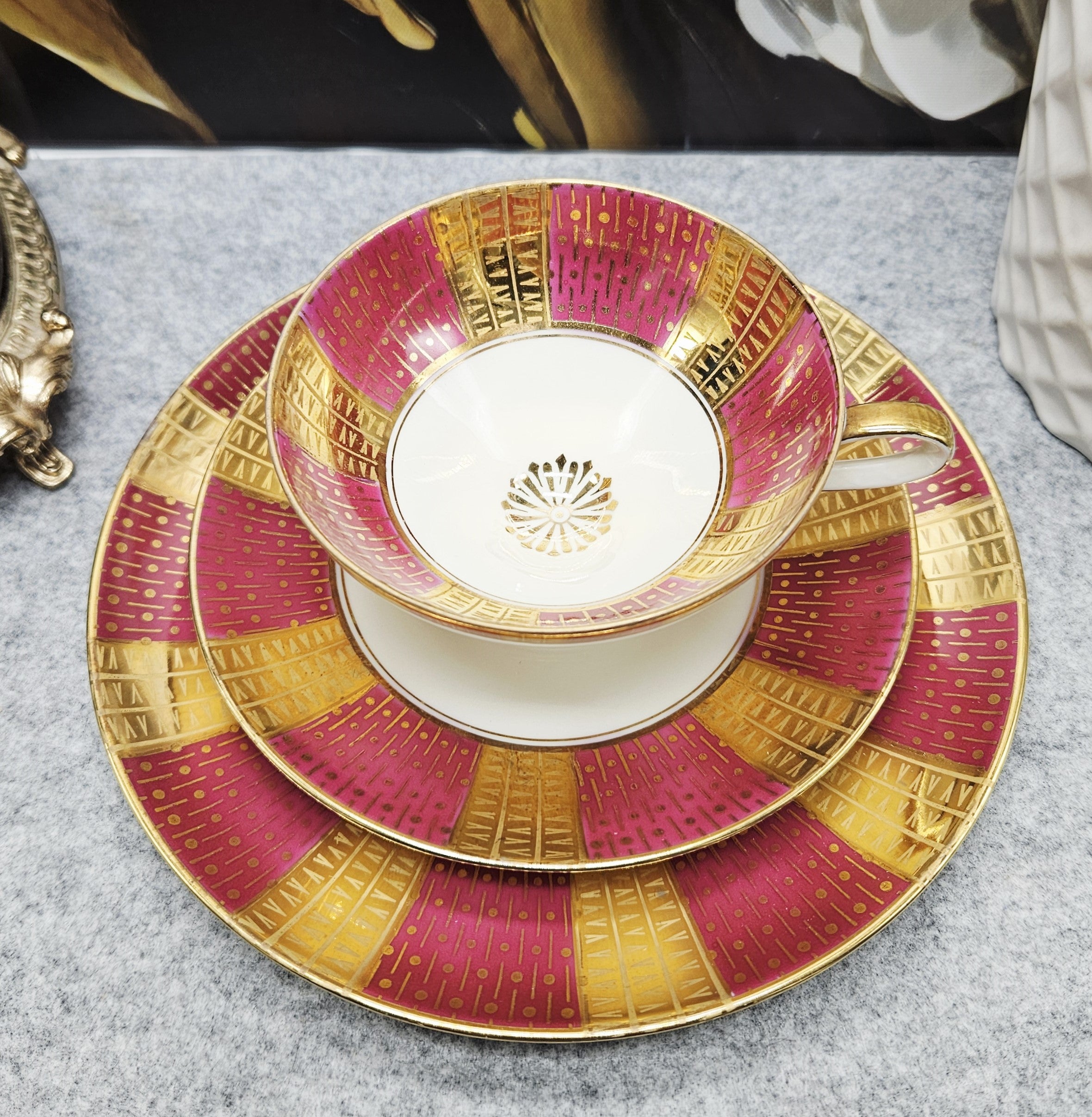 Įspūdingas "Winterling Röslau" porceliano puodelis su lėkštutėmis, dekoruotas sodriu avietiniu fonu ir prabangiais 24K auksiniais geometriniais raštais. Centre puošia stilingas juodai auksinis ornamentas, suteikiantis rinkiniui išskirtinio meno kūrinio įspūdį. Elegantiška forma ir aukštos kokybės glazūra atspindi vokišką preciziką bei klasikinį rafinuotumą. Puikiai tinka kolekcionieriams ar prabangiam stalo serviravimui.