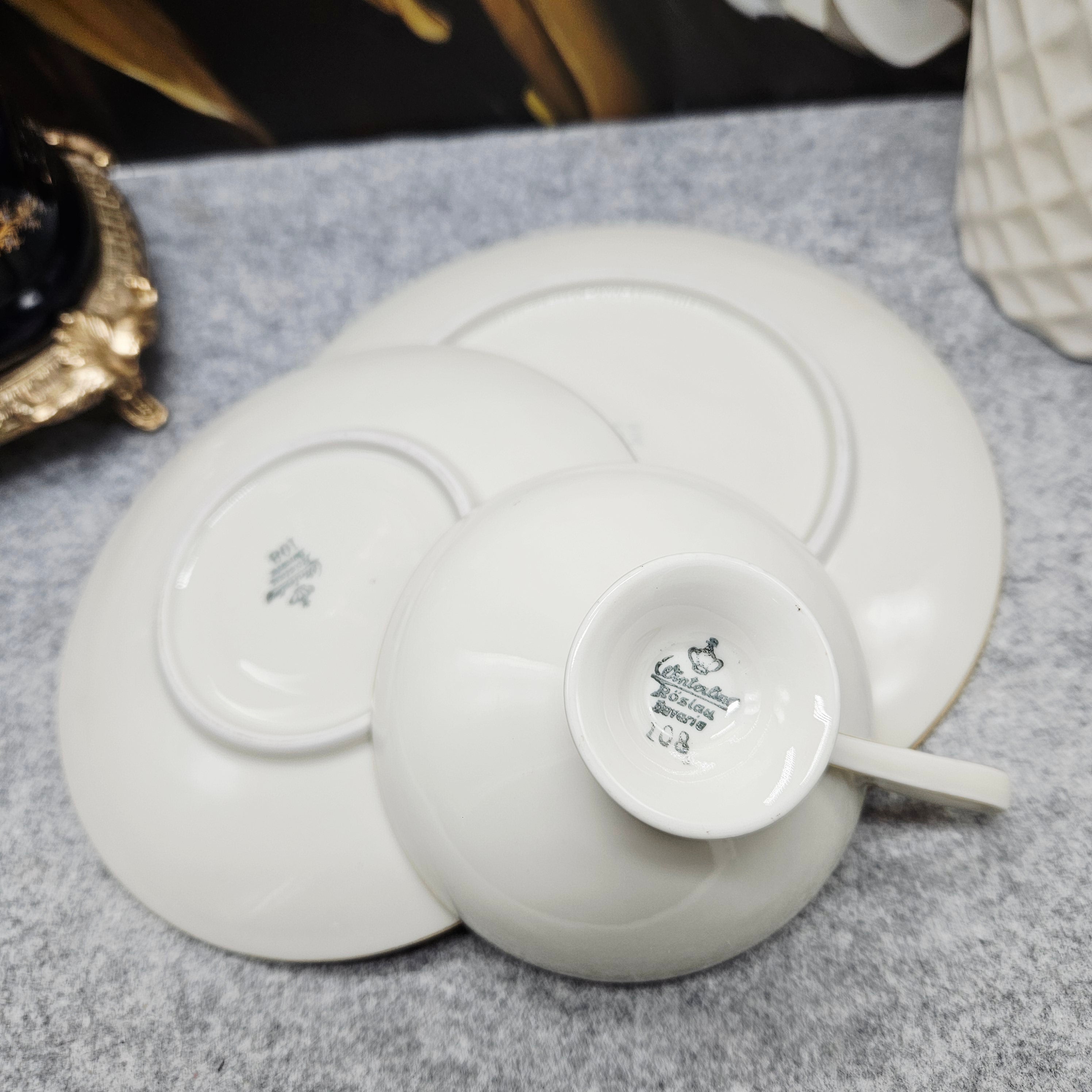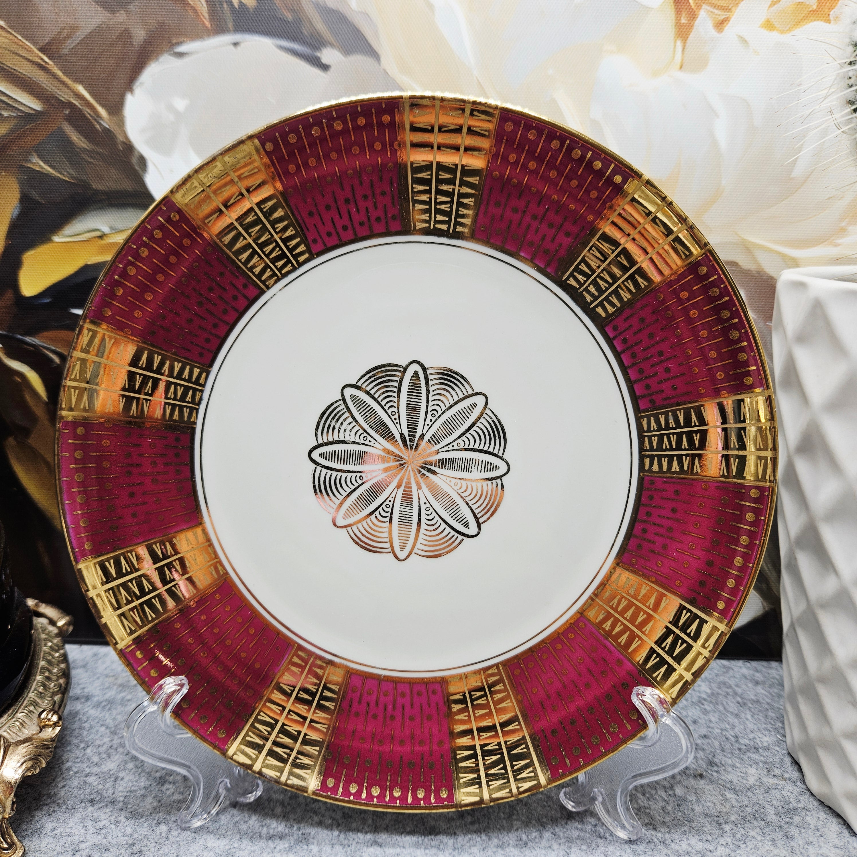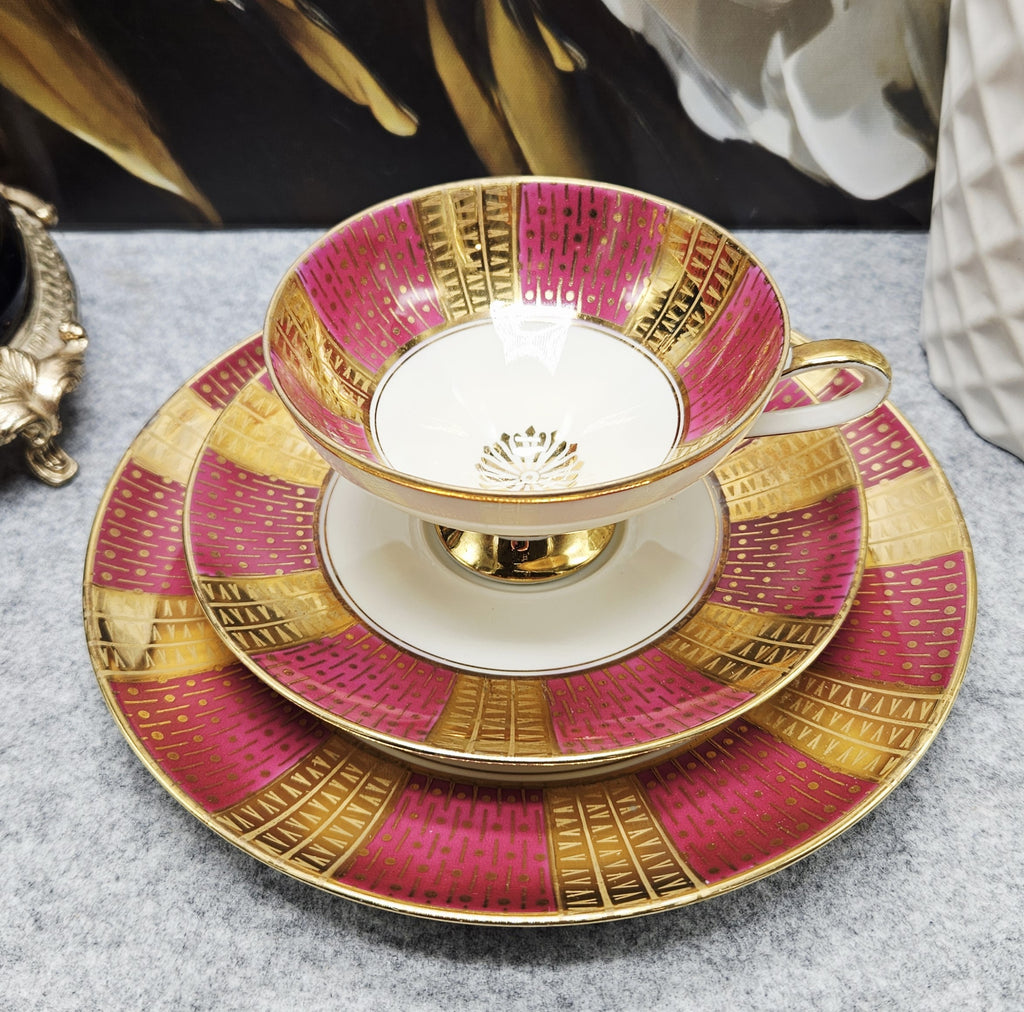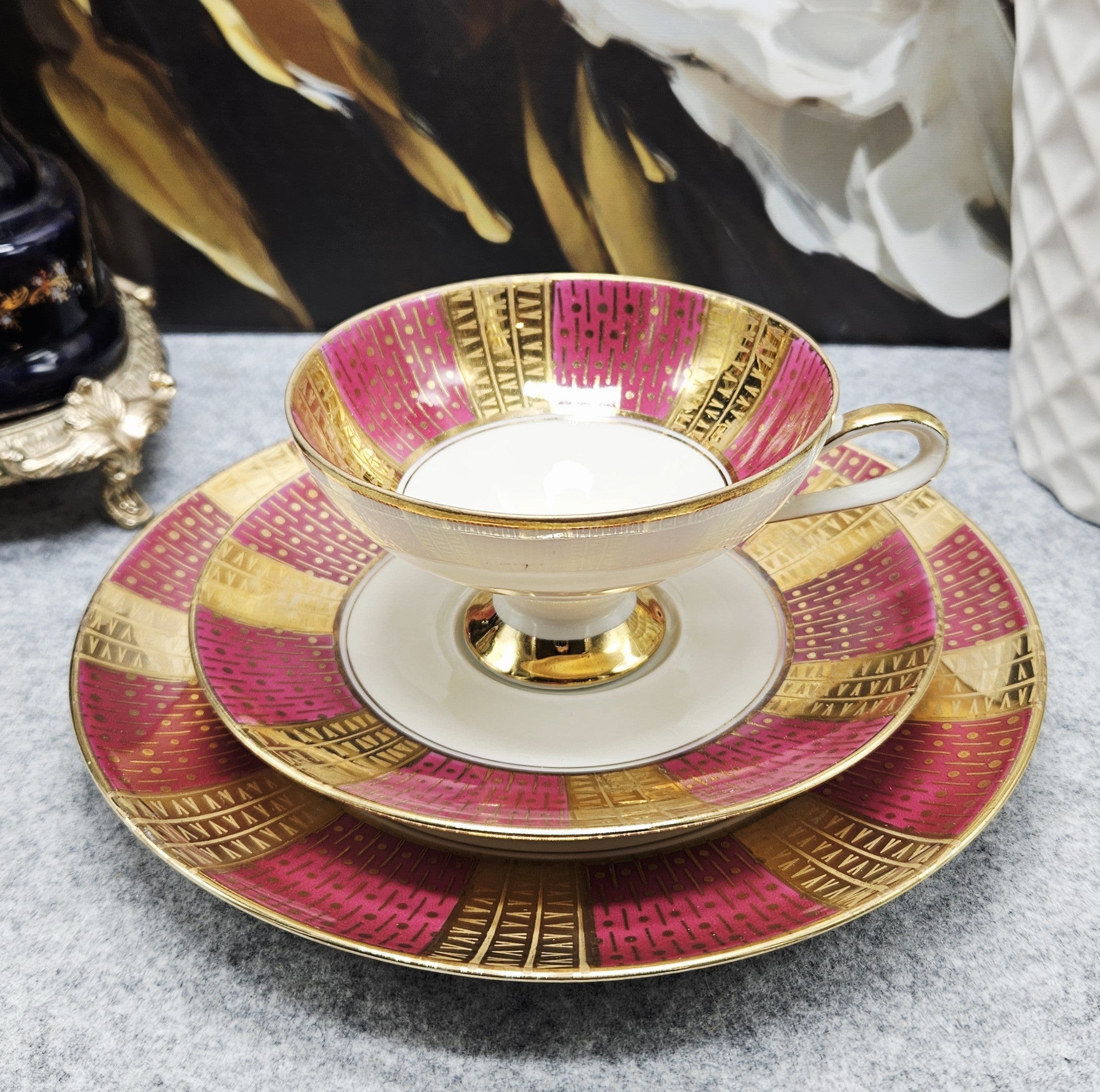 Įspūdingas "Winterling Röslau" porceliano puodelis su lėkštutėmis, dekoruotas sodriu avietiniu fonu ir prabangiais 24K auksiniais geometriniais raštais. Centre puošia stilingas juodai auksinis ornamentas, suteikiantis rinkiniui išskirtinio meno kūrinio įspūdį. Elegantiška forma ir aukštos kokybės glazūra atspindi vokišką preciziką bei klasikinį rafinuotumą. Puikiai tinka kolekcionieriams ar prabangiam stalo serviravimui.