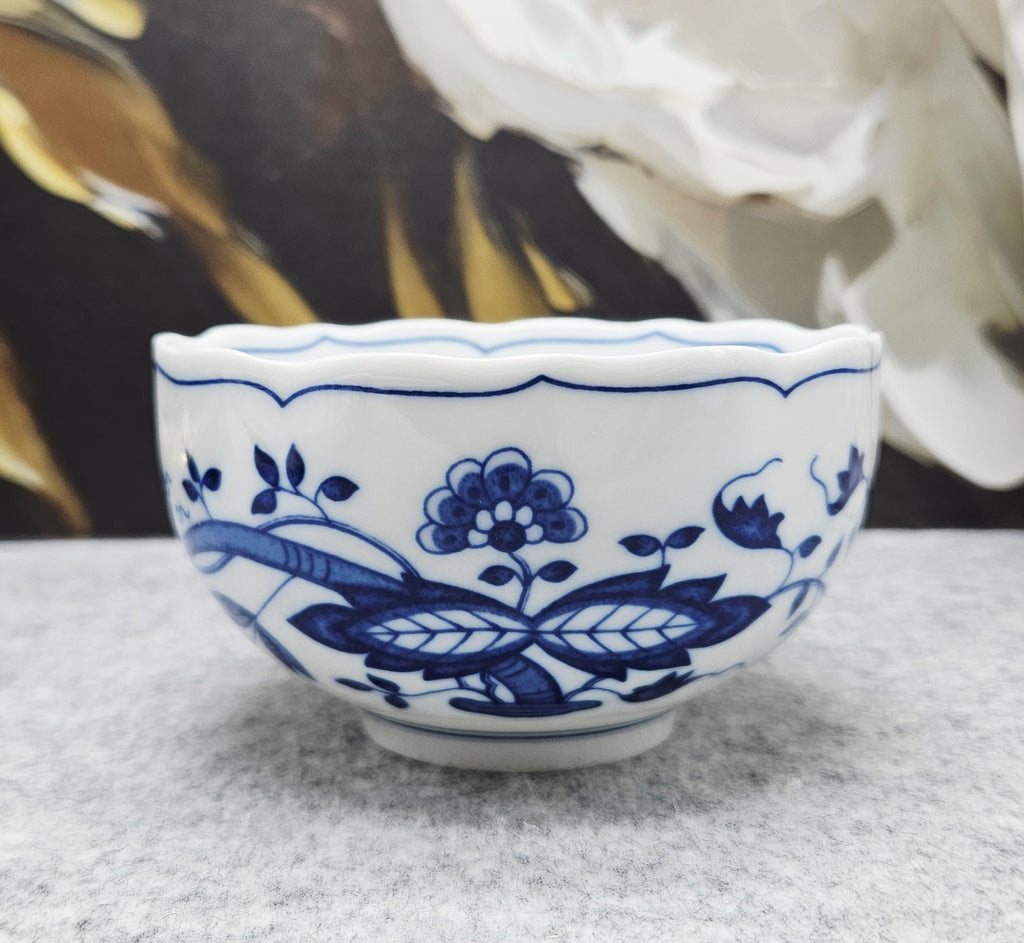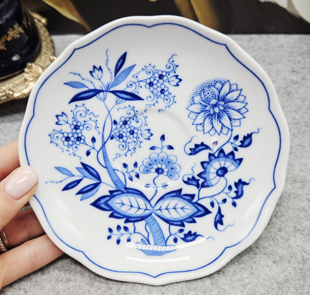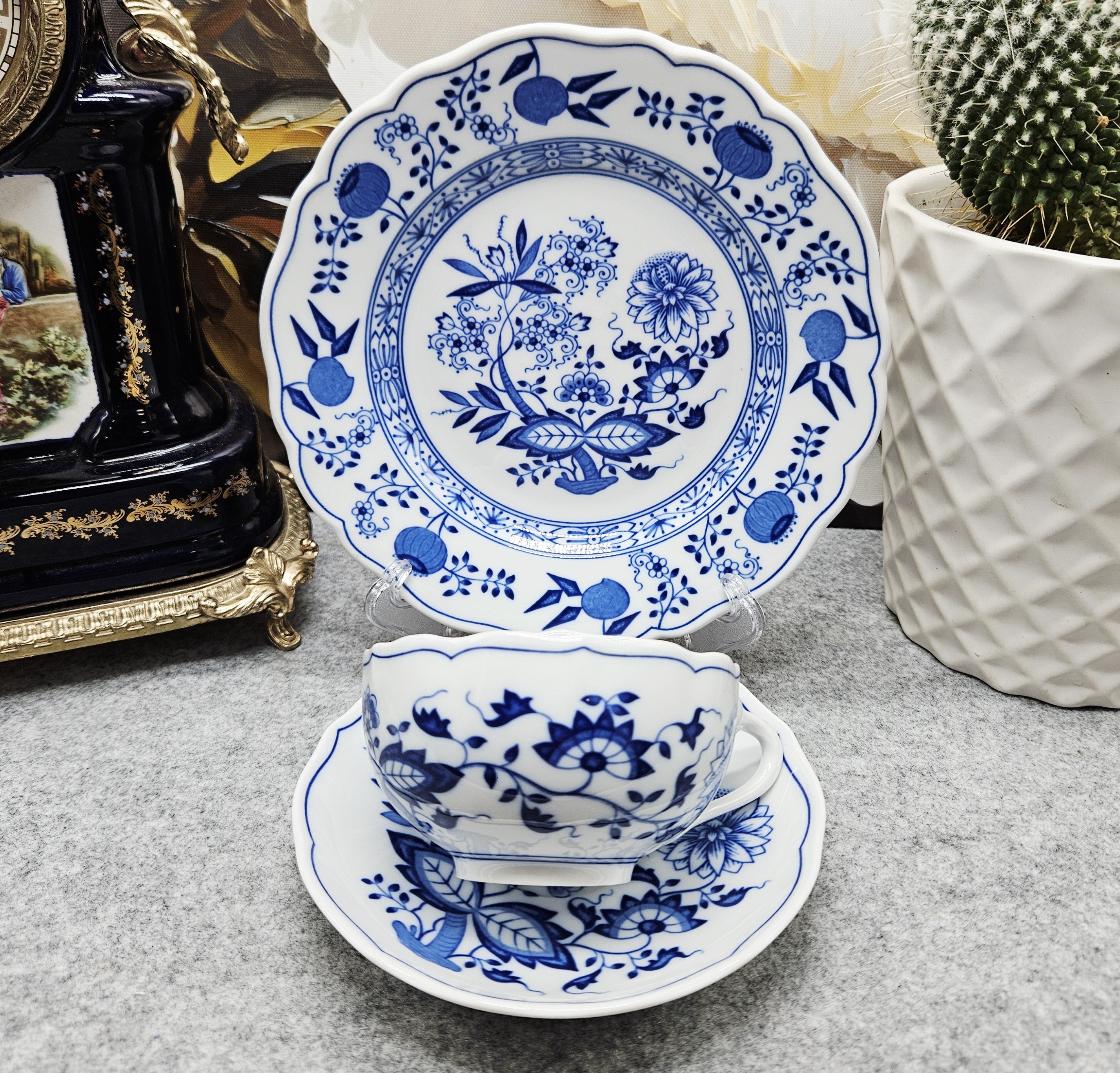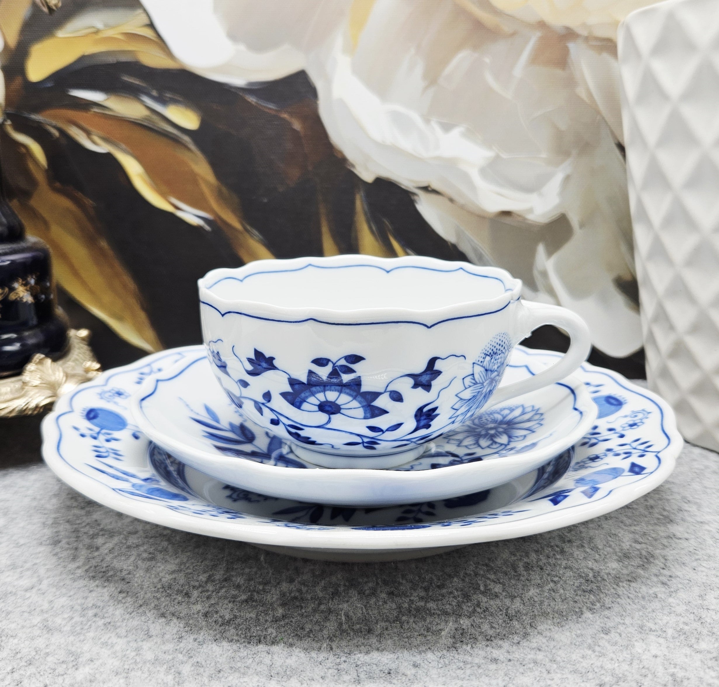 Puodelis turi banguoto krašto formą, švelniai profiliuotą rankenėlę ir itin ploną, malonią gerti sienelę. Dvi lėkštutės (desertinė ir puodelio lėkštutė) taip pat dekoruotos klasikiniu Zwiebelmuster raštu, sukuriančiu harmoningą, vientisą komplektą.