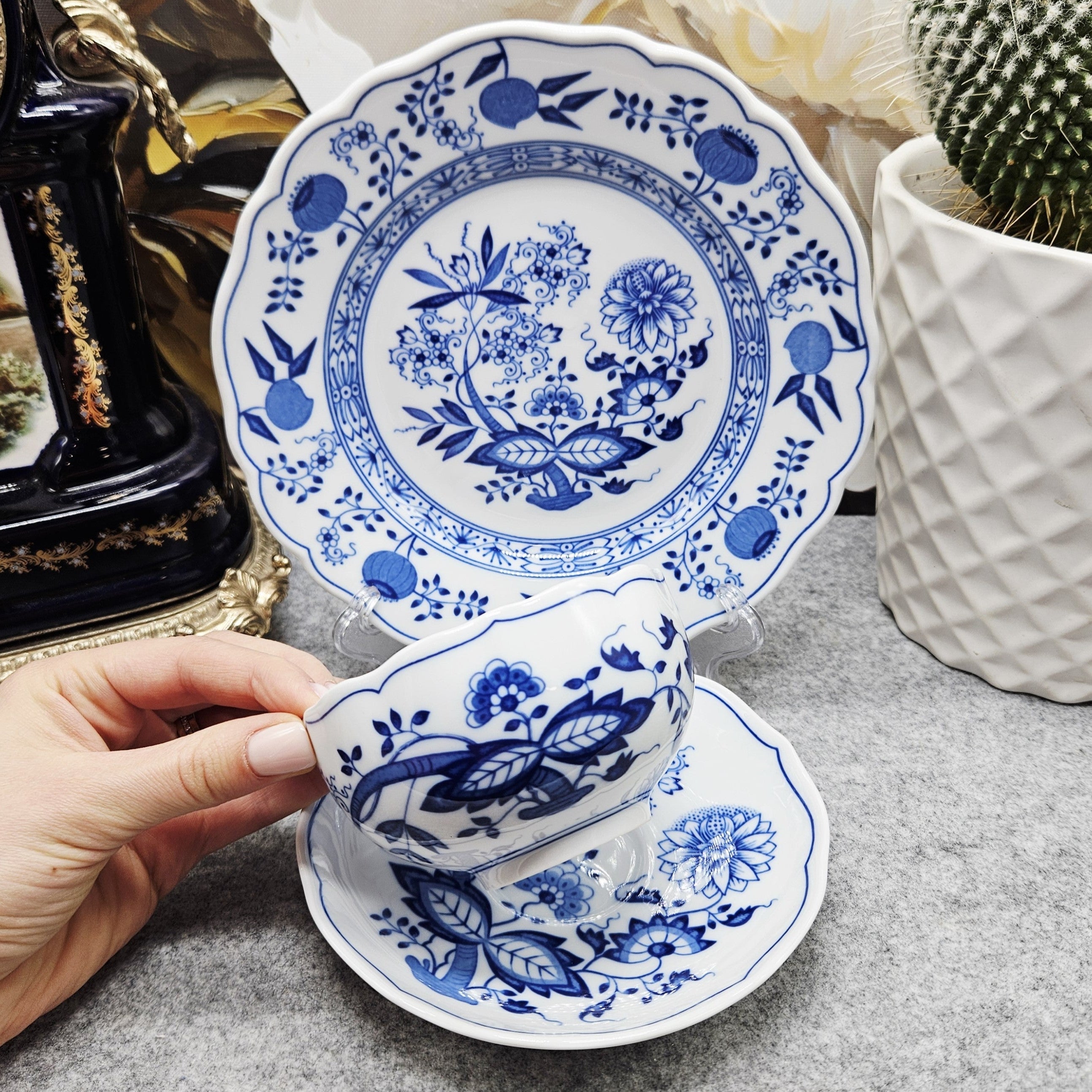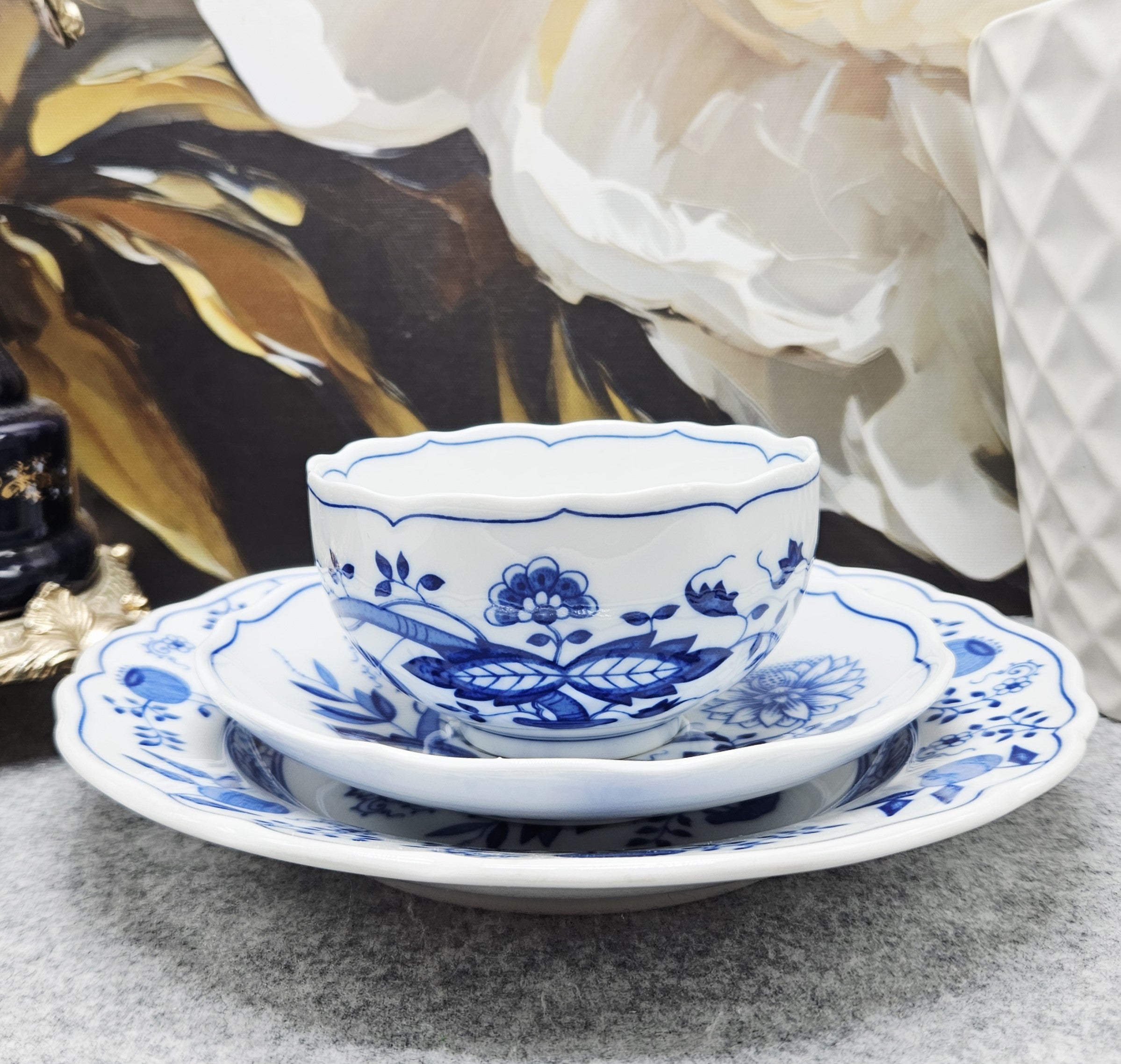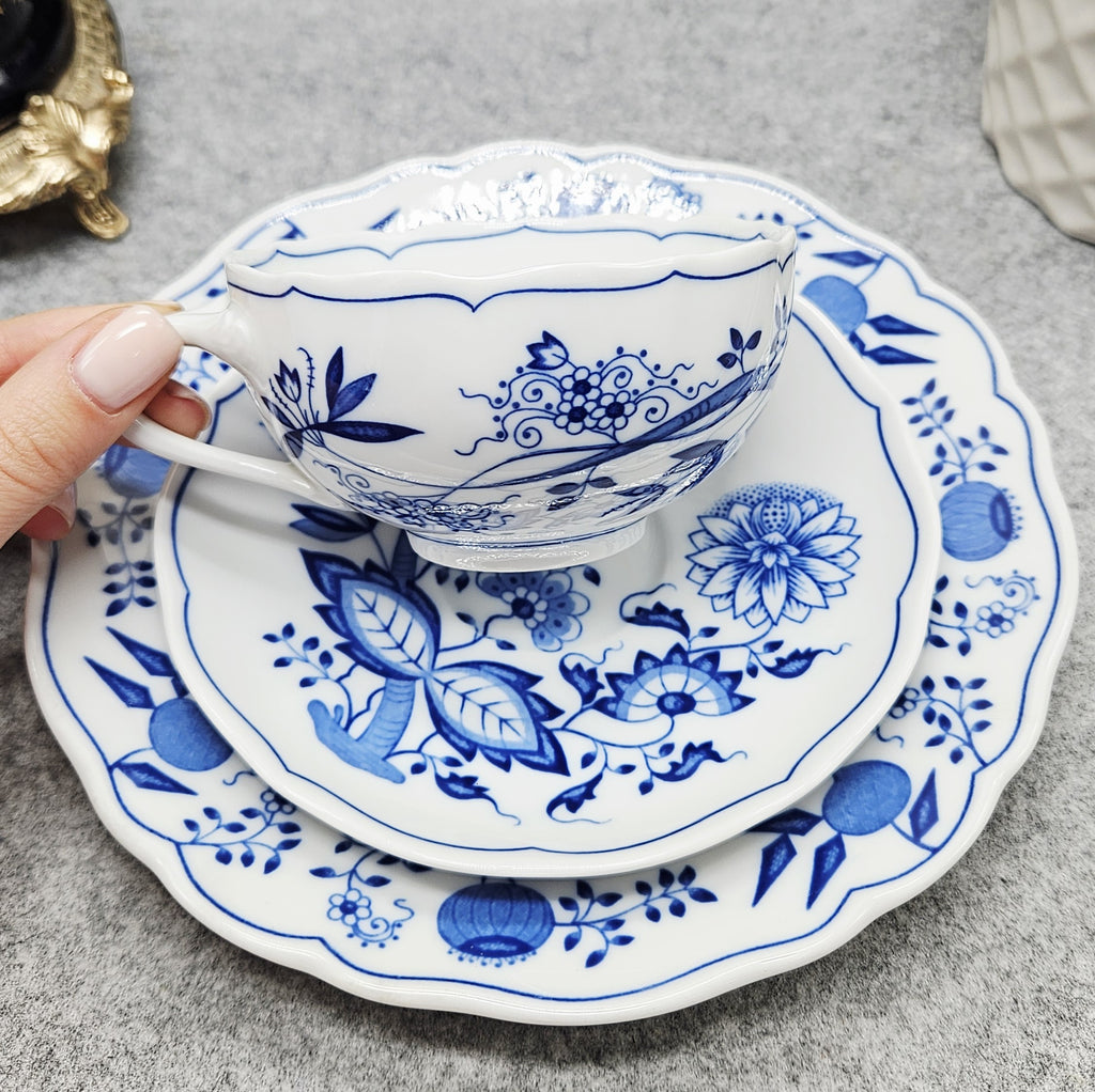 Išskirtinis, elegantiškas ir klasika tapęs mėlyno svogūno („Blue Onion“) dekoras papuošia šį gražų vokiško porceliano puodelio ir dviejų lėkštelių rinkinį. Itin šviesi, balta masė derinama su sodraus kobolto mėlynumo ornamentais – stilizuotomis gėlėmis, vaisiais ir senovinėmis Rytų motyvais įkvėptomis linijomis.