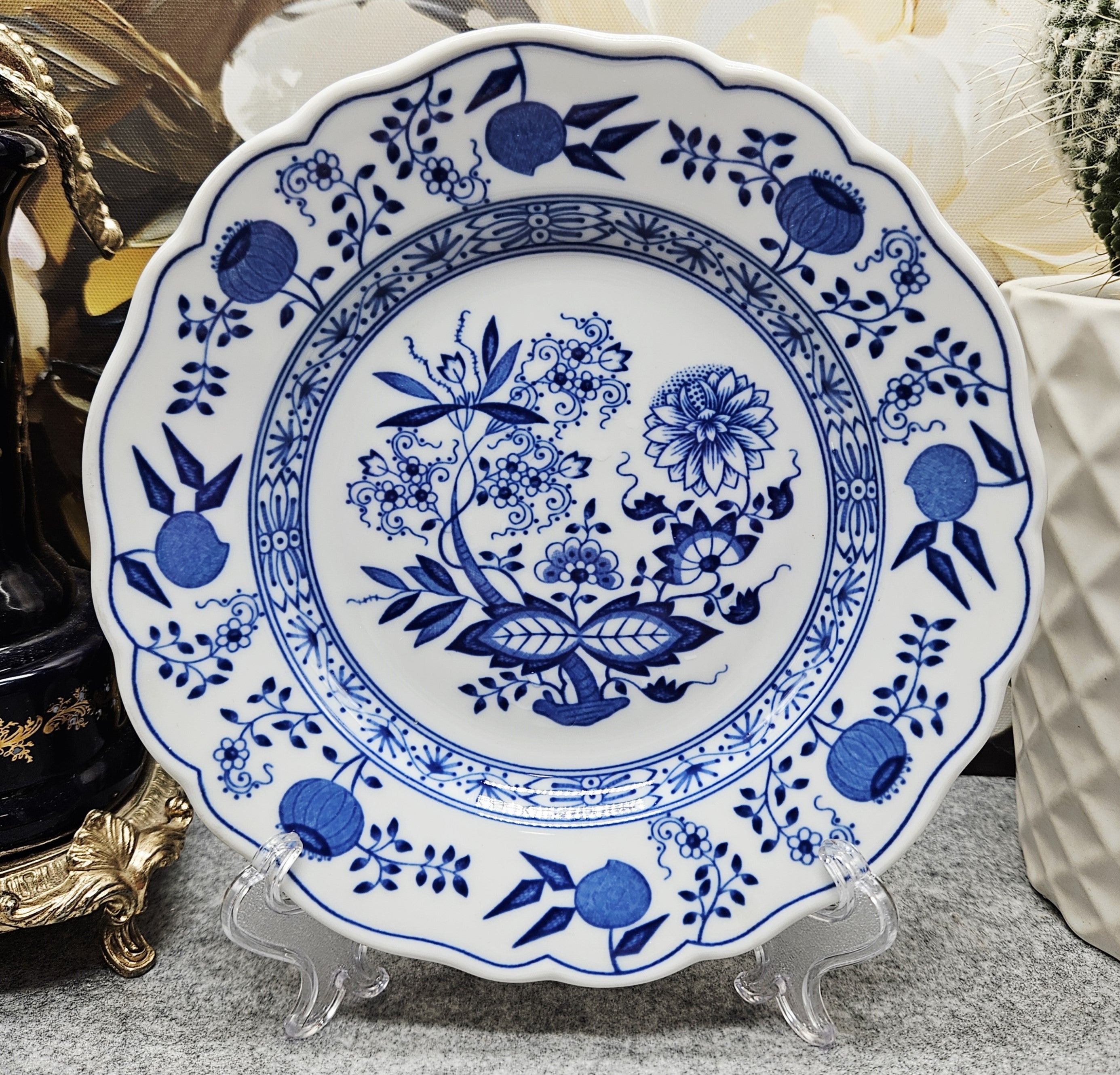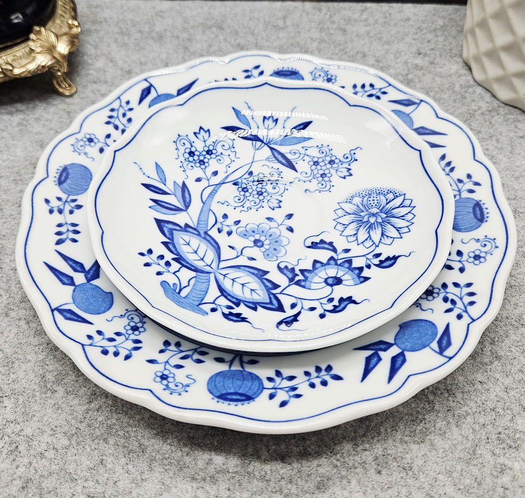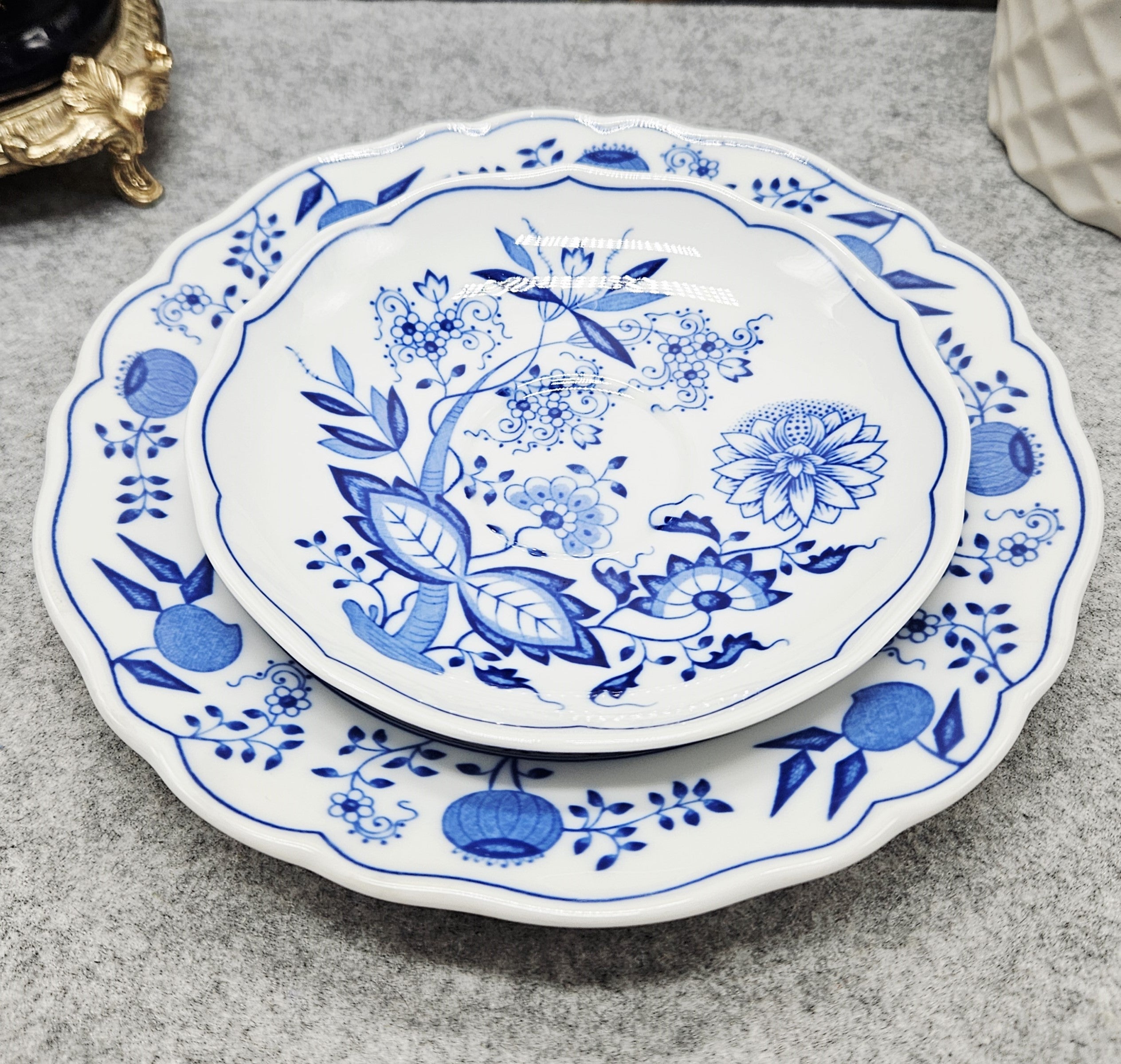 Išskirtinis, elegantiškas ir klasika tapęs mėlyno svogūno („Blue Onion“) dekoras papuošia šį gražų vokiško porceliano puodelio ir dviejų lėkštelių rinkinį. Itin šviesi, balta masė derinama su sodraus kobolto mėlynumo ornamentais – stilizuotomis gėlėmis, vaisiais ir senovinėmis Rytų motyvais įkvėptomis linijomis.