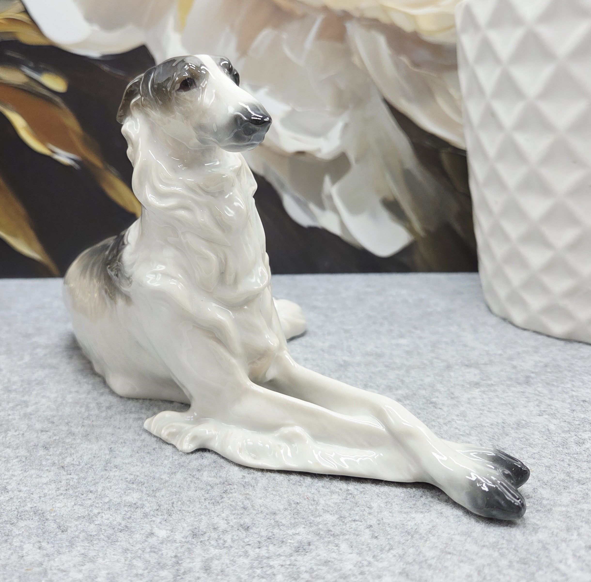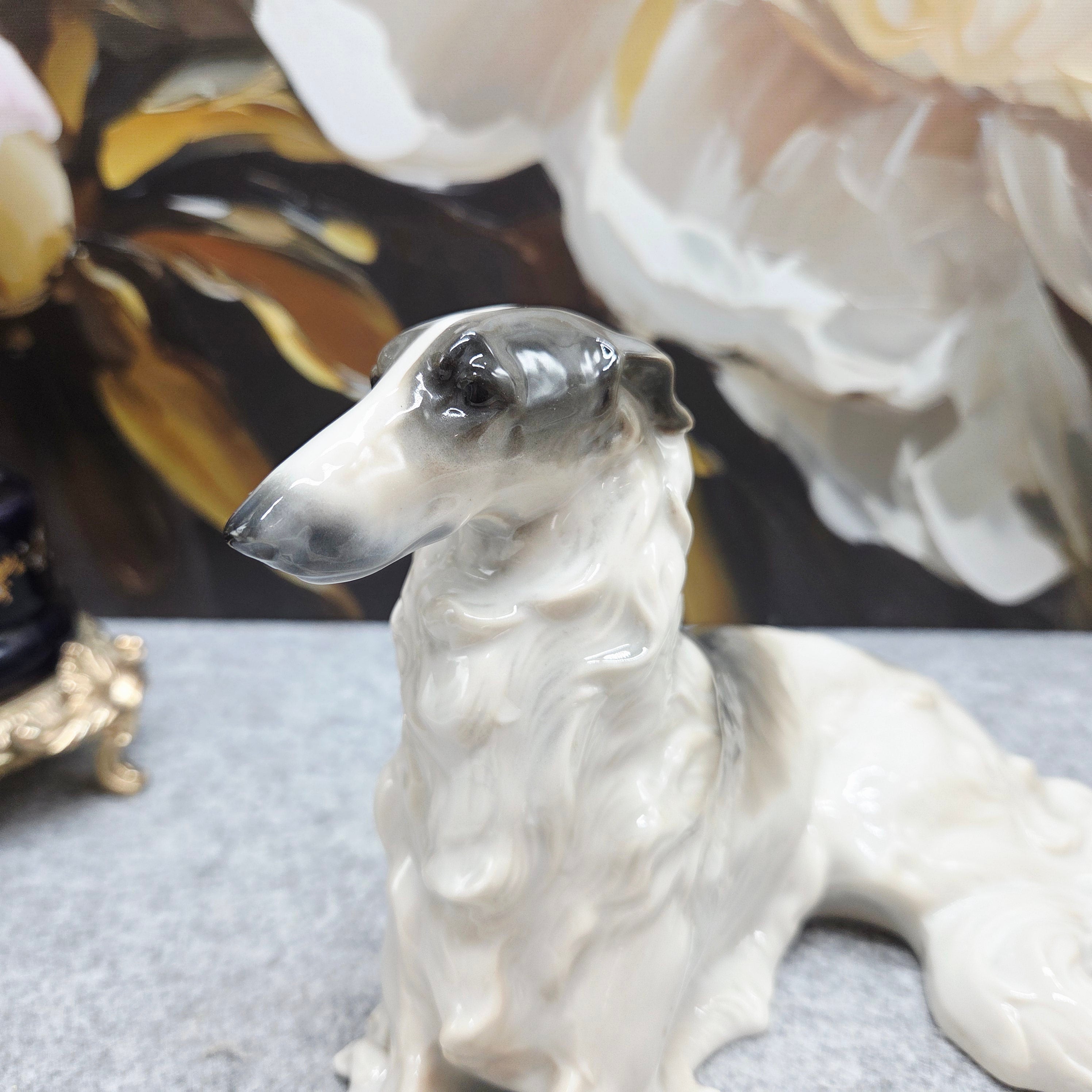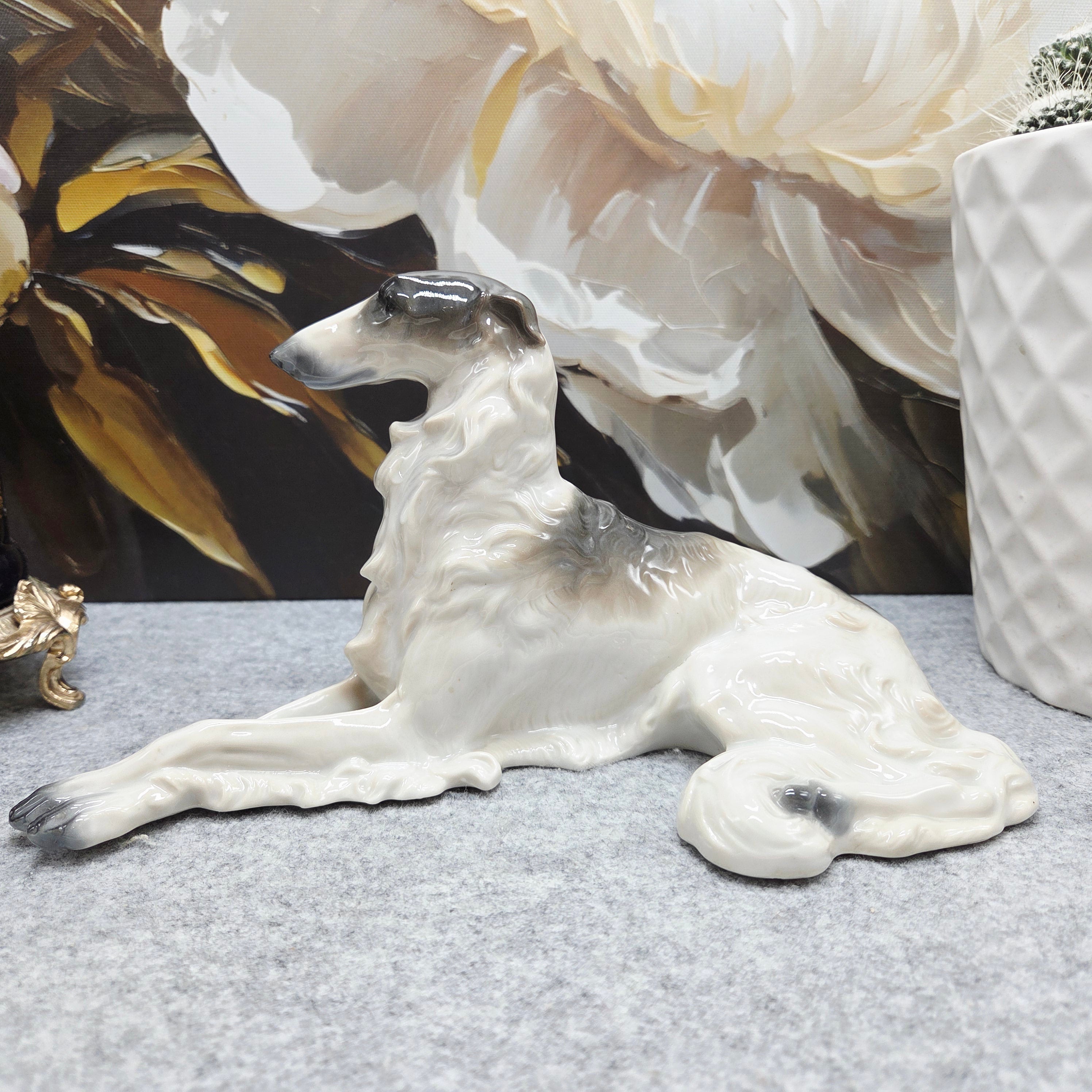 Kolekcinė Metzler & Ortloff Kunstporzellane MO porceliano figūrėlė, vaizduojanti aristokratišką rusų kurtą (Borzoi). Grakščiai ištiestos ilgos kojos, išdidžiai pakelta galva ir švelniai krintantis banguotas kailis perteikia šios veislės kilnumą bei rafinuotą charakterį. Subtilūs pilkšvi tonai ir švelnūs šešėliavimai baltame glazūruotame paviršiuje suteikia skulptūrai natūralumo bei išskirtinio plastikos pojūčio.