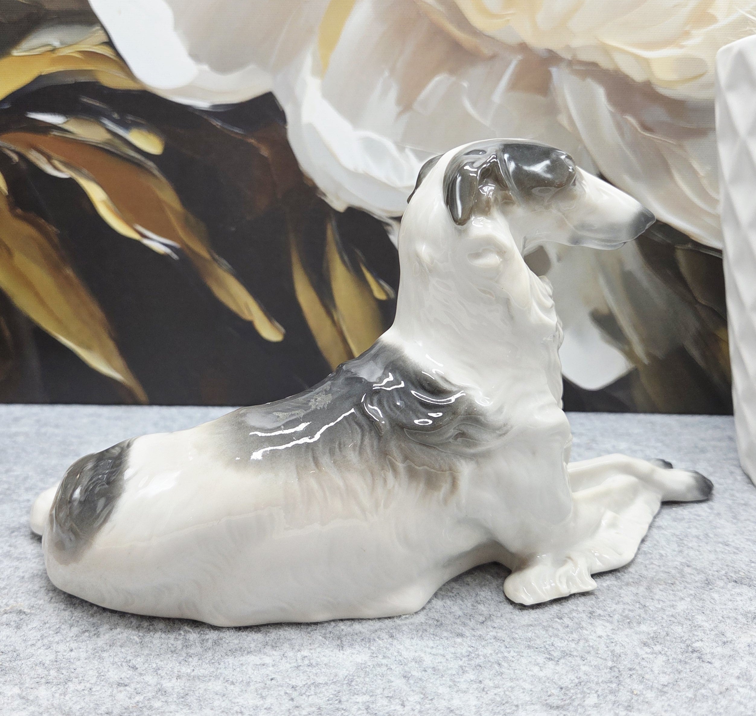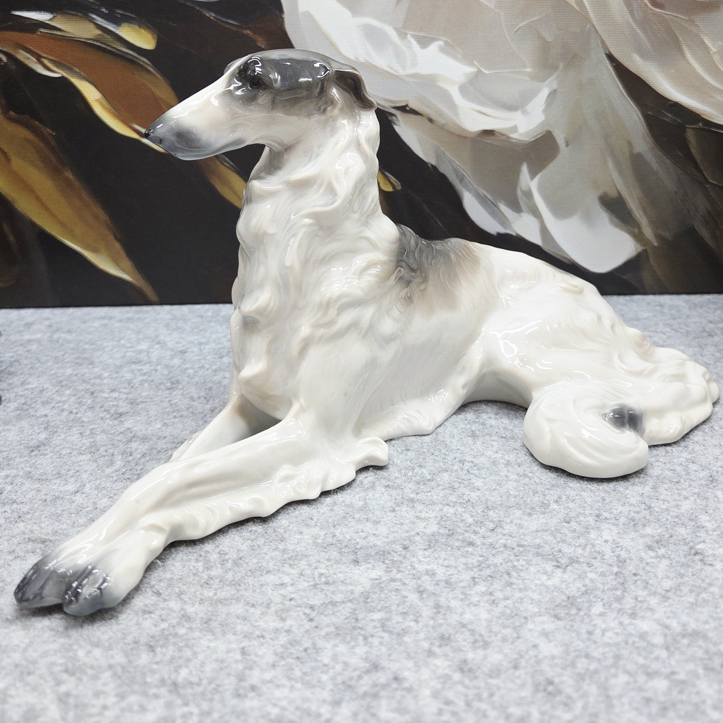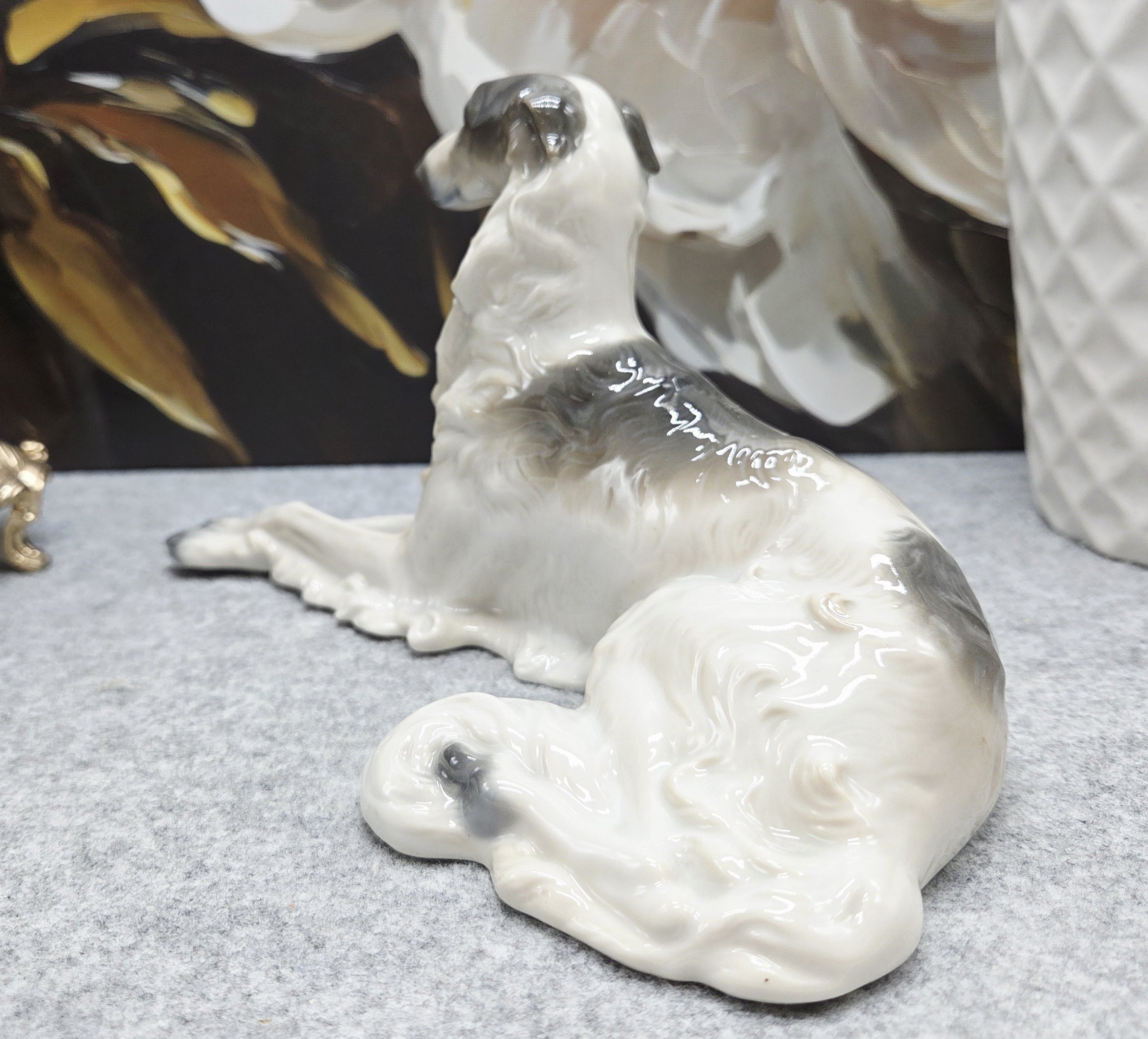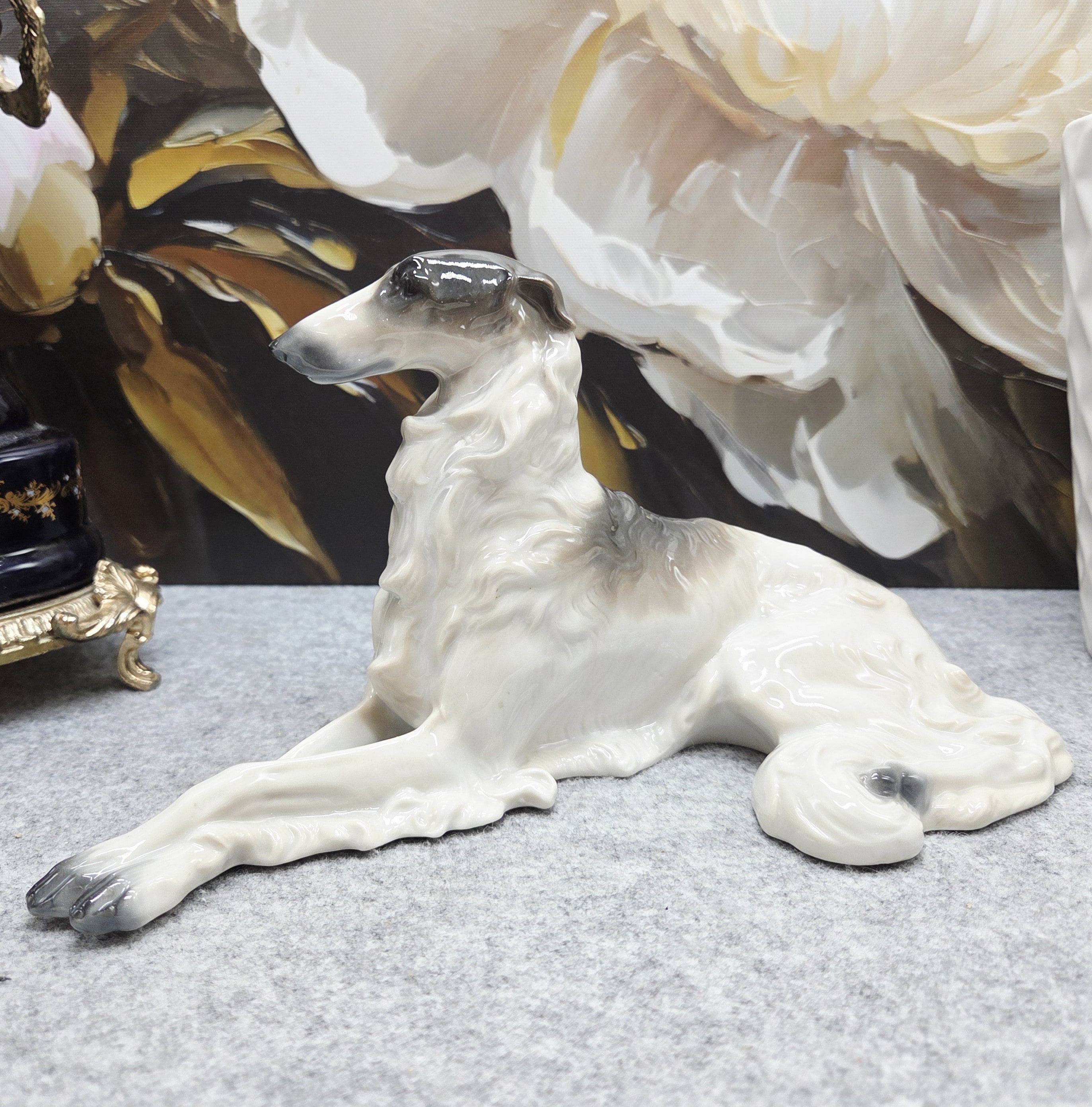 Kolekcinė Metzler & Ortloff Kunstporzellane MO porceliano figūrėlė, vaizduojanti aristokratišką rusų kurtą (Borzoi). Grakščiai ištiestos ilgos kojos, išdidžiai pakelta galva ir švelniai krintantis banguotas kailis perteikia šios veislės kilnumą bei rafinuotą charakterį. Subtilūs pilkšvi tonai ir švelnūs šešėliavimai baltame glazūruotame paviršiuje suteikia skulptūrai natūralumo bei išskirtinio plastikos pojūčio.