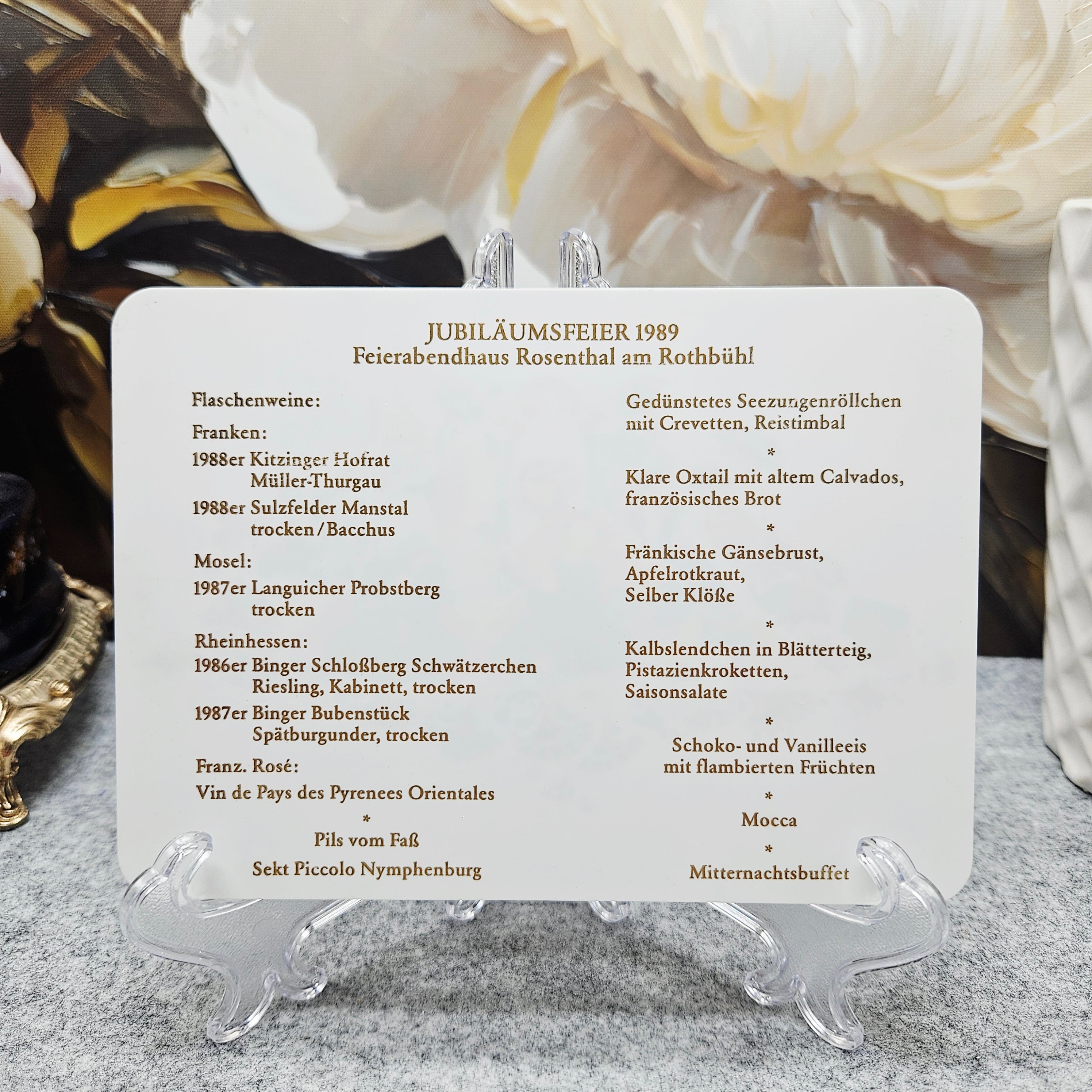 Kitoje atvirutės pusėje yra meniu iš 1989 m. vykusios „Feierabendhaus Rosenthal am Rothbühl“ jubiliejaus šventės. Tai ne tik dekoratyvinė kortelė, bet ir subtilus „Rosenthal“ istorijos liudininkas – primenantis šventę, kai porcelianas, menas ir gastronomija buvo jungiami į vieną rafinuotą visumą.