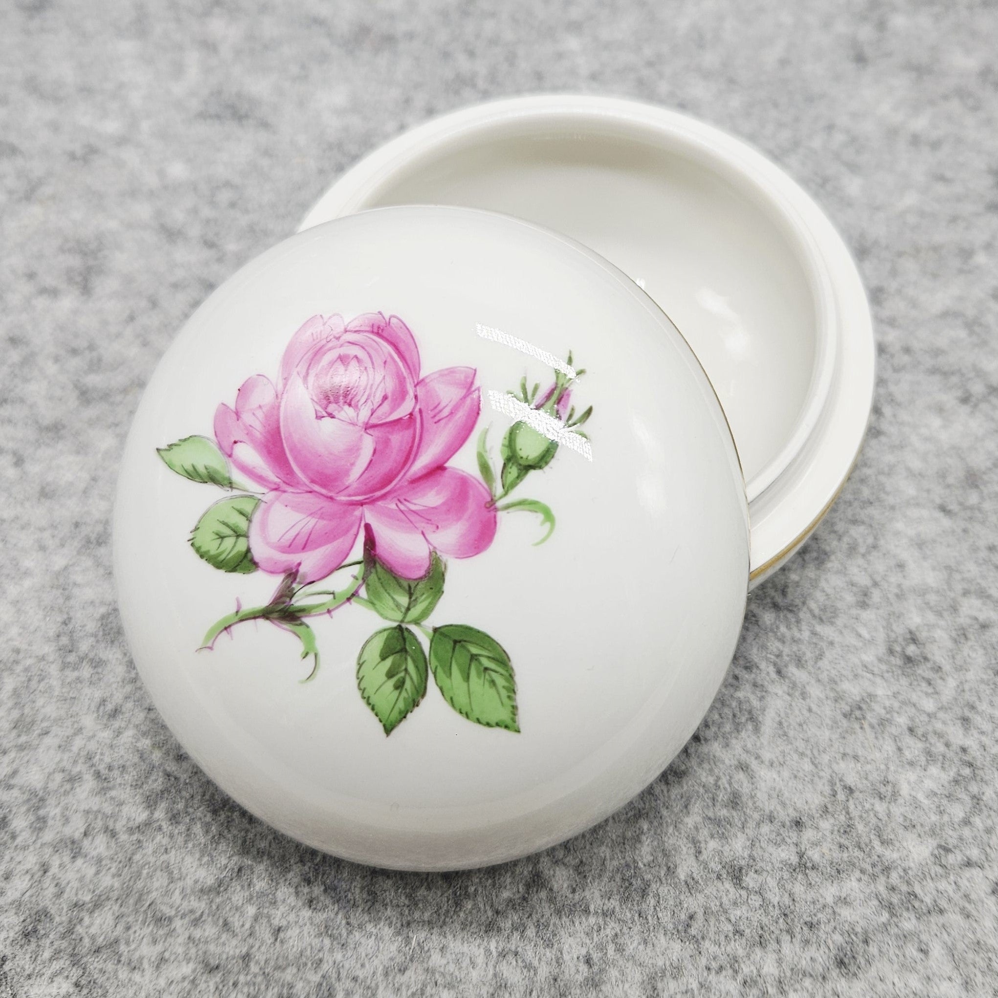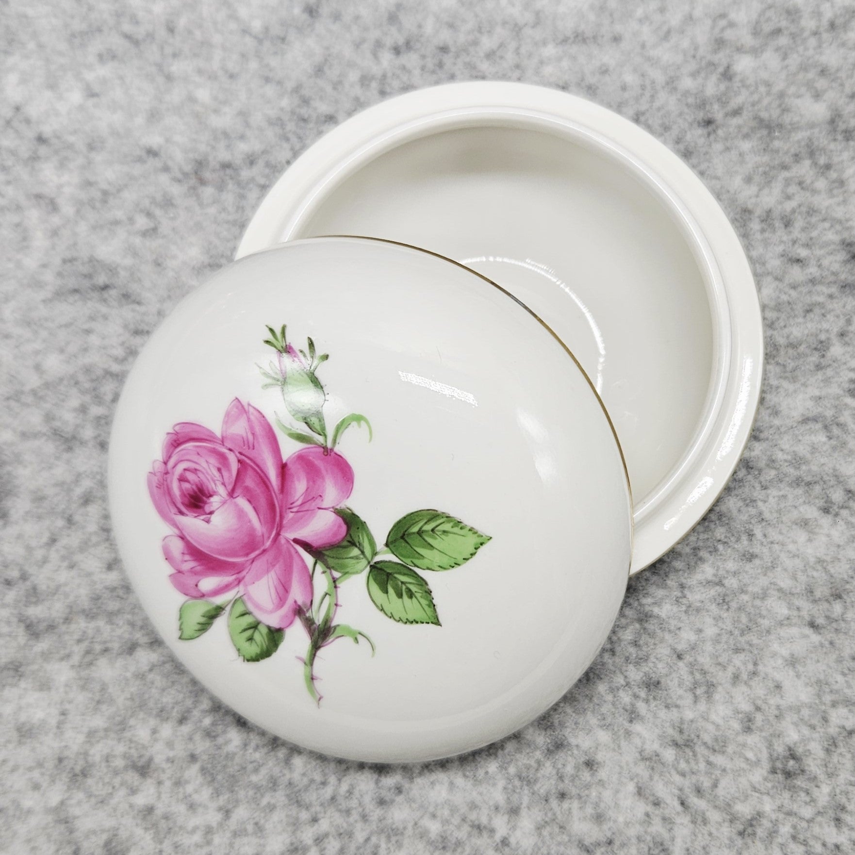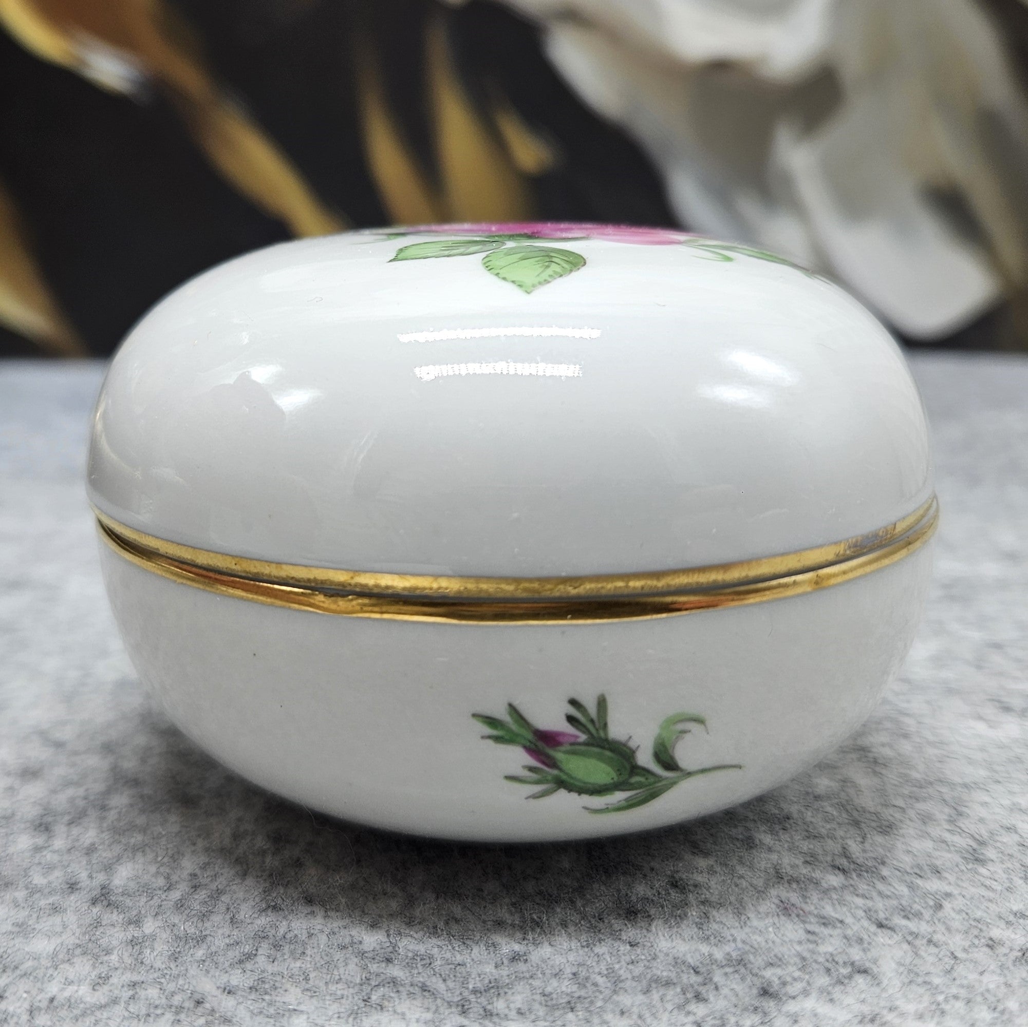 kolekcinė „Meissen“ balto porceliano dėžutė su dangteliu, dekoruota rankomis piešta rože ir aukso linijomis ties dėžutės ir dangtelio kraštais. Ant sienelių taip pat išpiešti du rožių pumpurai.