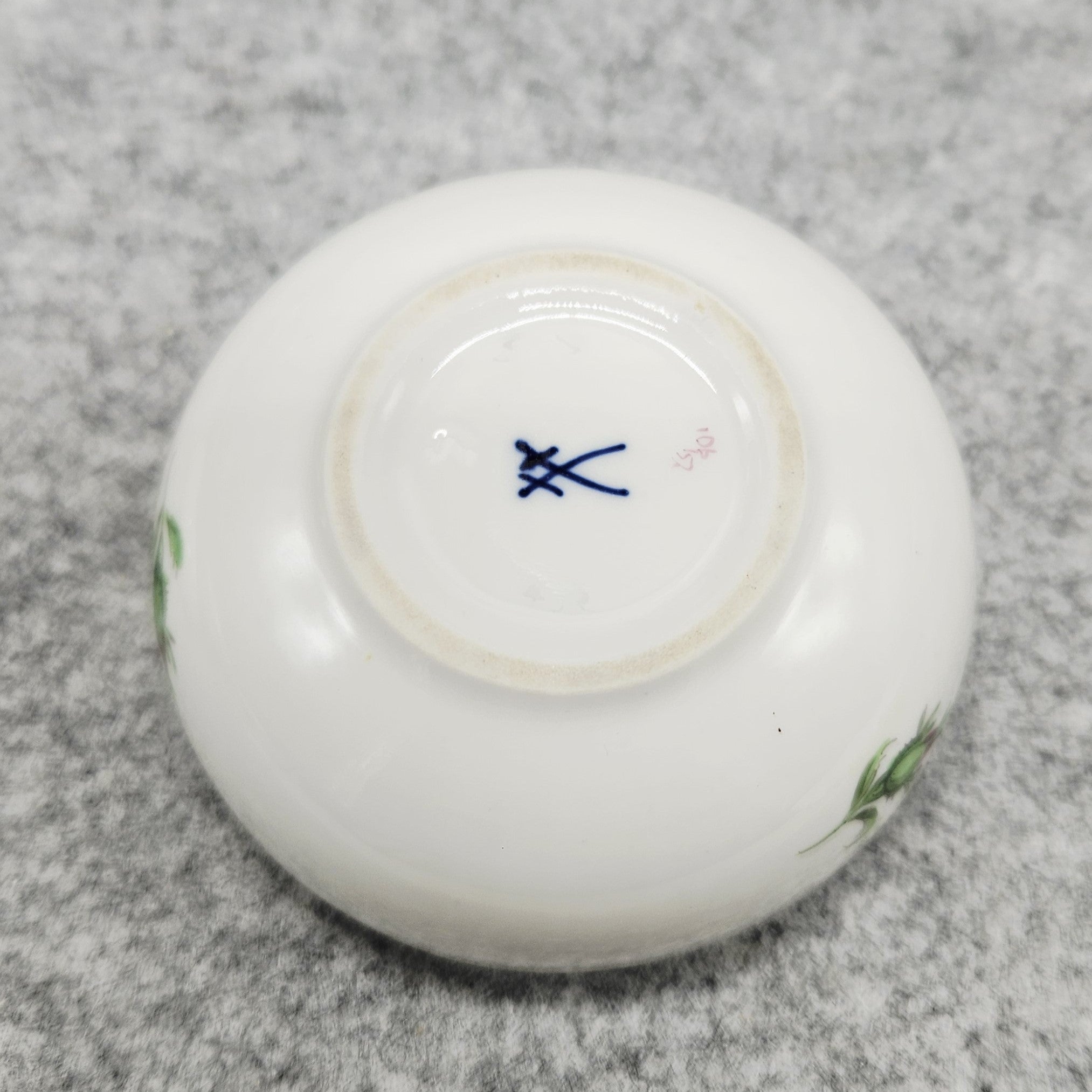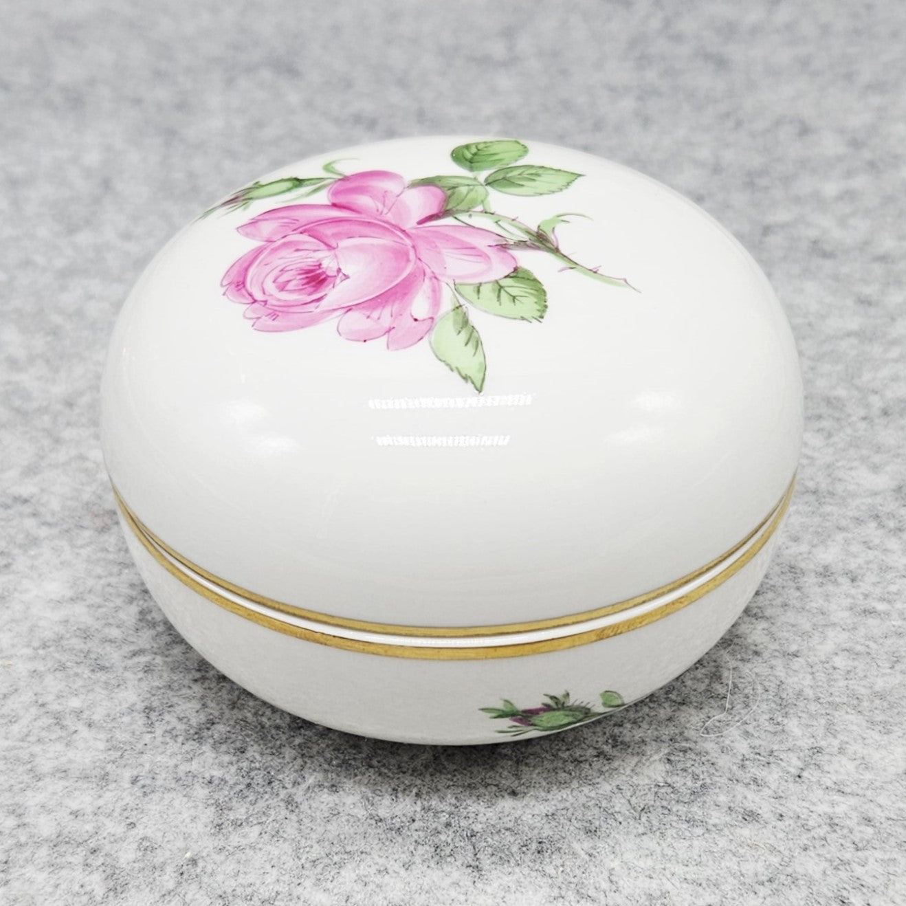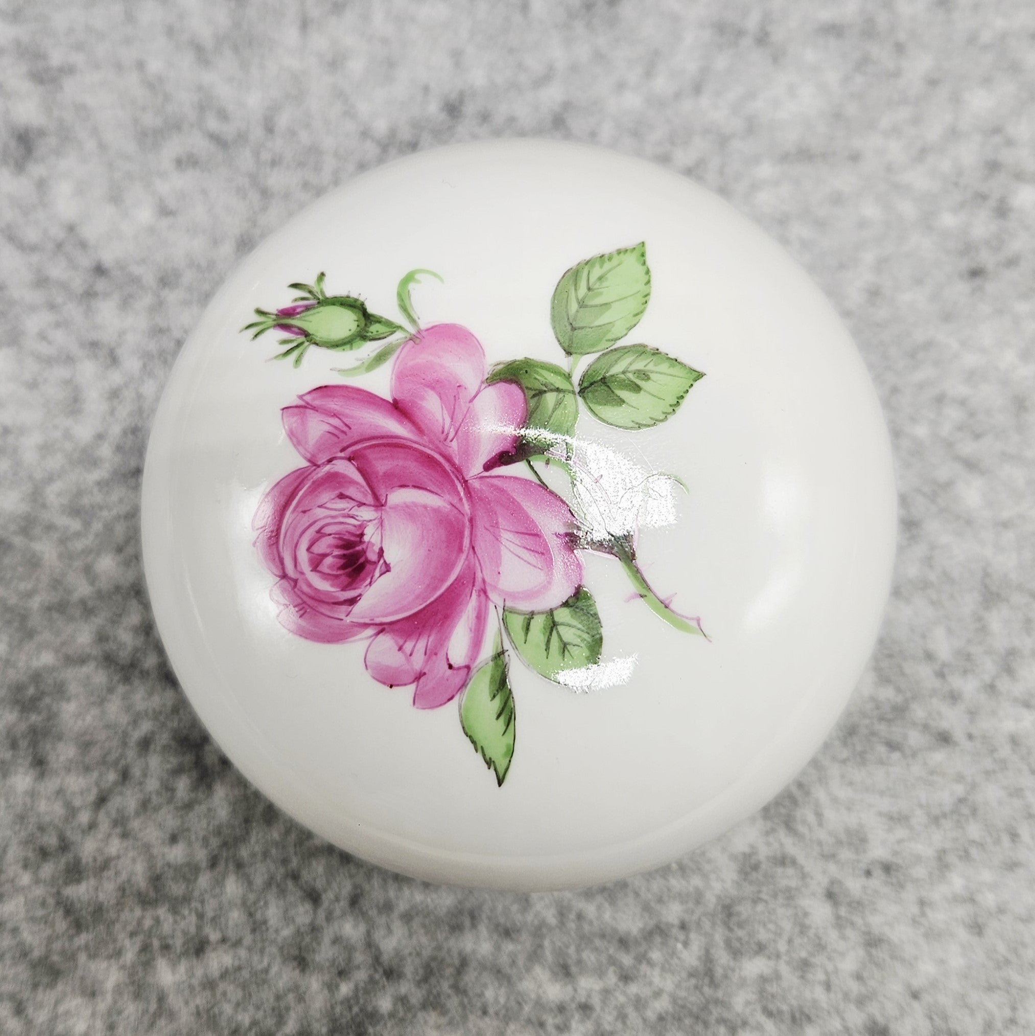 kolekcinė „Meissen“ balto porceliano dėžutė su dangteliu, dekoruota rankomis piešta rože ir aukso linijomis ties dėžutės ir dangtelio kraštais. Ant sienelių taip pat išpiešti du rožių pumpurai.