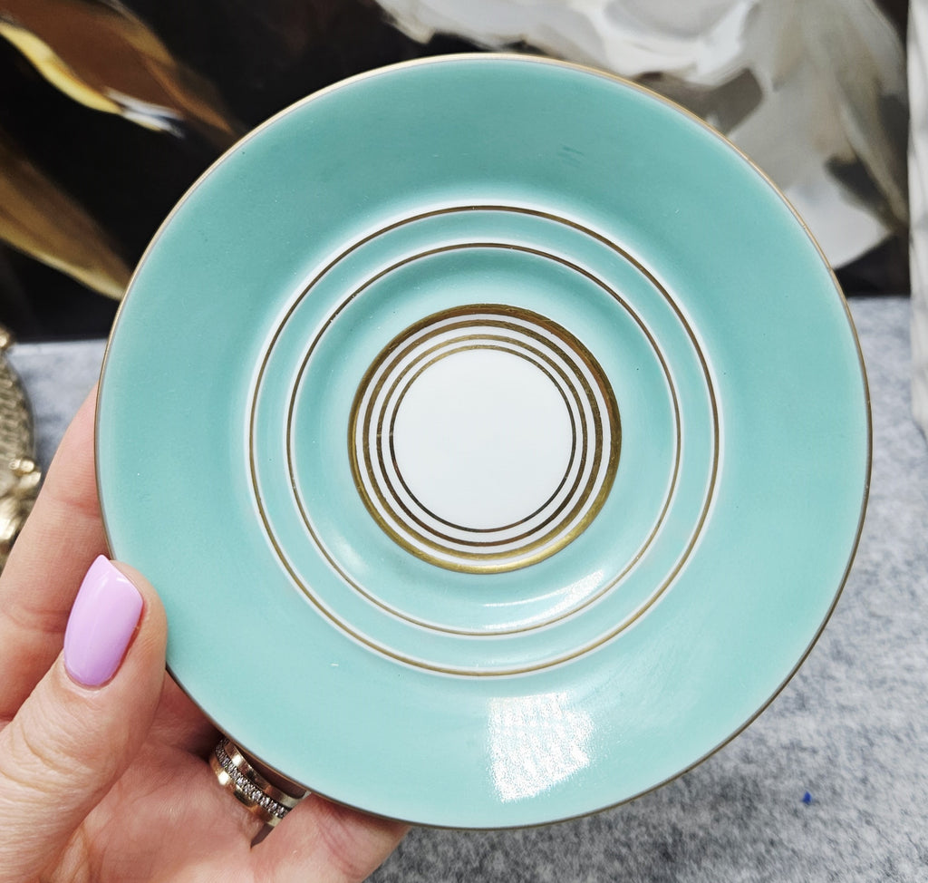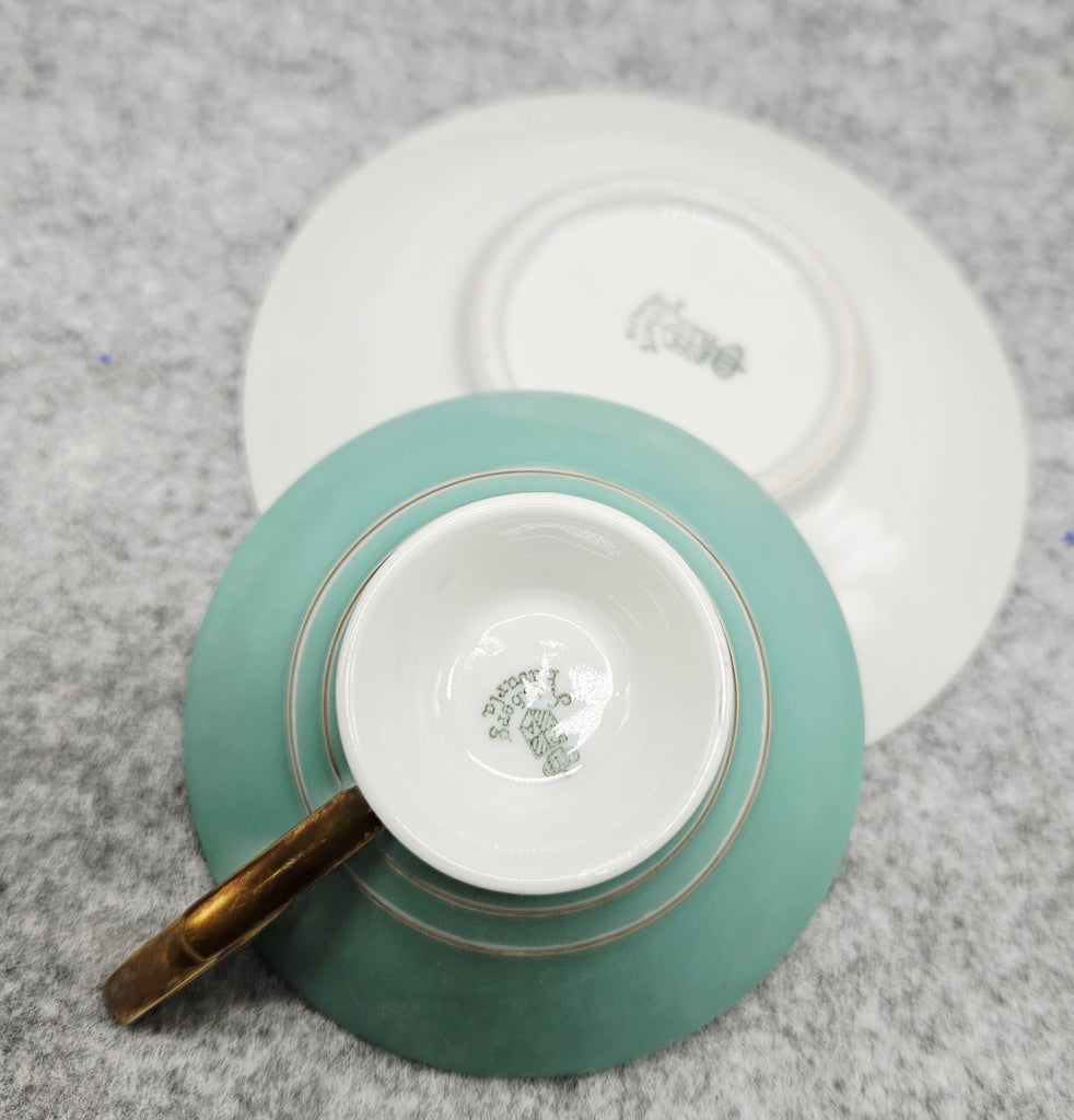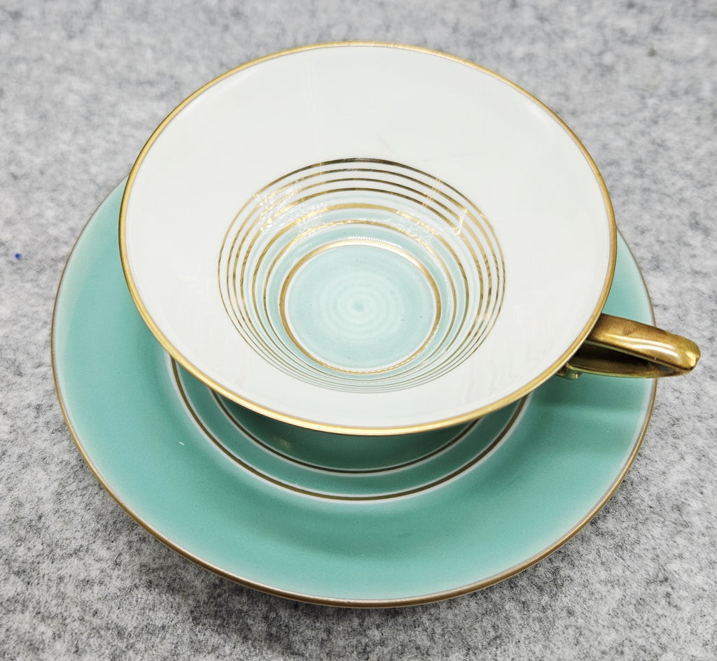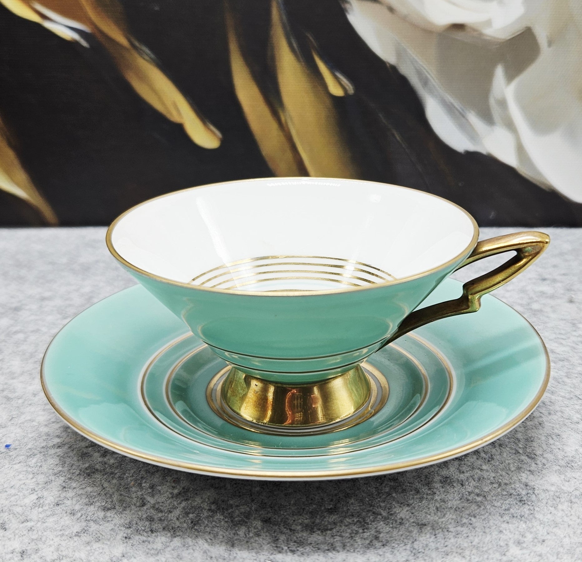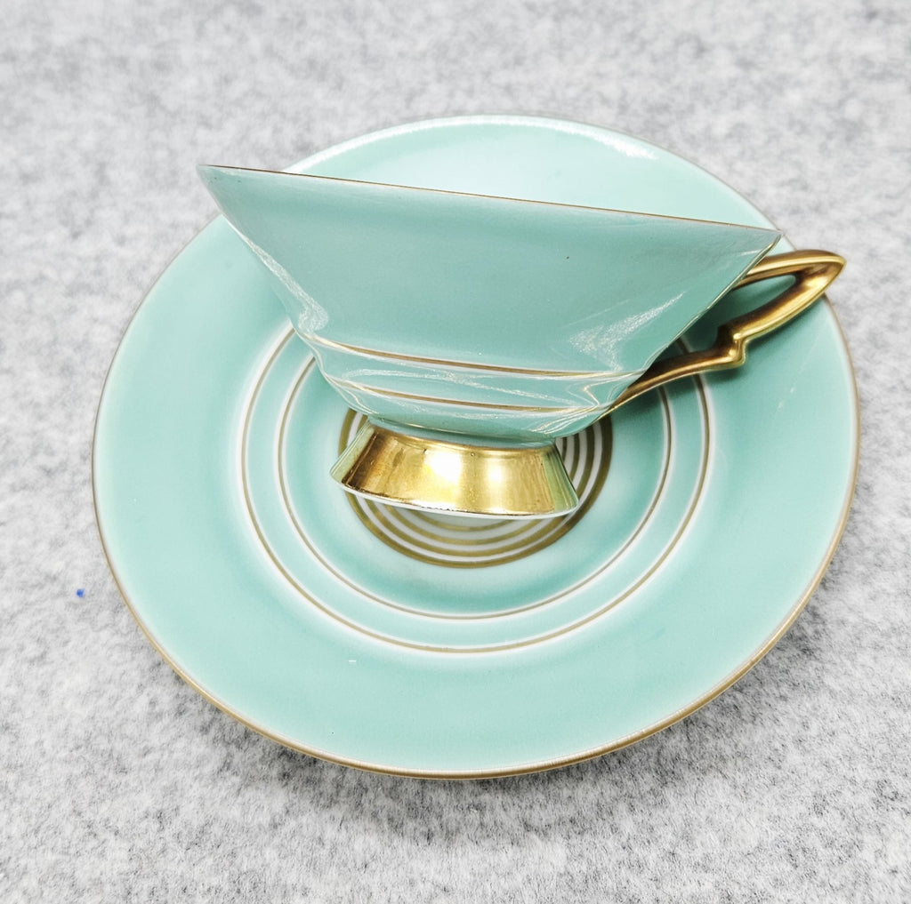 Išskirtinis, elegantiškas "Arzberg Bavaria" porceliano kavos puodelio ir lėkštutės komplektas su subtilia mėtinės / turkio glazūros spalva ir prabangiais 24K aukso dekoratyviniais žiedais. Moderni, grakšti forma ant aukso pagrindo sukuria išskirtinį vizualinį lengvumą ir rafinuotą, prabangų charakterį.