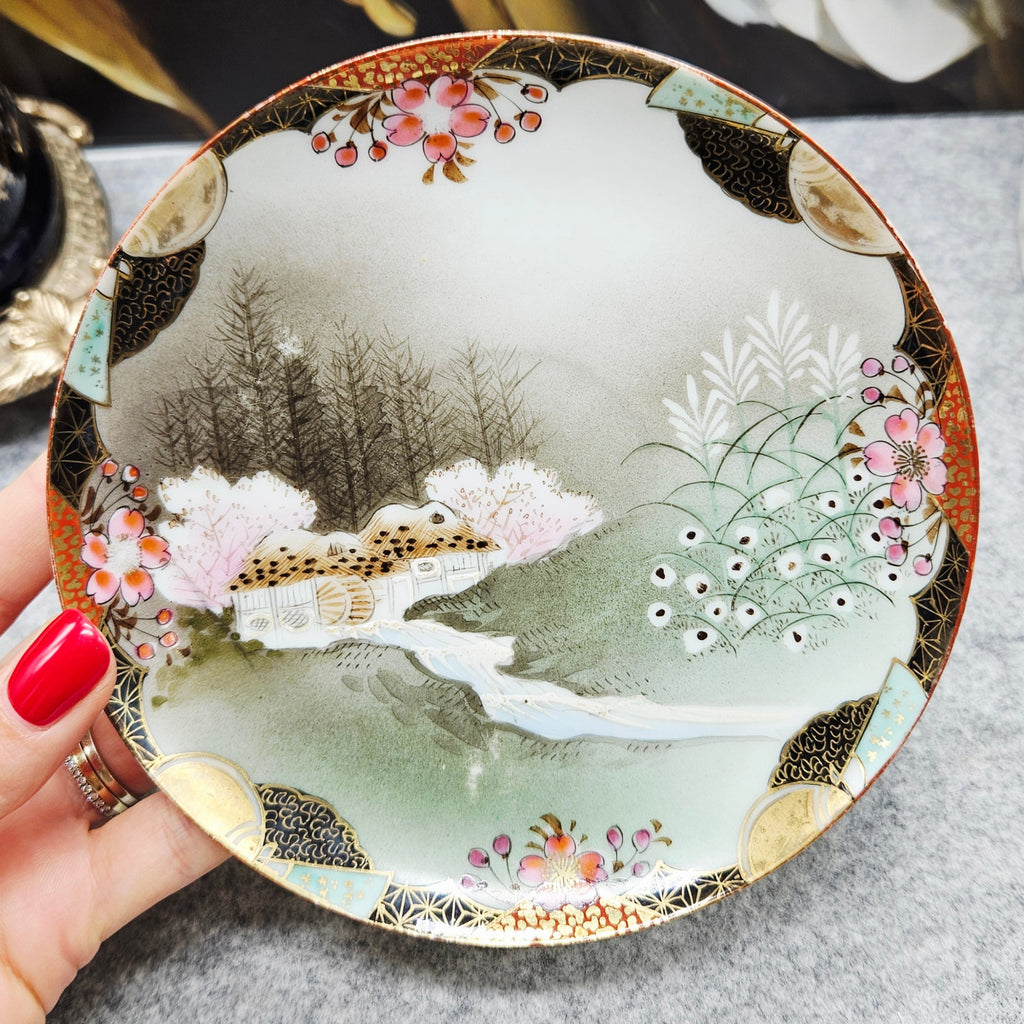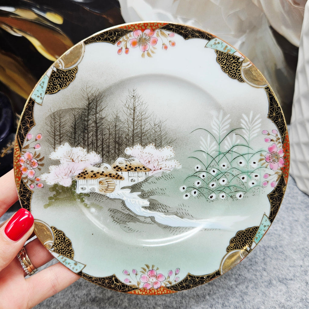 Dekoruotas subtiliu rankų darbo japoniniu peizažu: upelis, nameliai, žydintys vyšnių medžiai ir kalnų peizažas. Pasteliniai žalsvai pilki atspalviai derinami su rožiniais žiedais ir aukso akcentais.