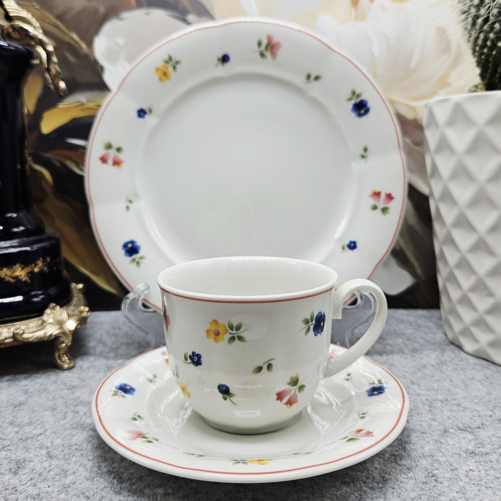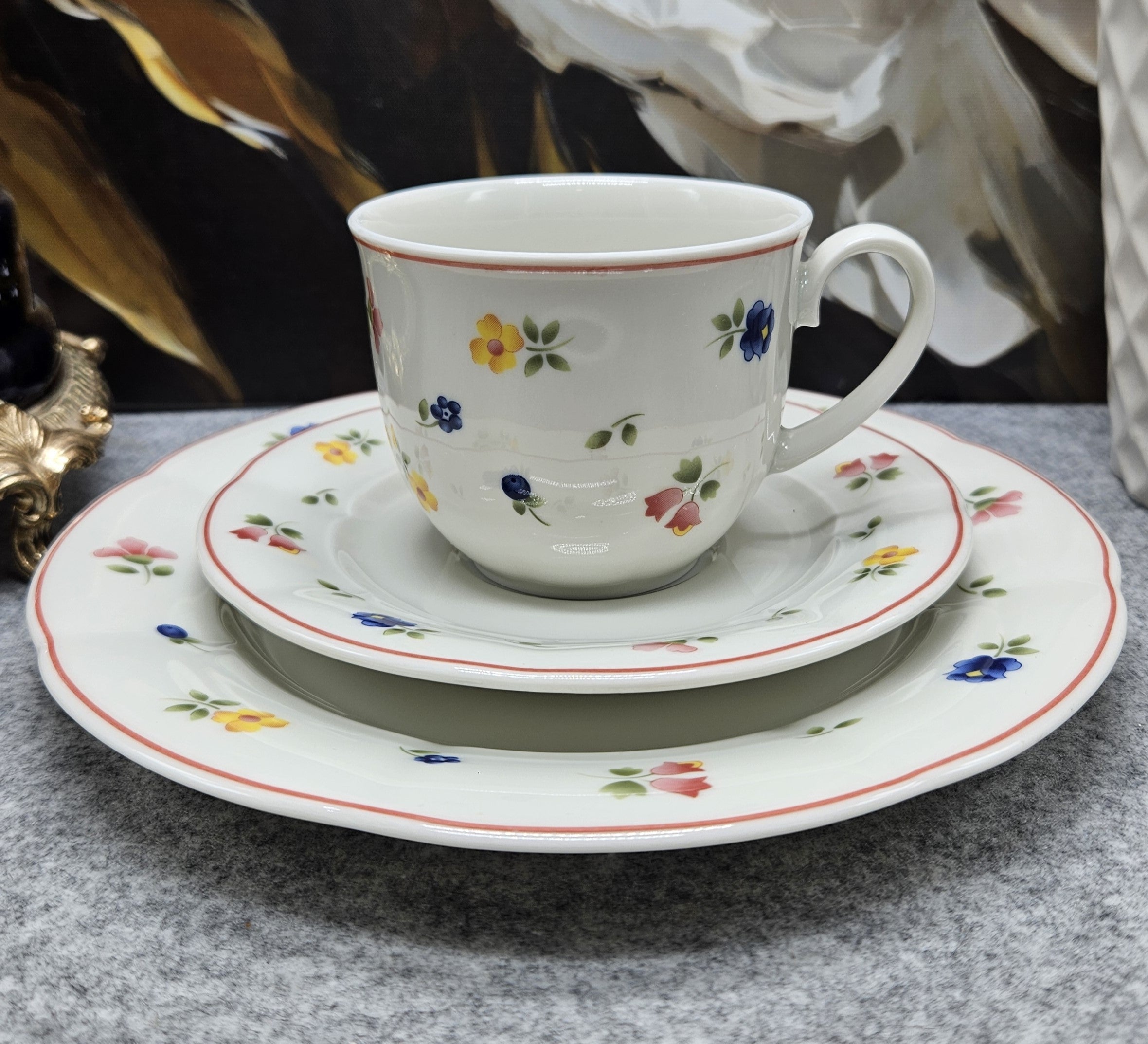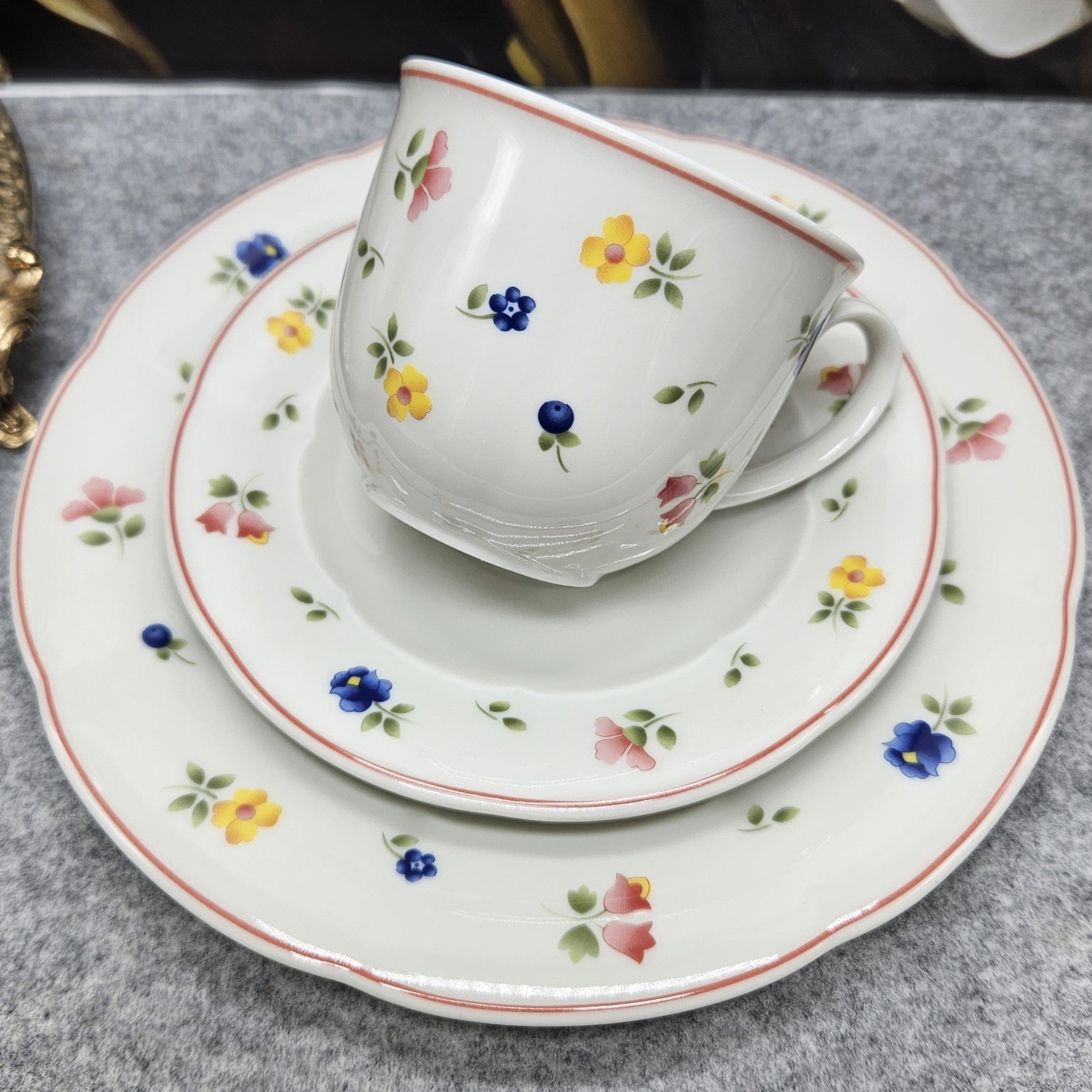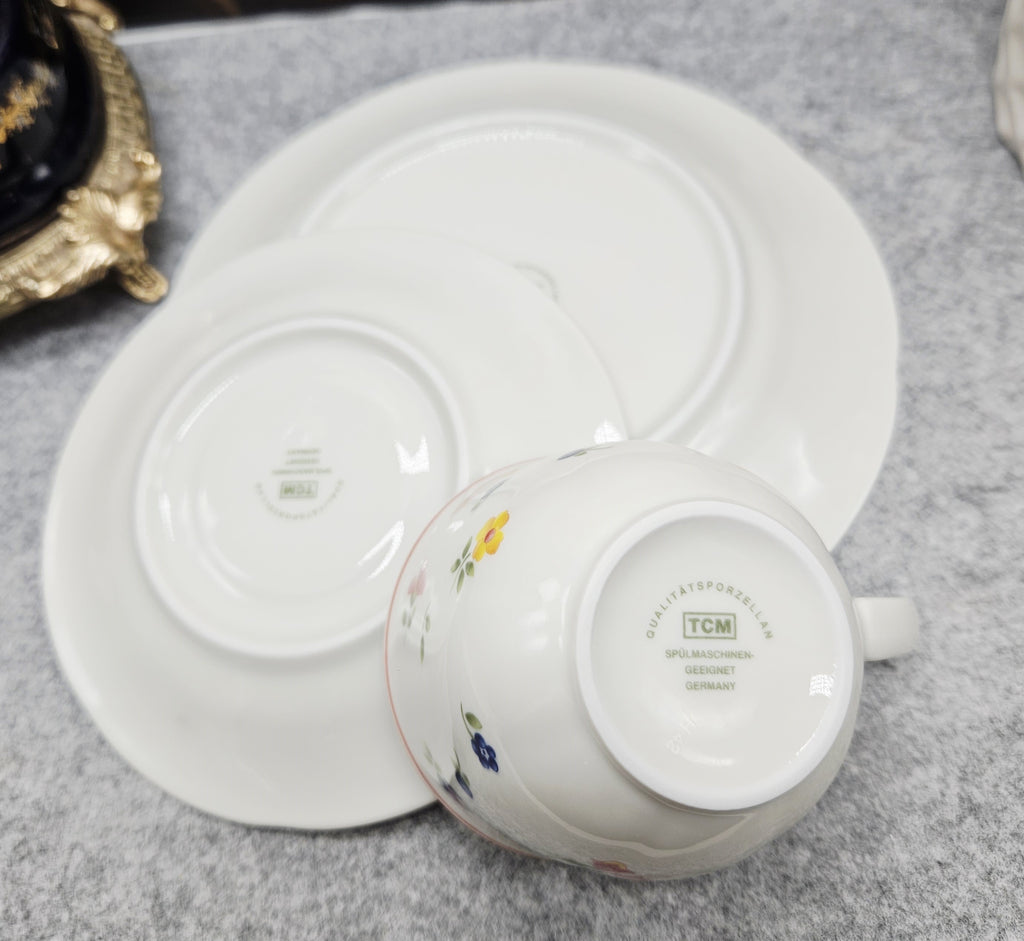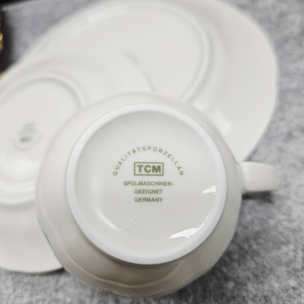 Vokiškas porceliano kavos servizas „TCM Qualitätsporzellan Germany“. Rinkinį sudaro puodelis, lėkštutė ir desertinė lėkštė. Indai dekoruoti spalvotais gėlių motyvais ir subtiliu rausvu krašteliu.