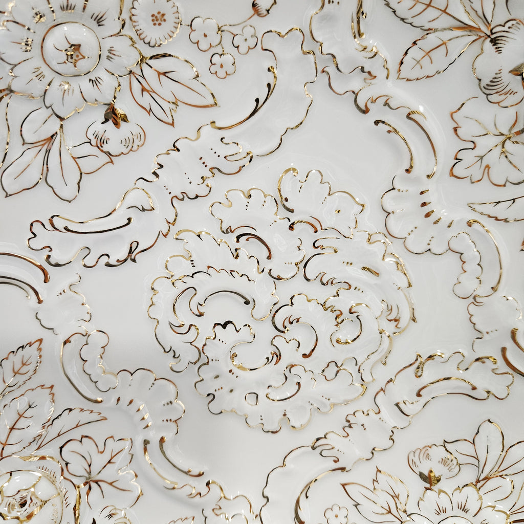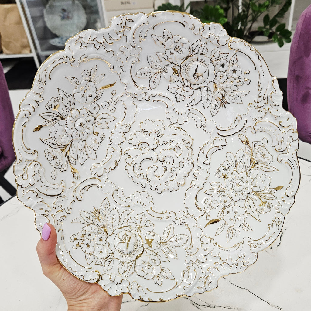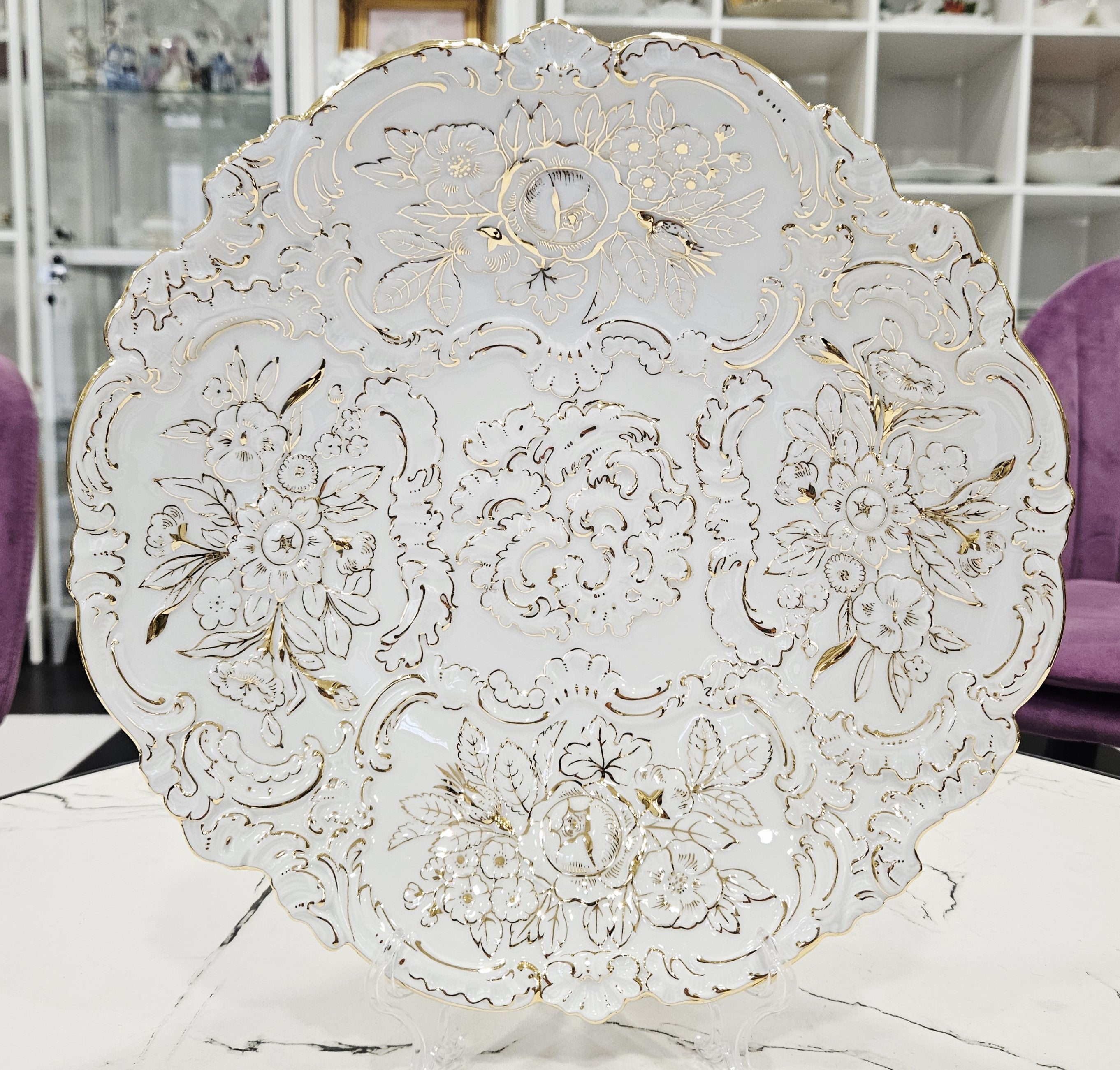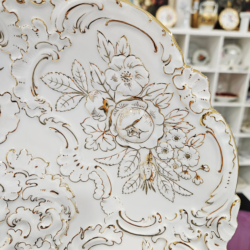 Įspūdinga, elegantiška Meissen porceliano lėkštė su išraiškingu reljefiniu kraštu bei subtilia aukso piešinio puošyba. Kompozicijoje dominuoja rankomis dekoruotos gėlių kompozicijos – plonos, grafiškos linijos ir auksavimo akcentai sukuria itin prabangų, rafinuotą klasikinių Meissen dekorų įvaizdį. Net ir smulkiausios detalės išdirbtos itin preciziškai – tai puikus meistrystės, istorinės estetikos ir aukščiausios porceliano kokybės pavyzdys.