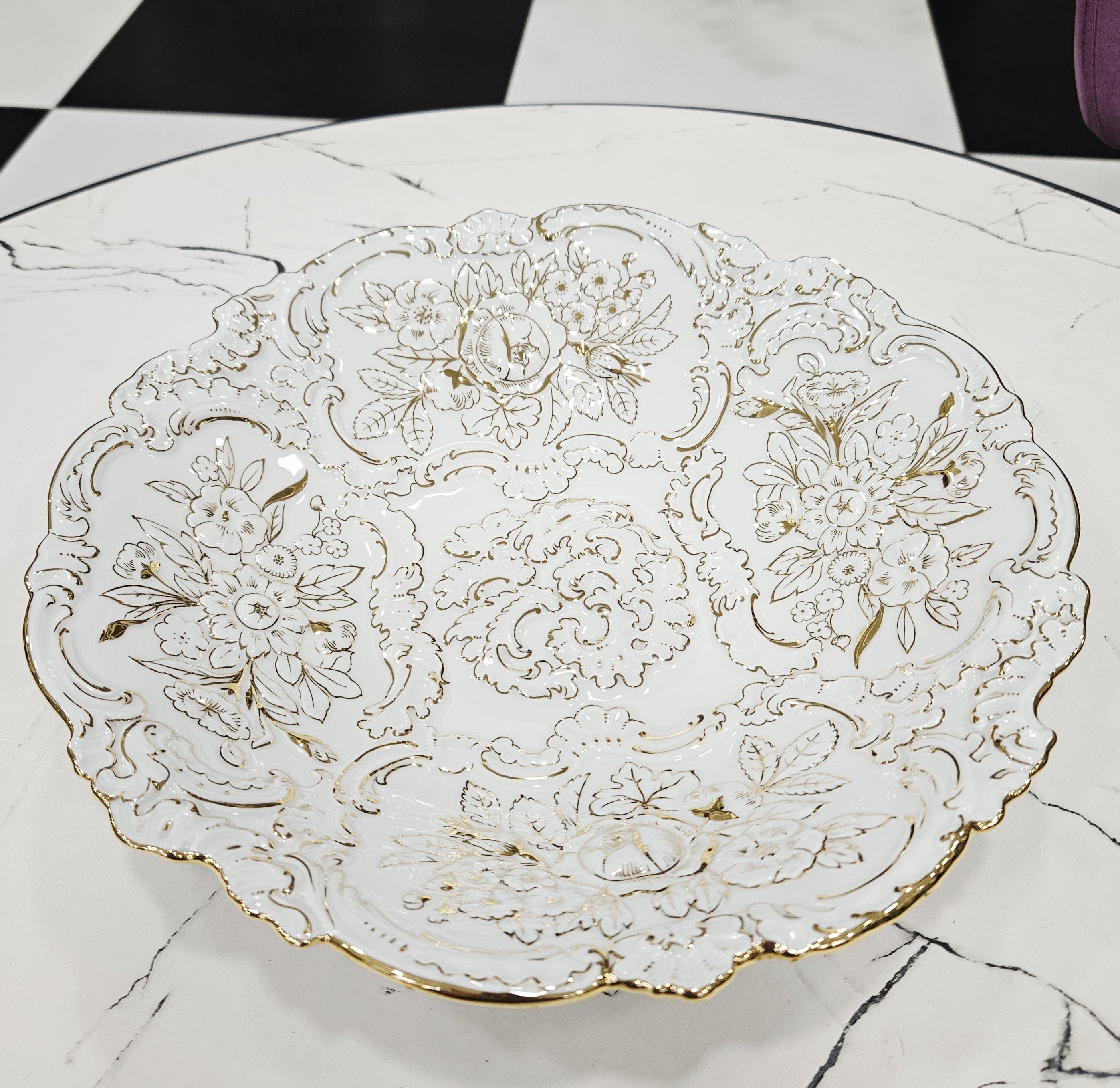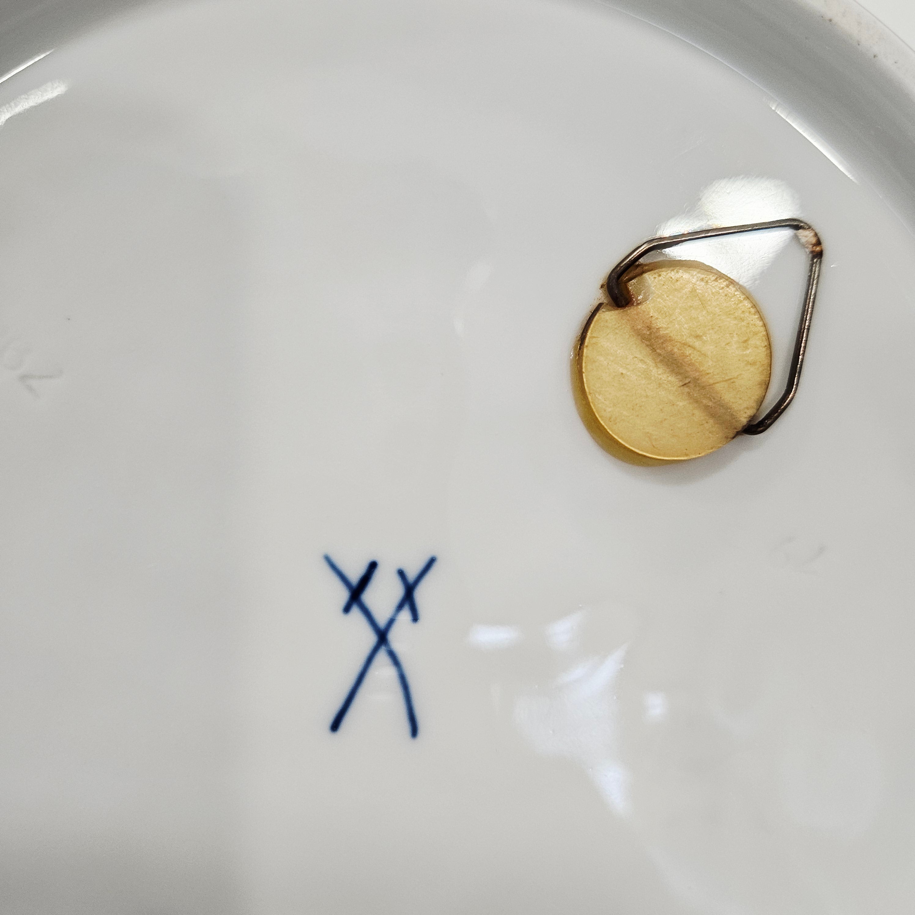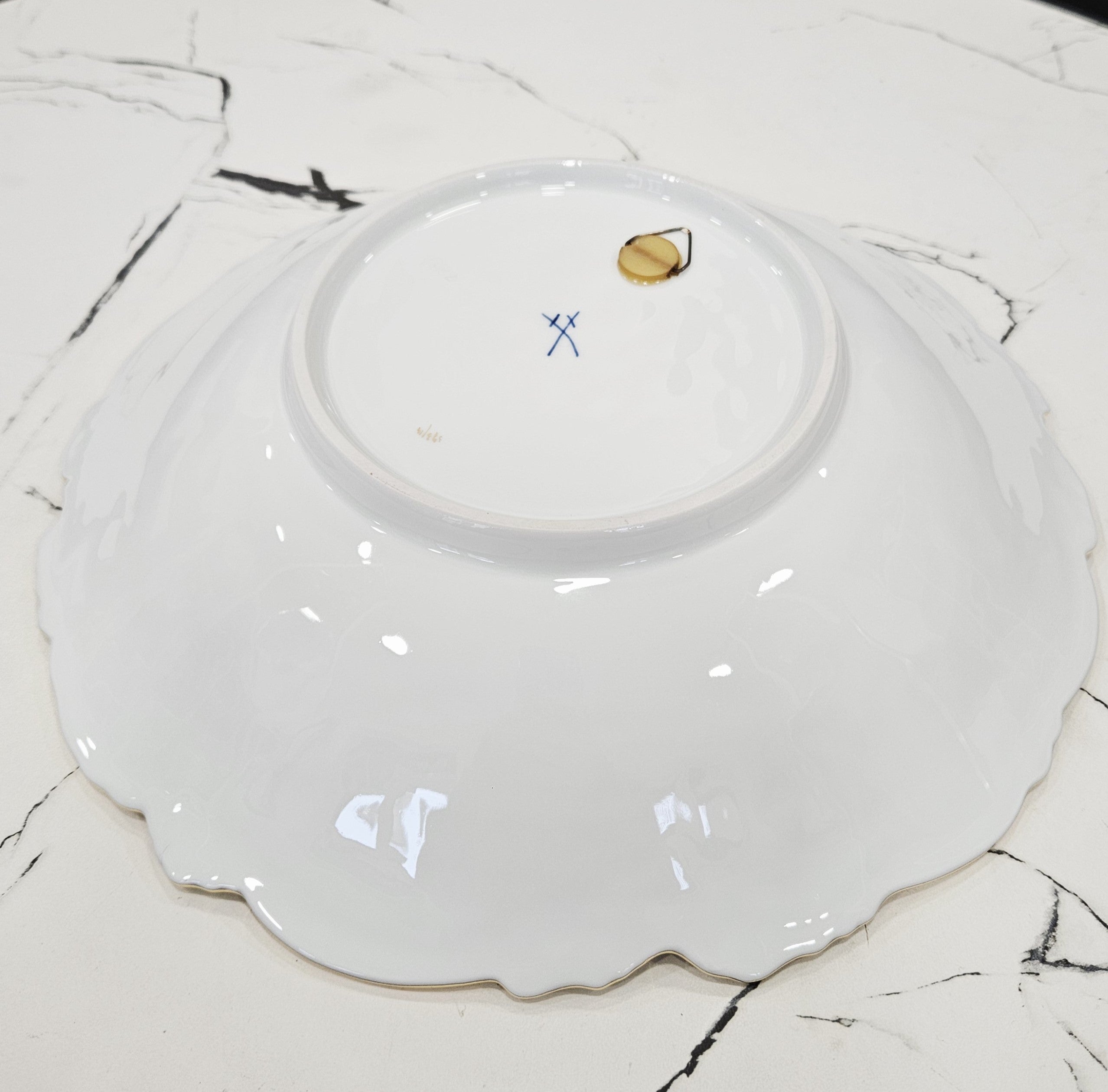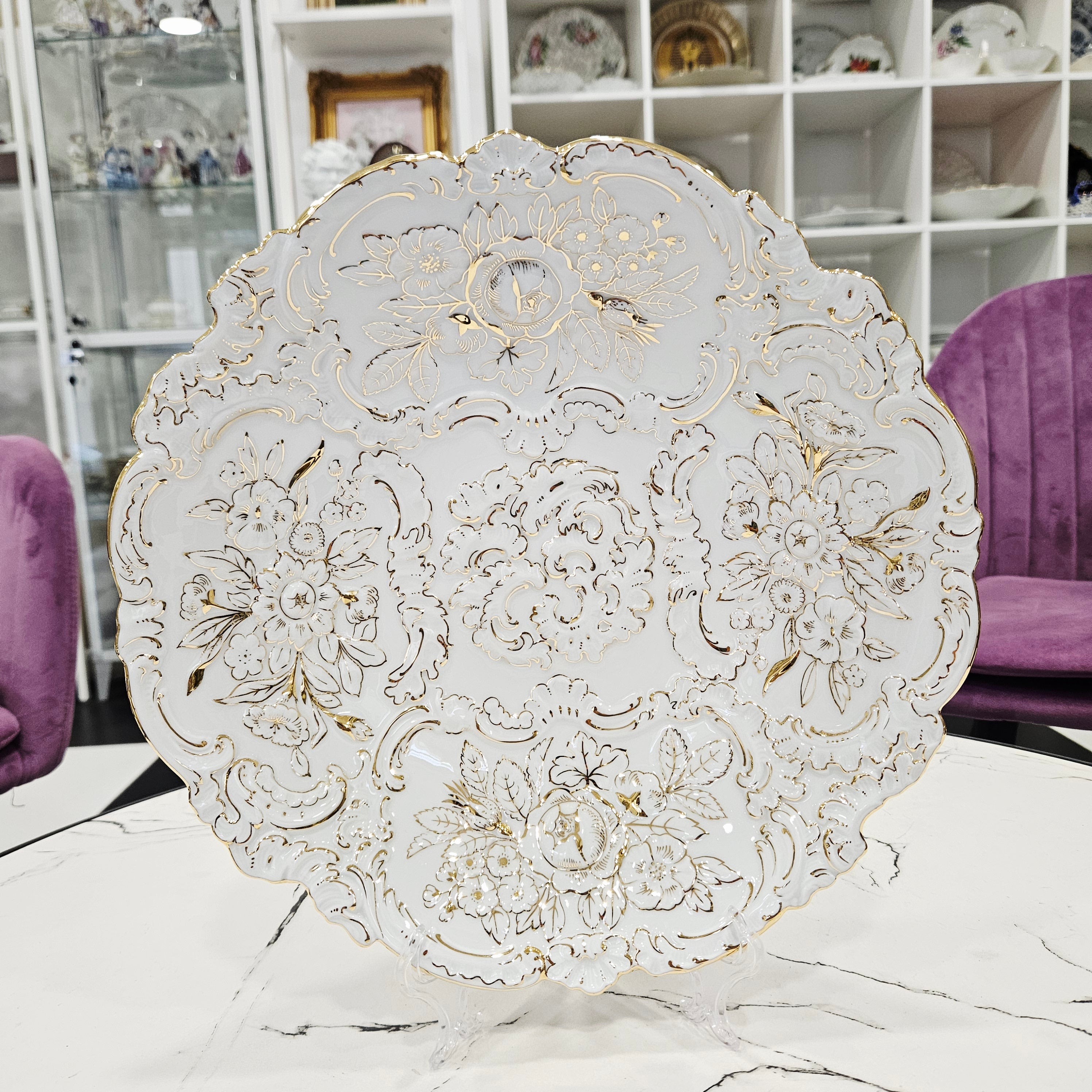 Įspūdinga, elegantiška Meissen porceliano lėkštė su išraiškingu reljefiniu kraštu bei subtilia aukso piešinio puošyba. Kompozicijoje dominuoja rankomis dekoruotos gėlių kompozicijos – plonos, grafiškos linijos ir auksavimo akcentai sukuria itin prabangų, rafinuotą klasikinių Meissen dekorų įvaizdį. Net ir smulkiausios detalės išdirbtos itin preciziškai – tai puikus meistrystės, istorinės estetikos ir aukščiausios porceliano kokybės pavyzdys.