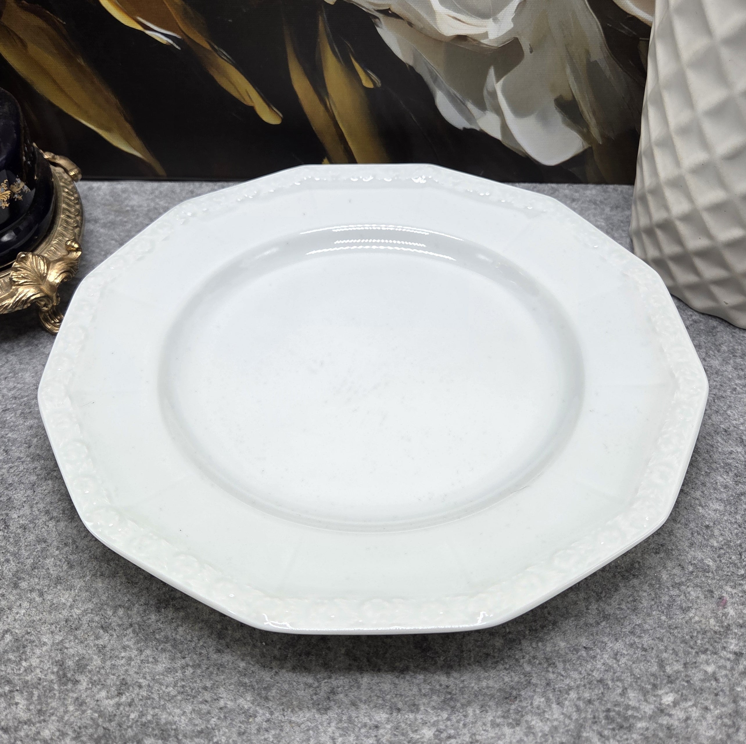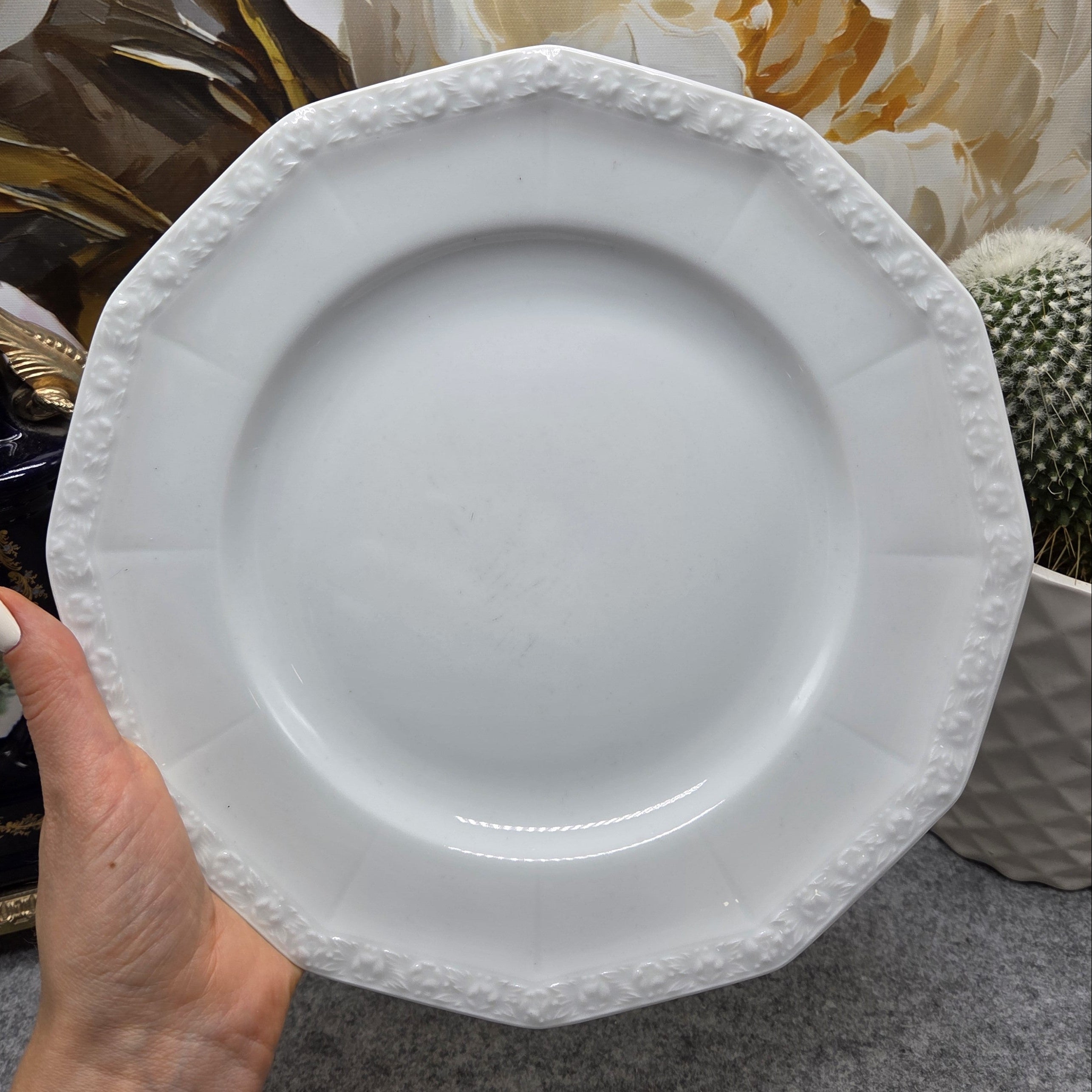 Elegantiška, aukštos kokybės Rosenthal Classic Germany porceliano pietų lėkštė – minimalistinio, bet rafinuoto dizaino. Lėkštės aštuonkampės formos, puoštos subtiliu reljefiniu gėlių ornamentu kraštuose, kuris išryškėja balto porceliano fone.